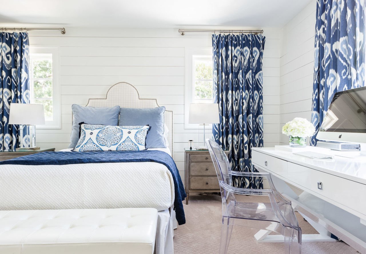 Синие шторы в светлой спальне
