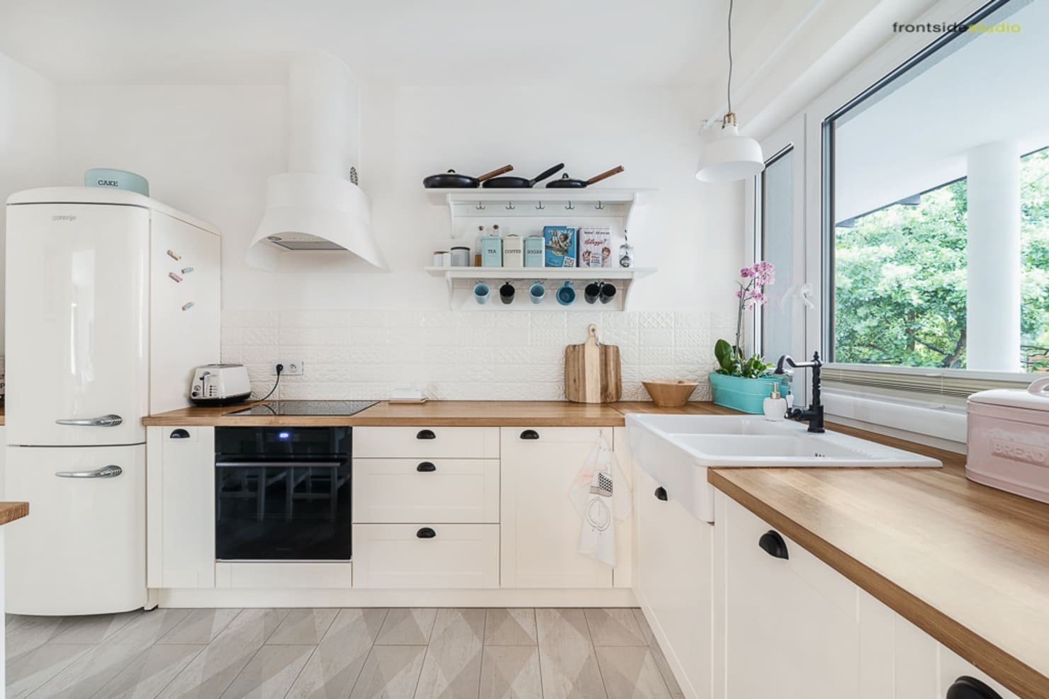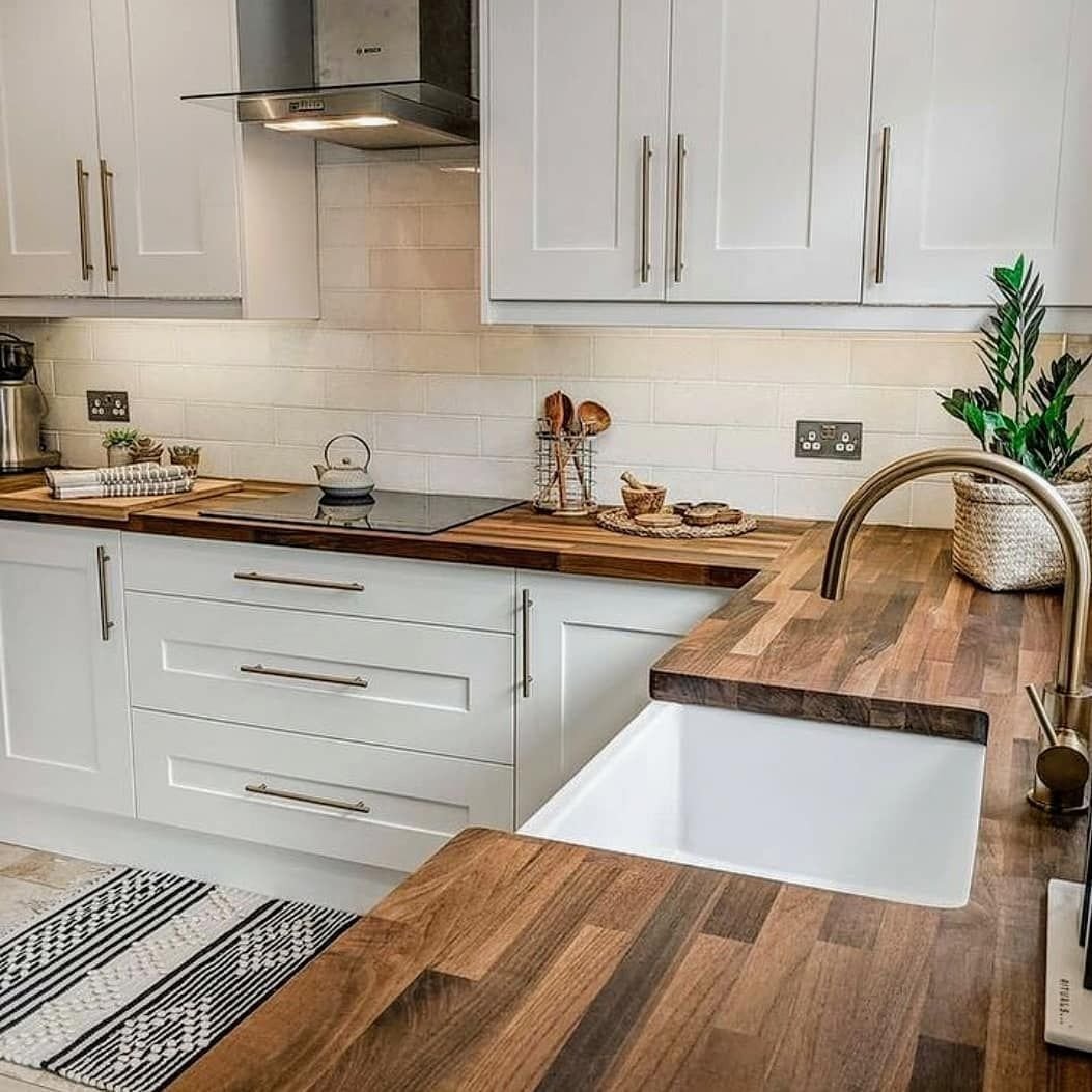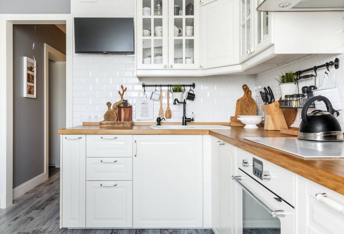 Белая кухня с деревянной столешницей в скандинавском стиле