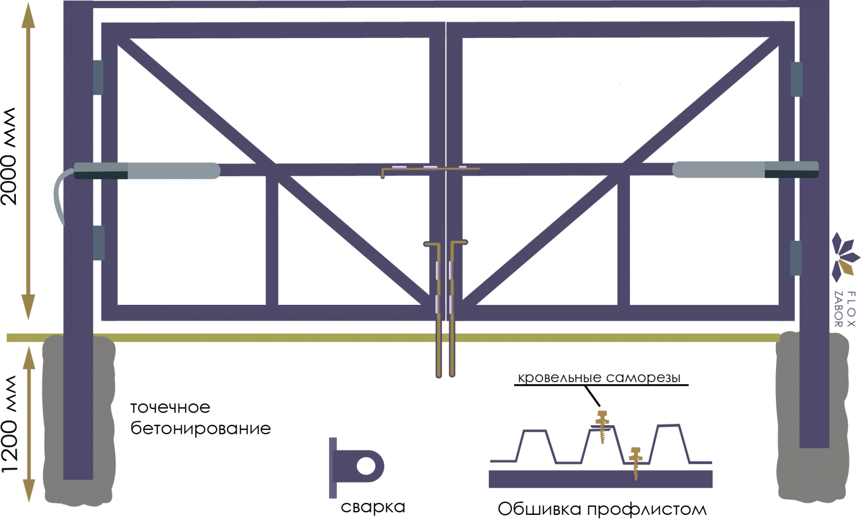 Ворота распашные 4 метра из профильной трубы и профлиста чертеж