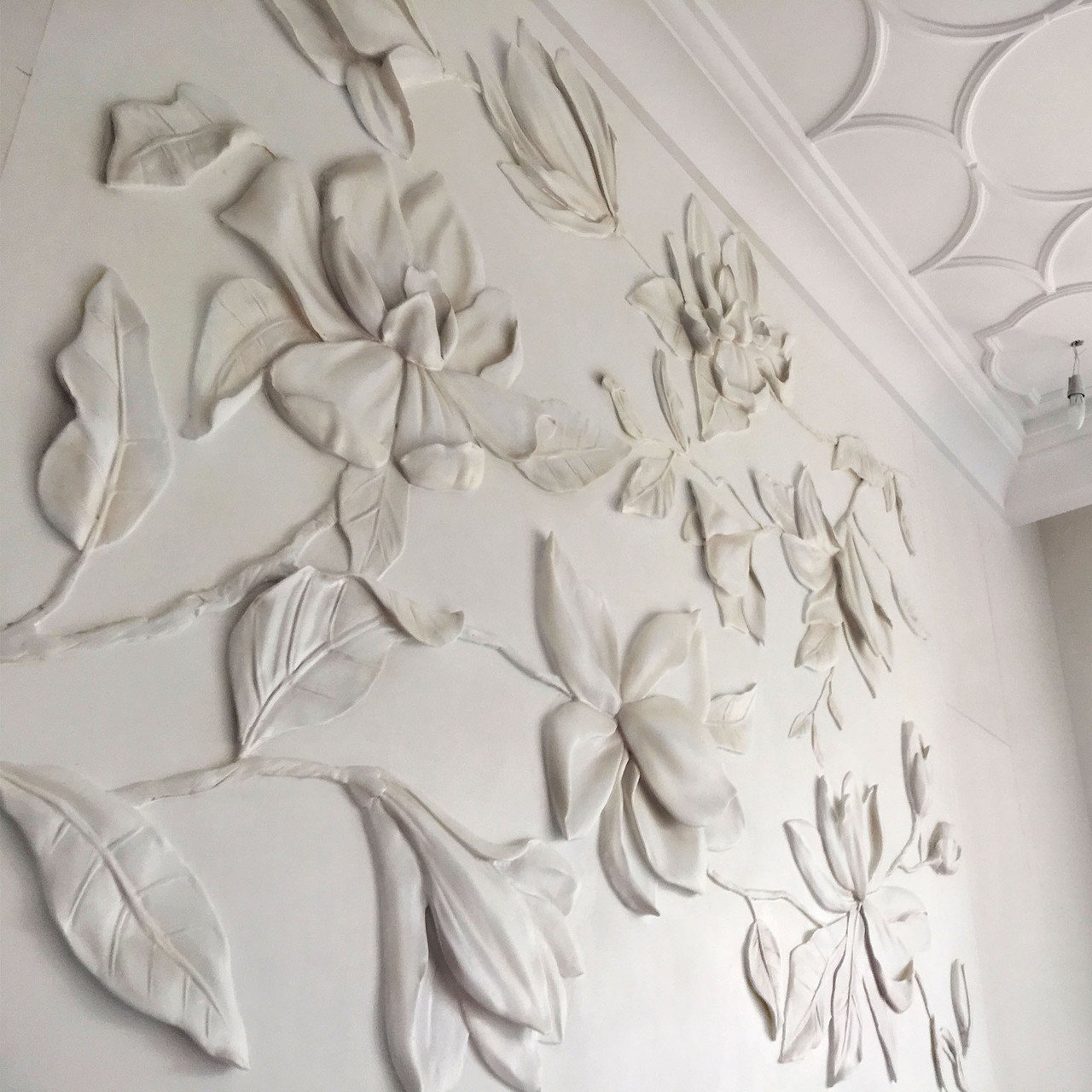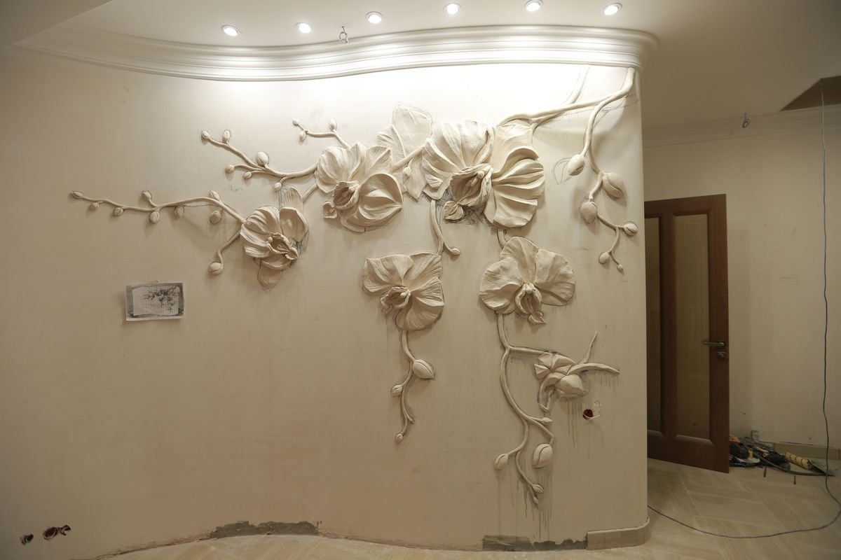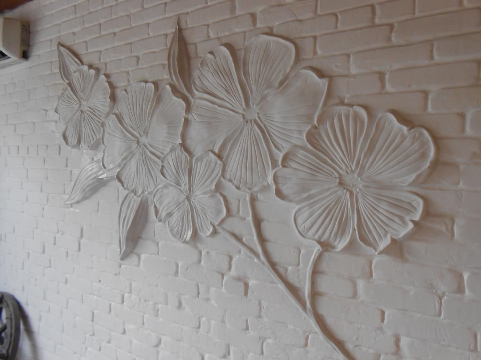 Цветы из гипса на стене в интерьере