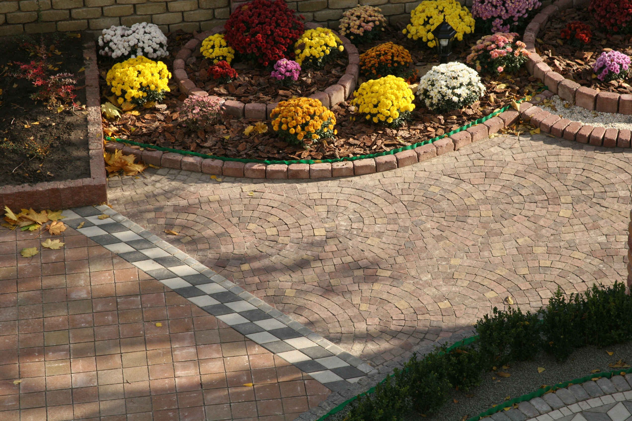 Двор из тротуарной плитки с клумбами