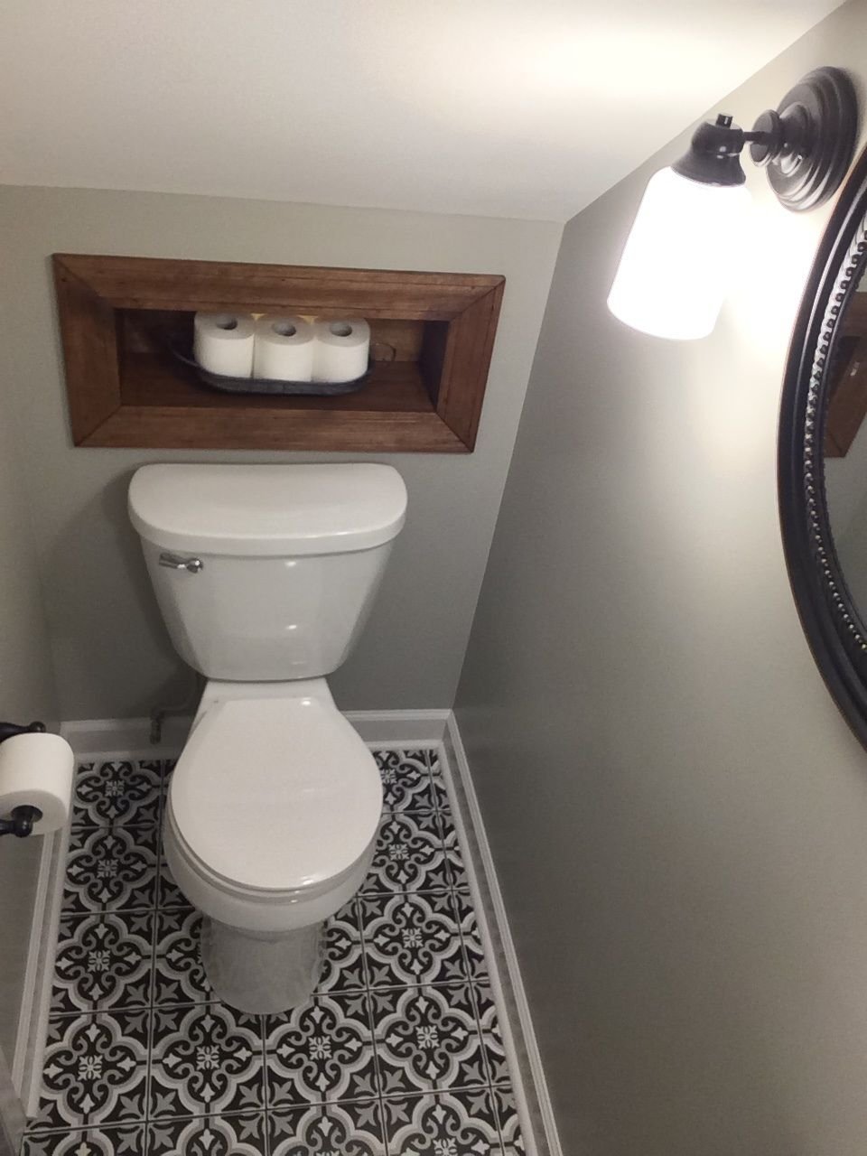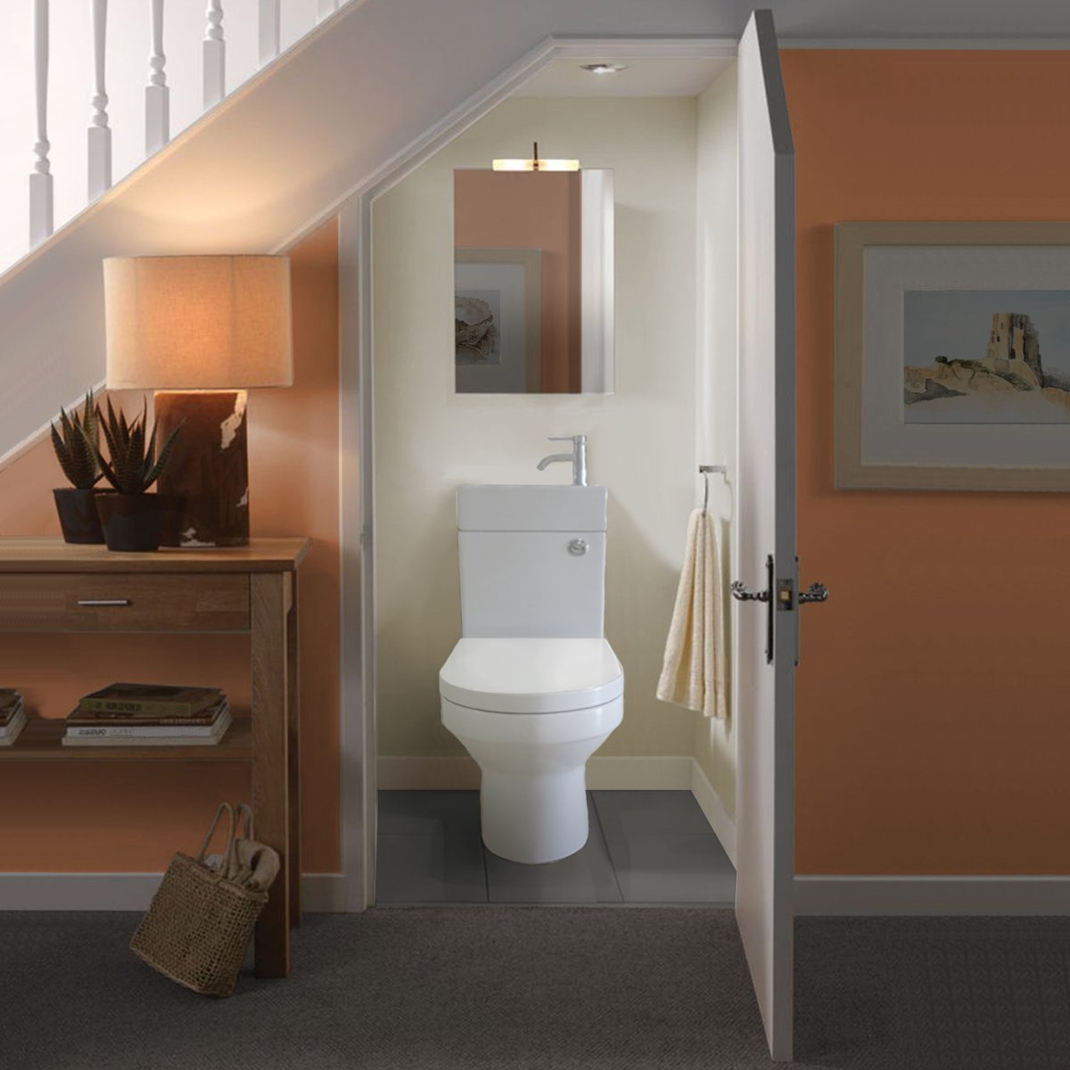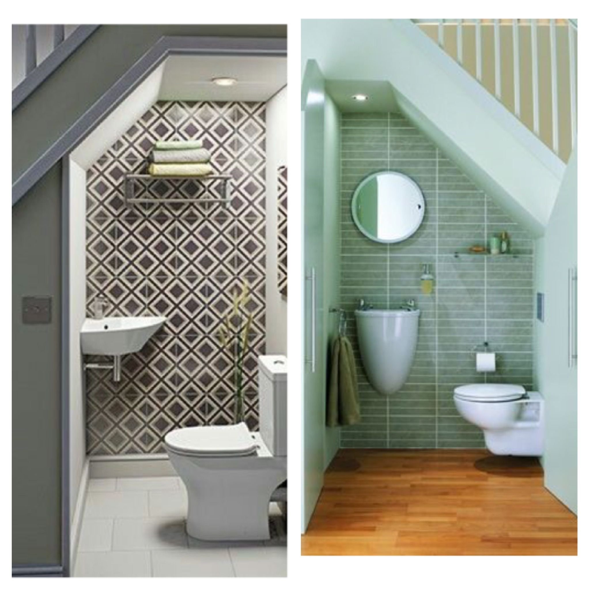 Оформление маленького туалета под лестницей
