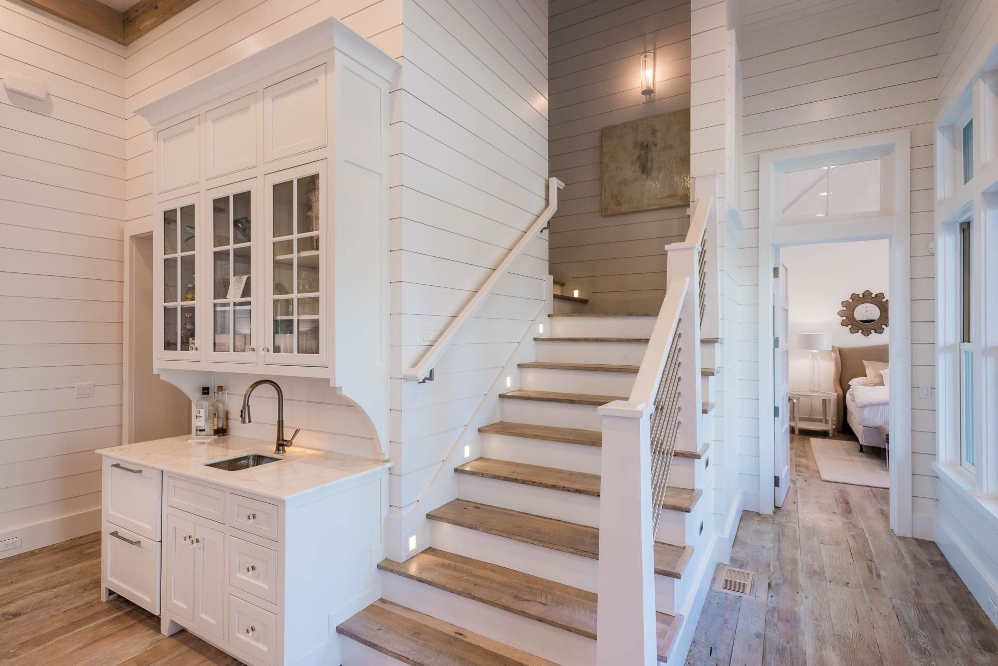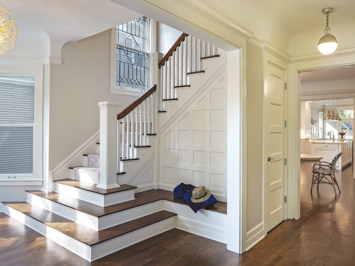 Белая деревянная лестница в деревянном доме