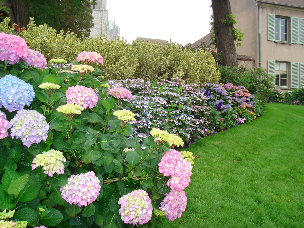 Гортензии на клумбе миксбордере