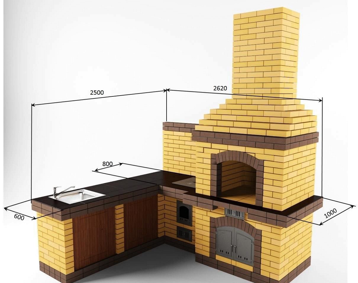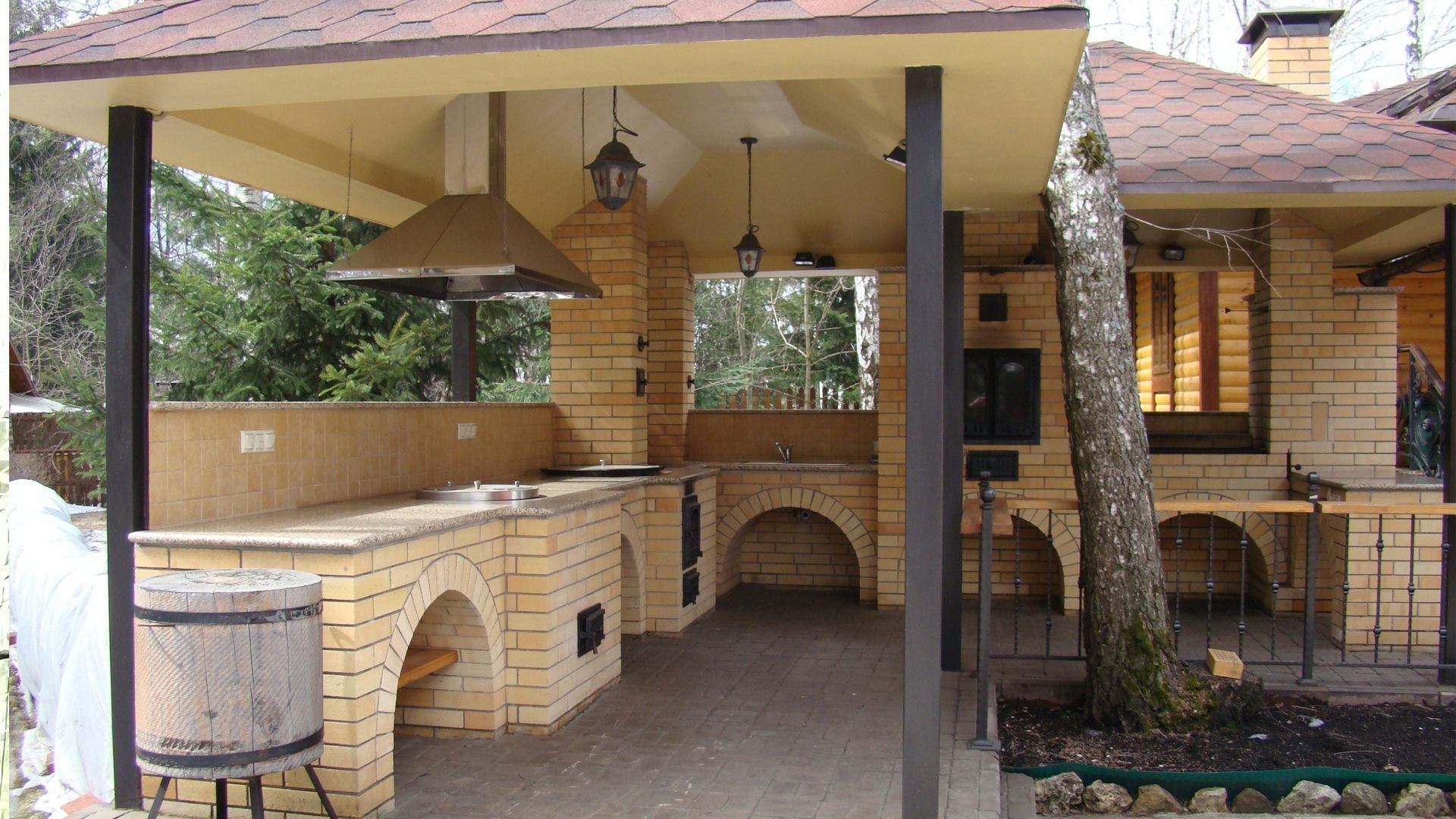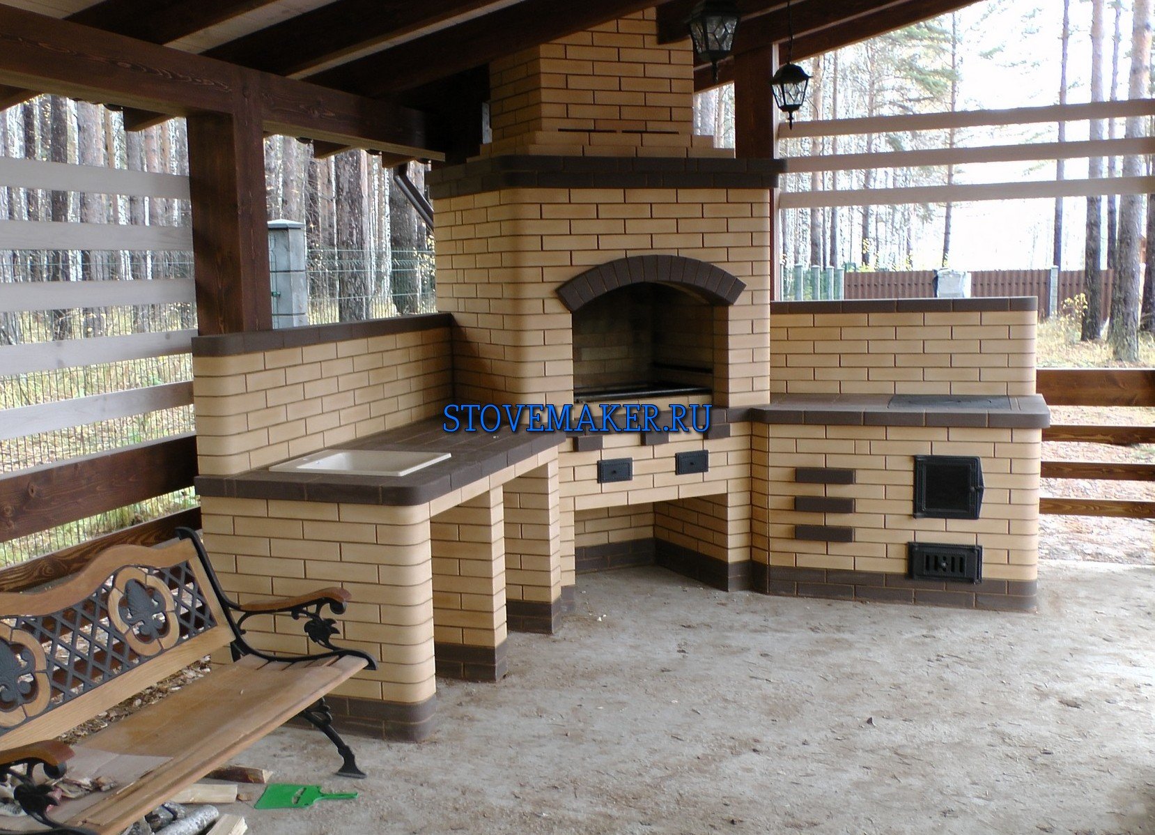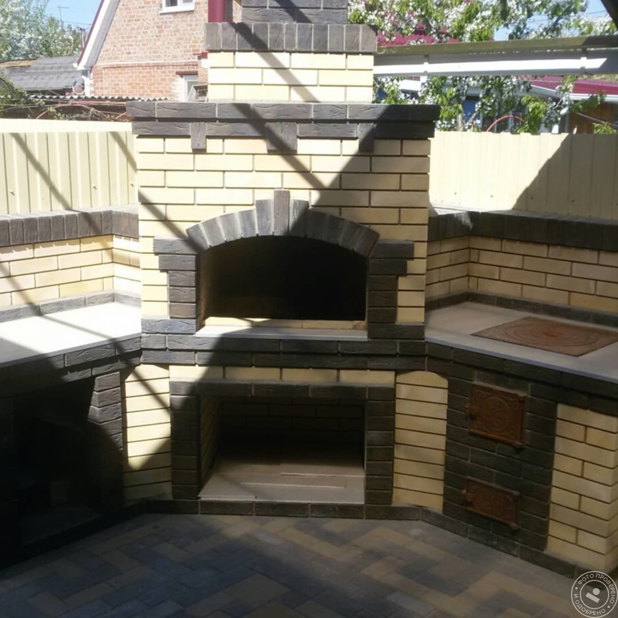 Угловой барбекю мангальная зона с коптильней и печью из кирпича