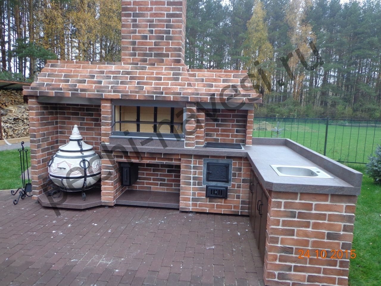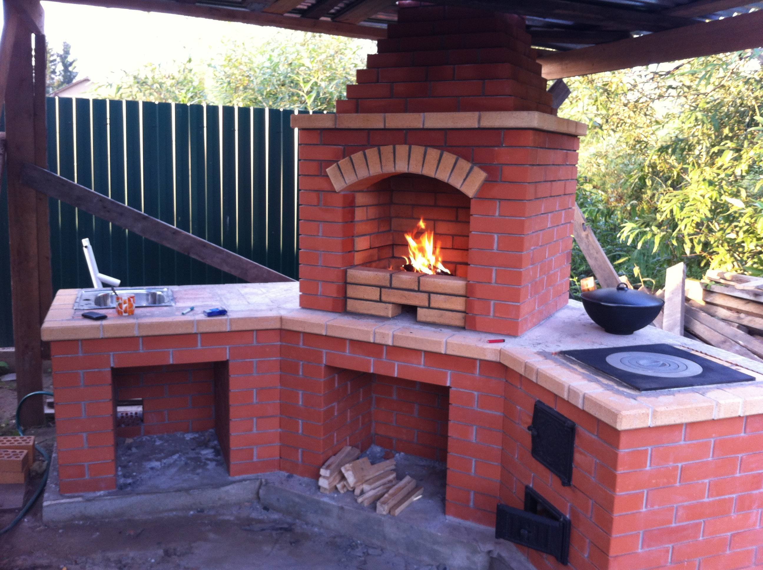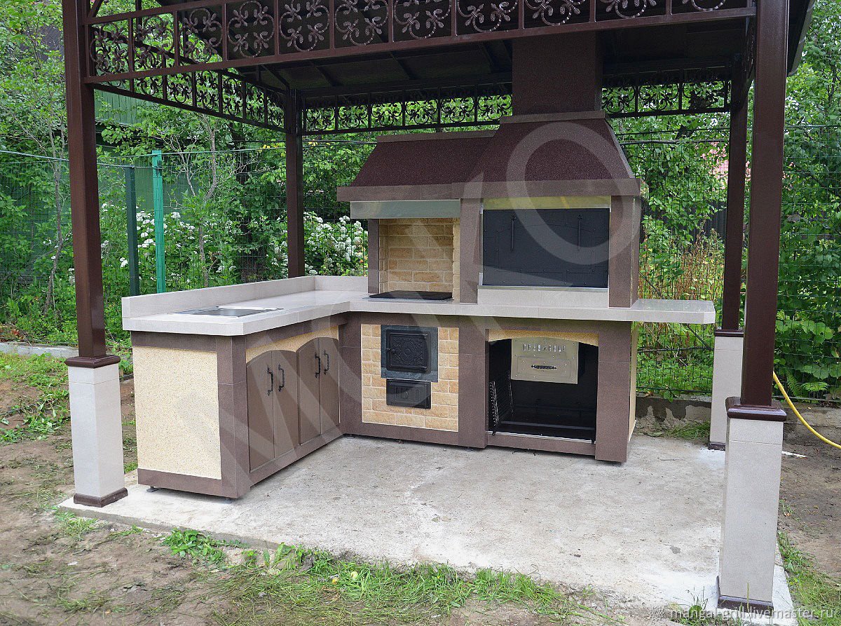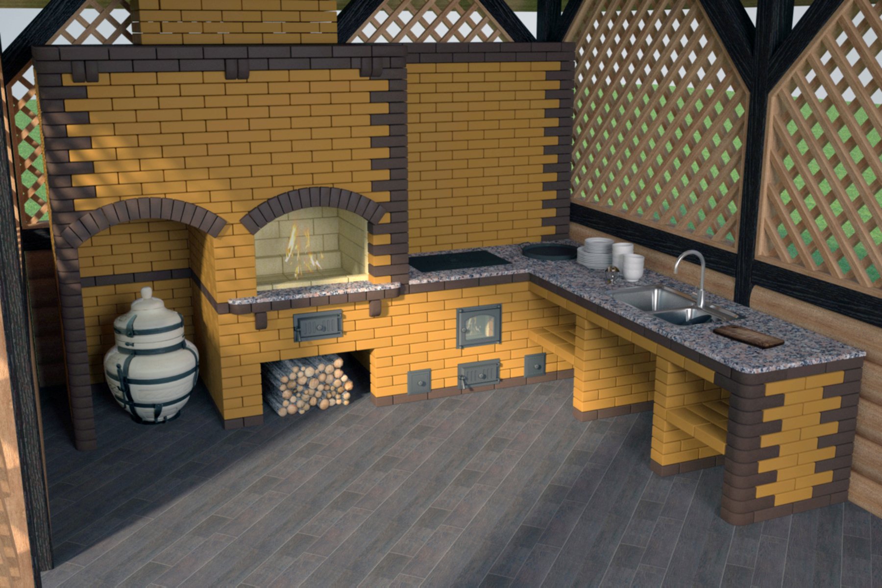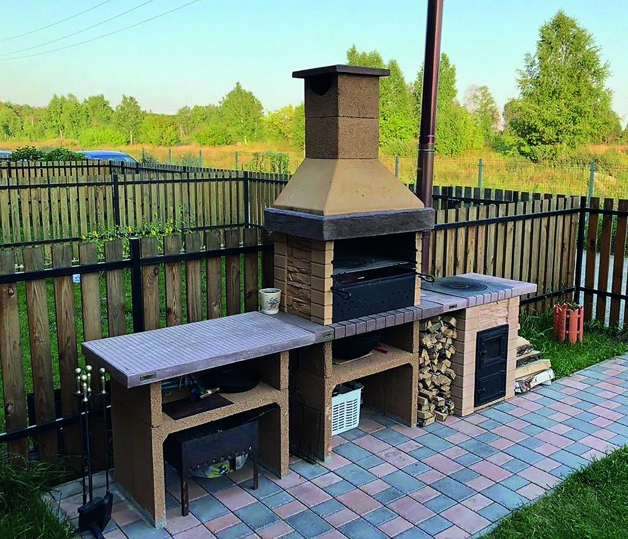 Угловой барбекю мангальная зона с коптильней и печью из кирпича