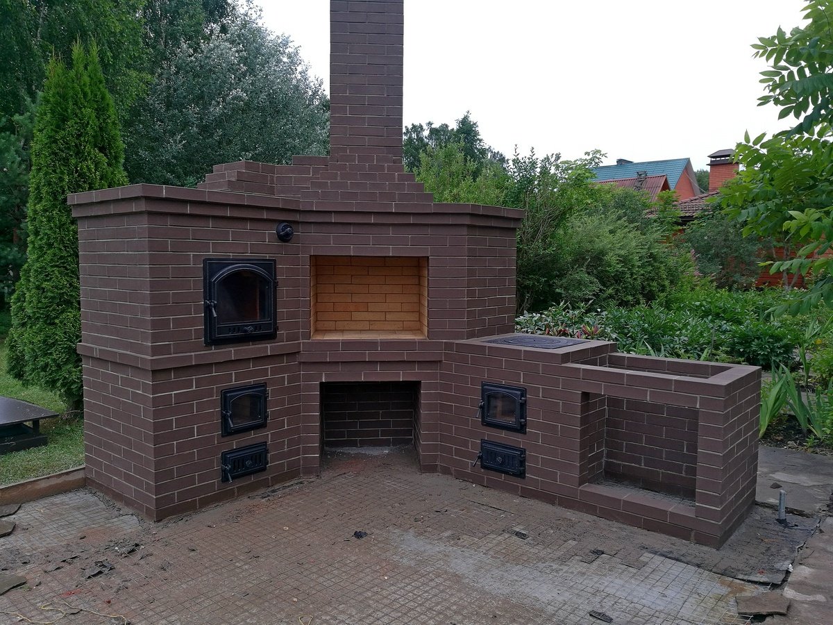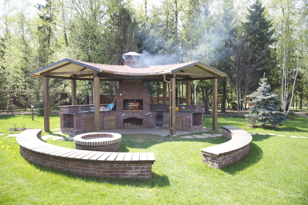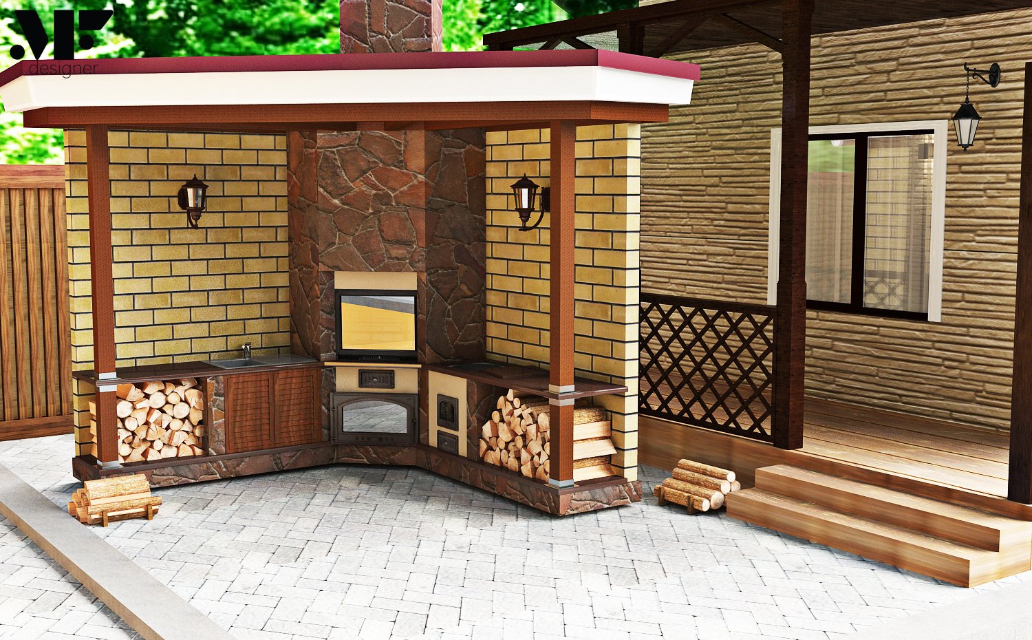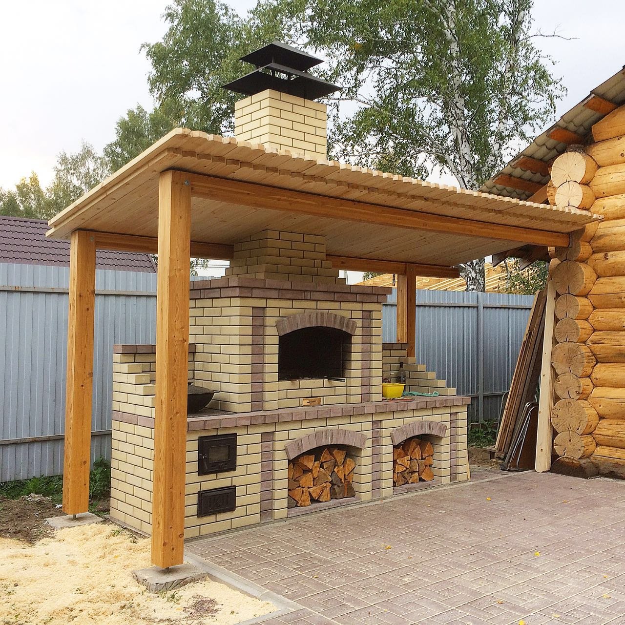 Угловой барбекю мангальная зона с коптильней и печью из кирпича