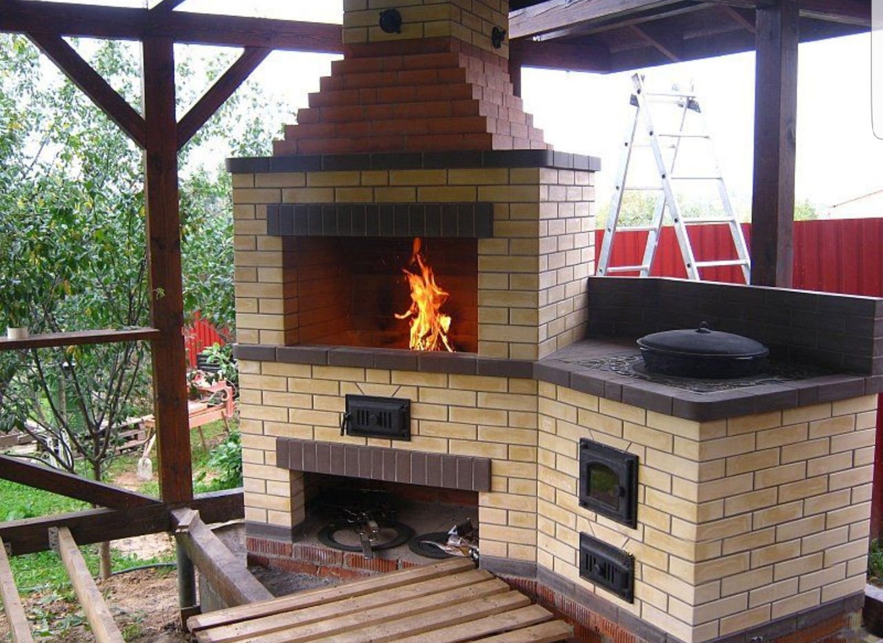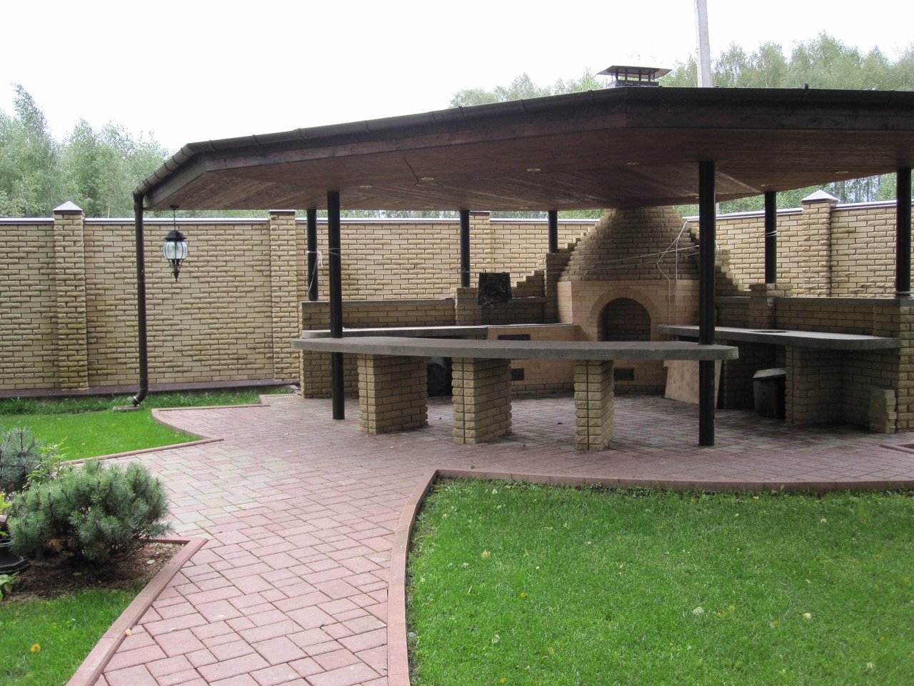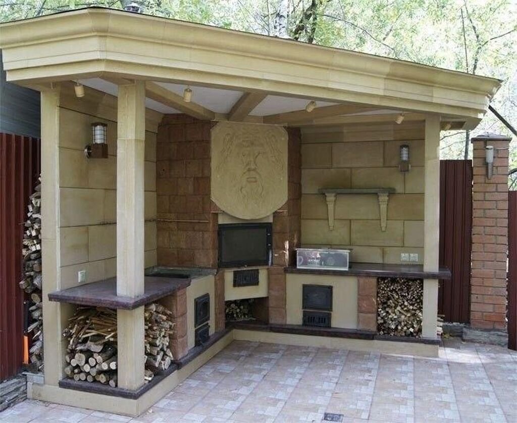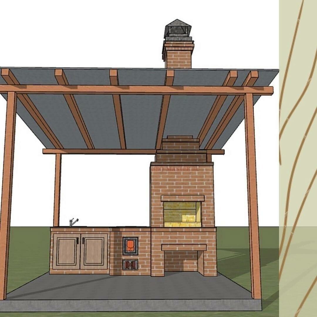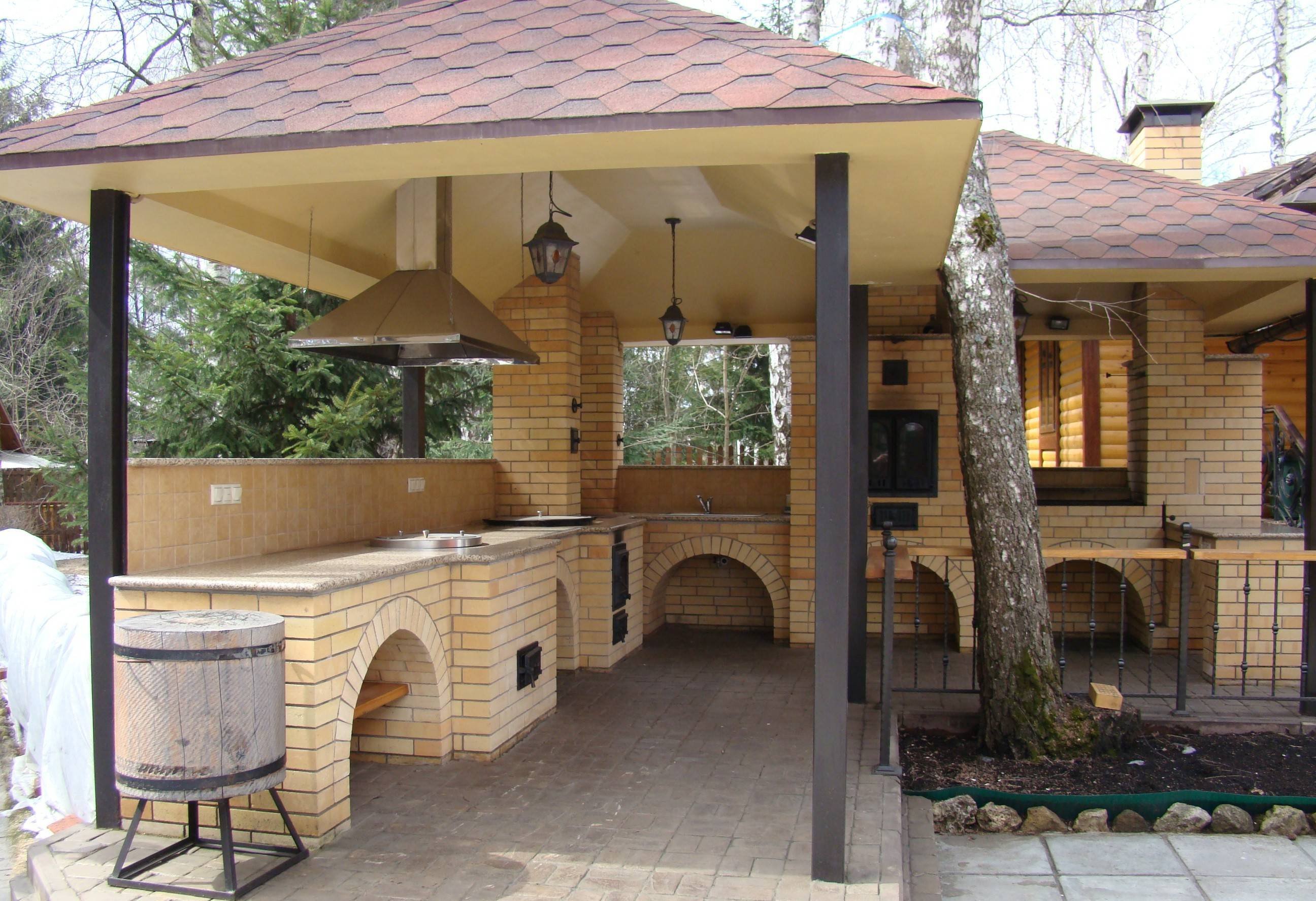 Угловой барбекю мангальная зона с коптильней и печью из кирпича