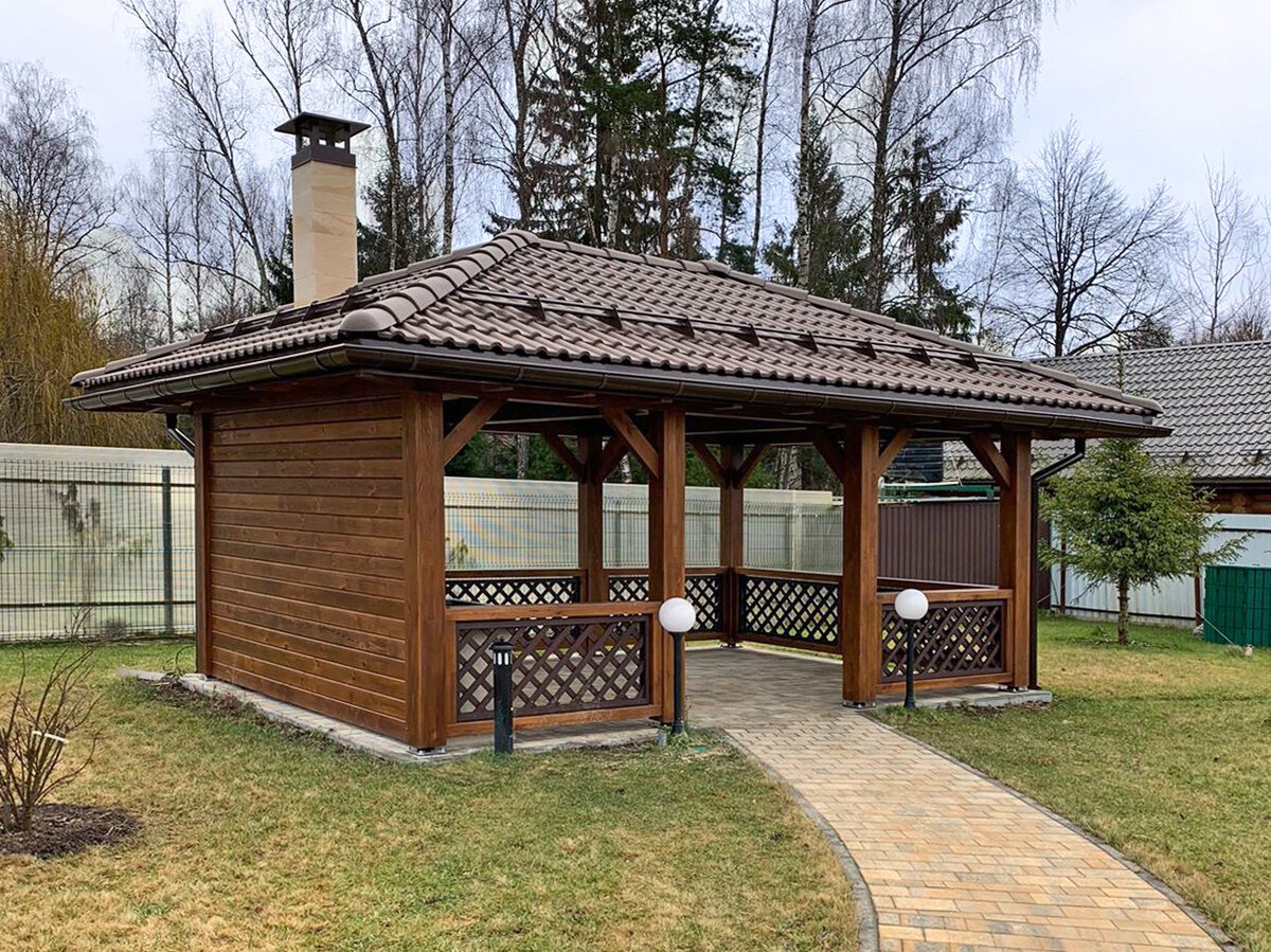 Беседка с четырехскатной крышей и мангалом