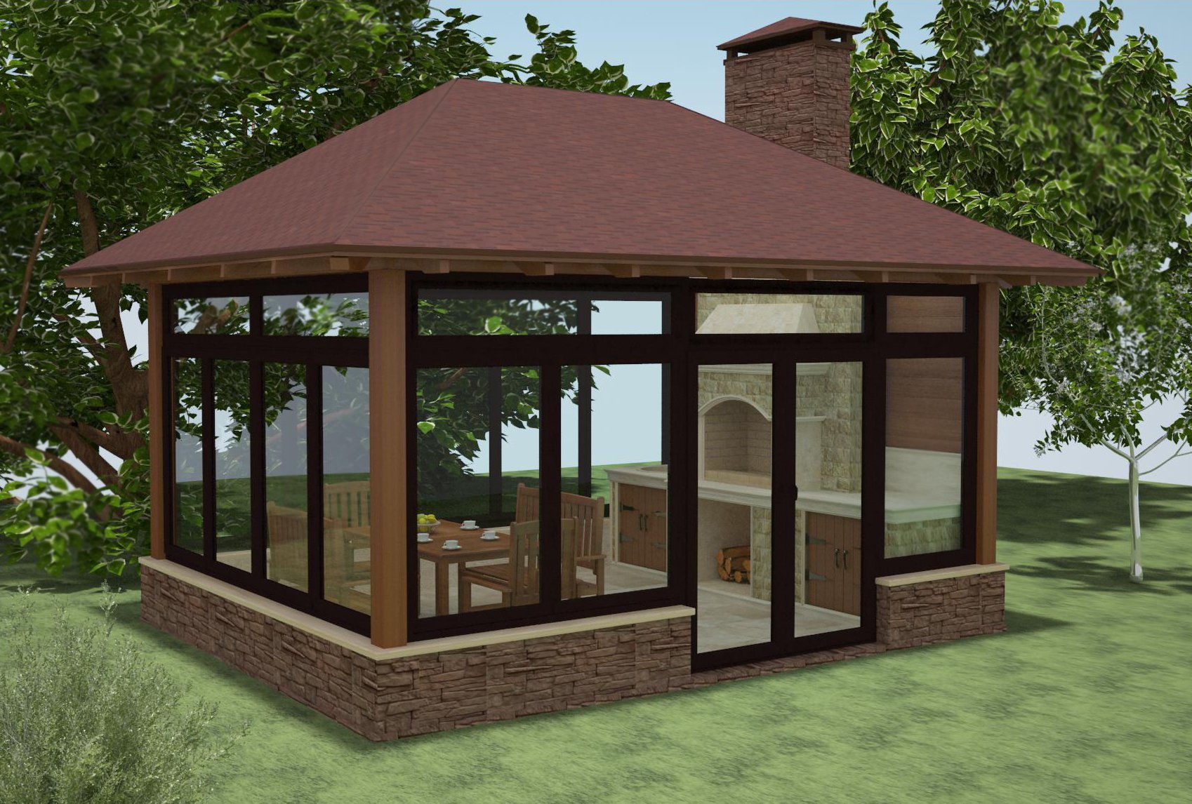 Крытая беседка застекленная с мангалом и барбекю 4х6