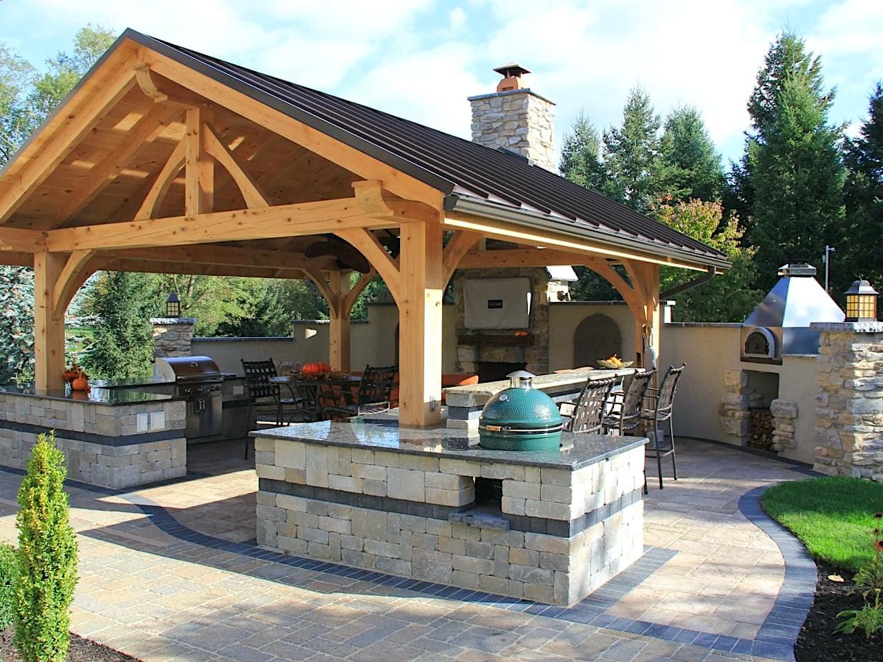 Патио с барбекю и деревянным навесом