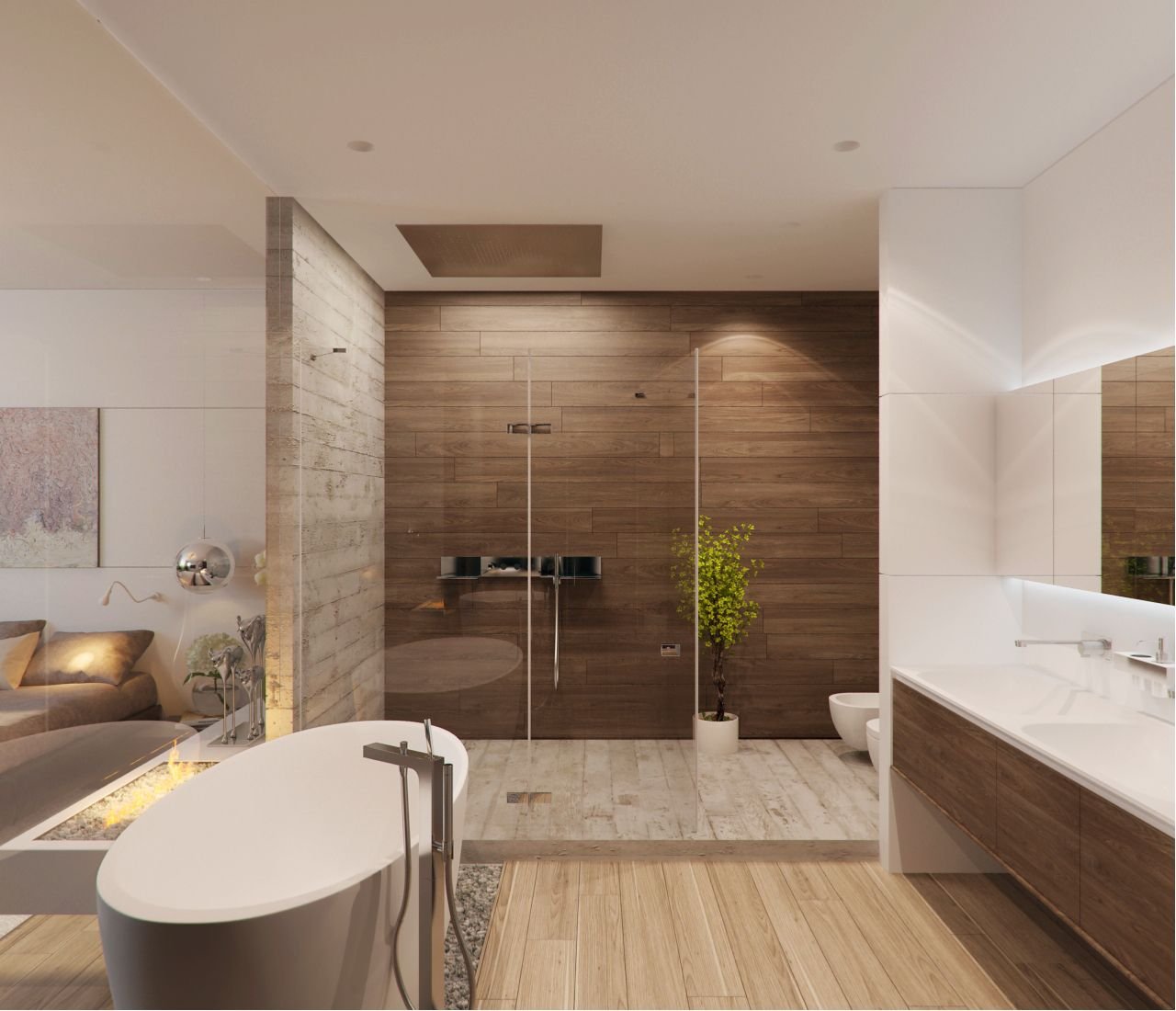 Бежевая ванная с деревом