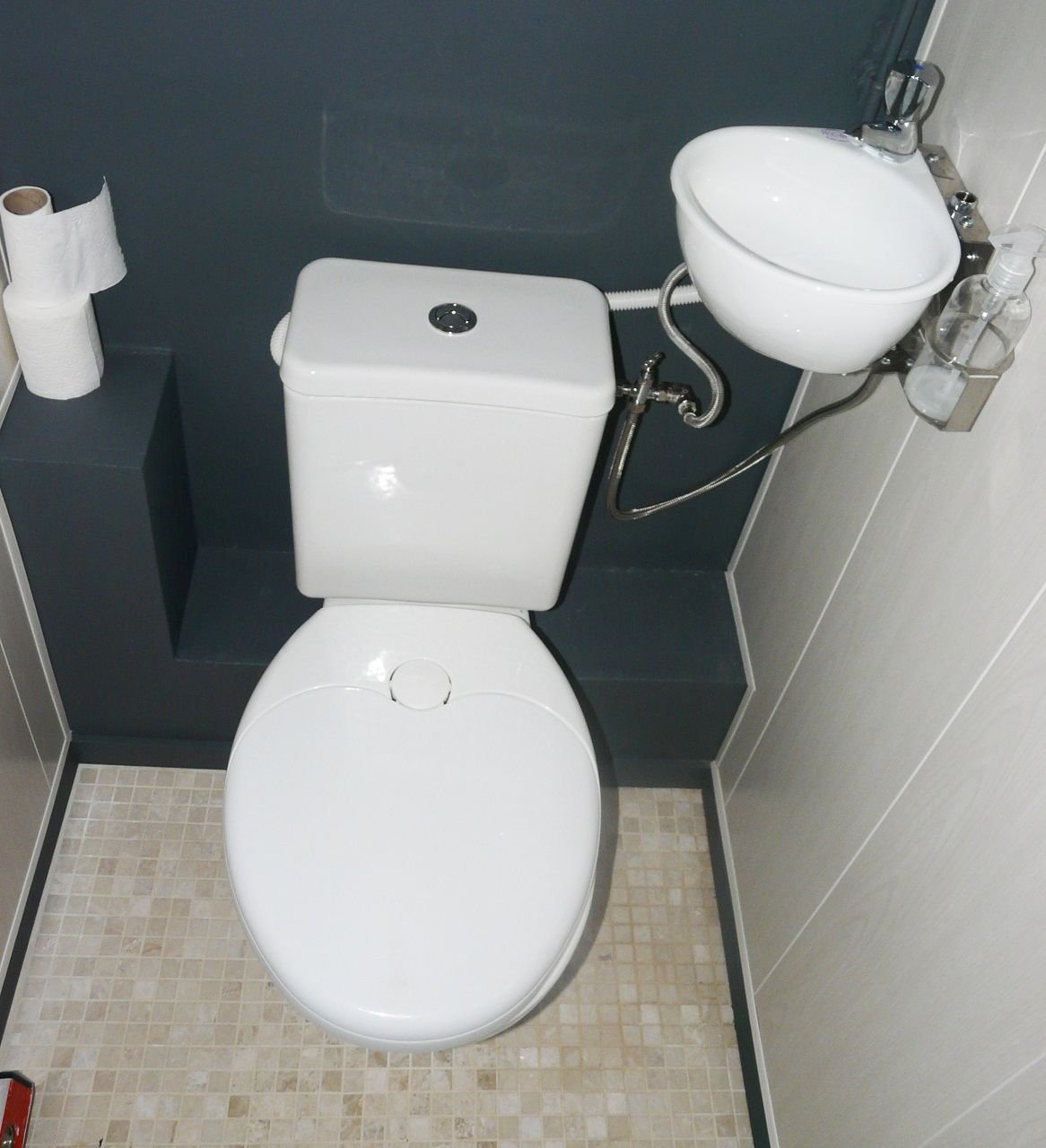 Маленький туалет с маленькой раковиной для мытья рук
