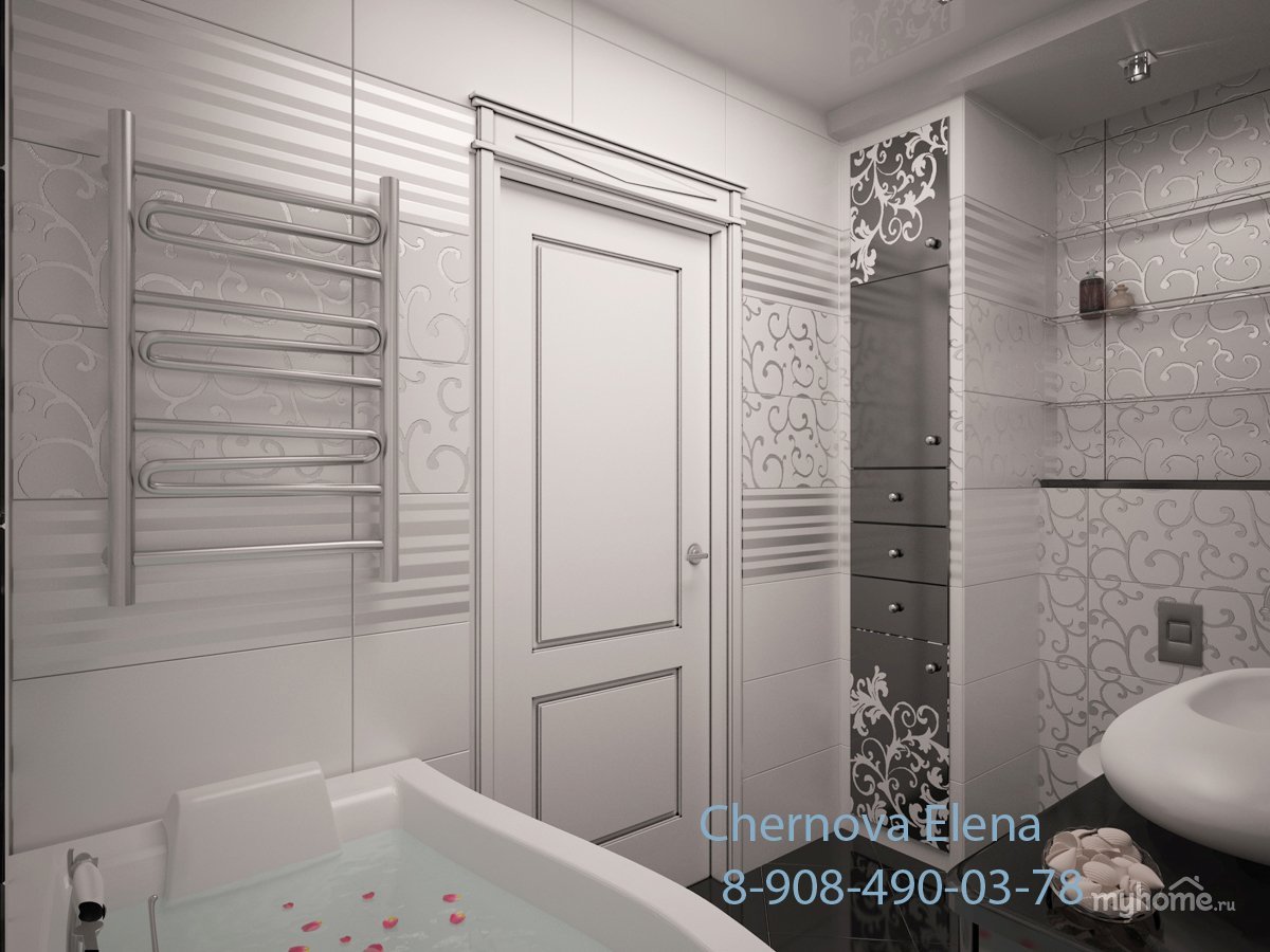Интерьер ванной комнаты с белой дверью