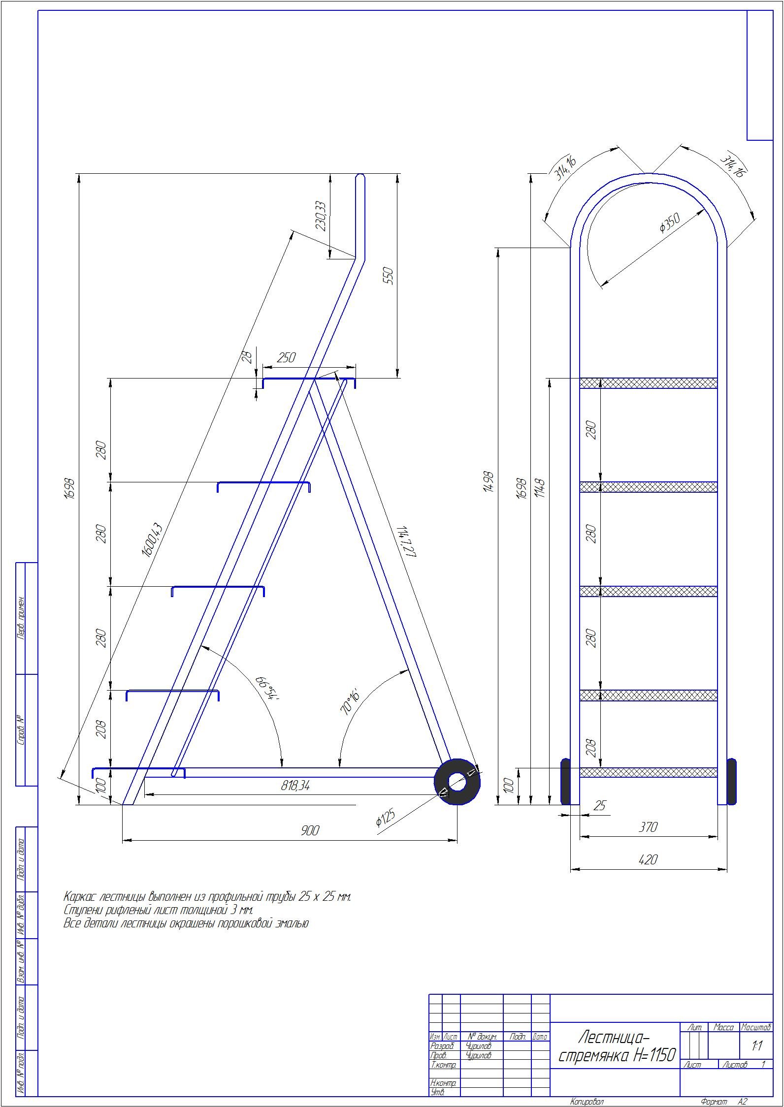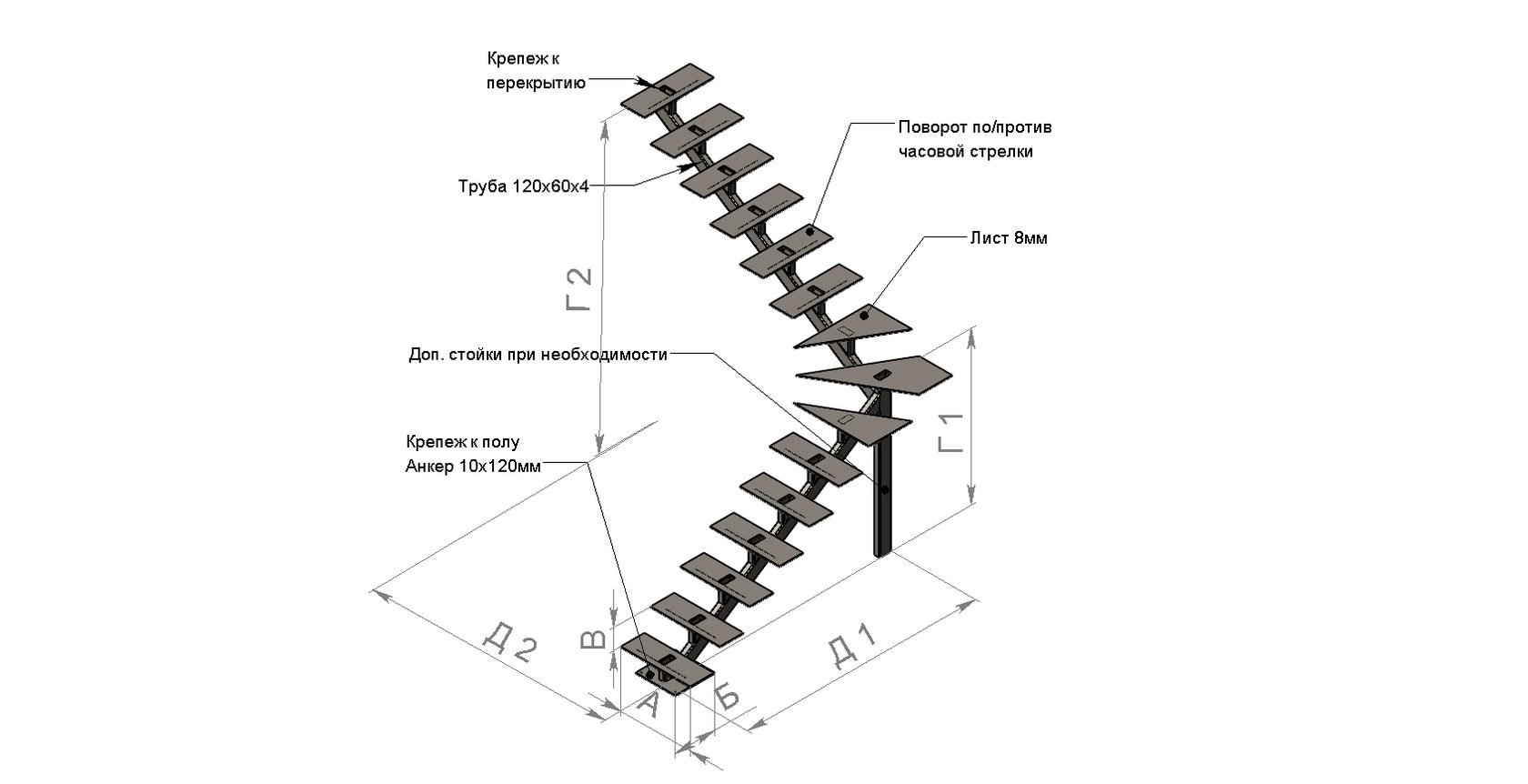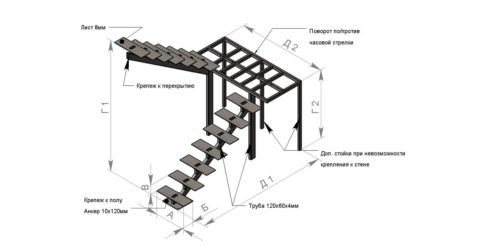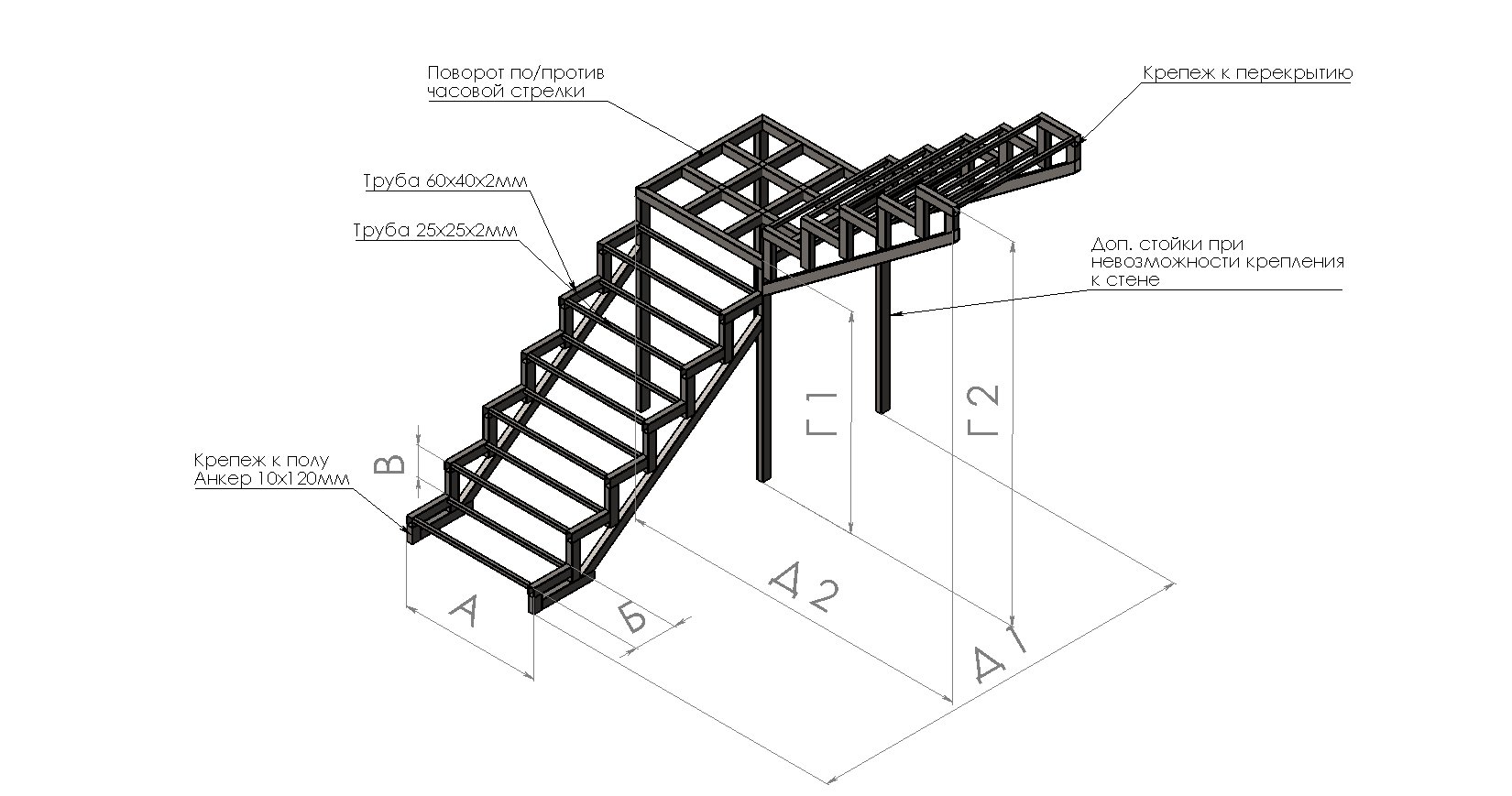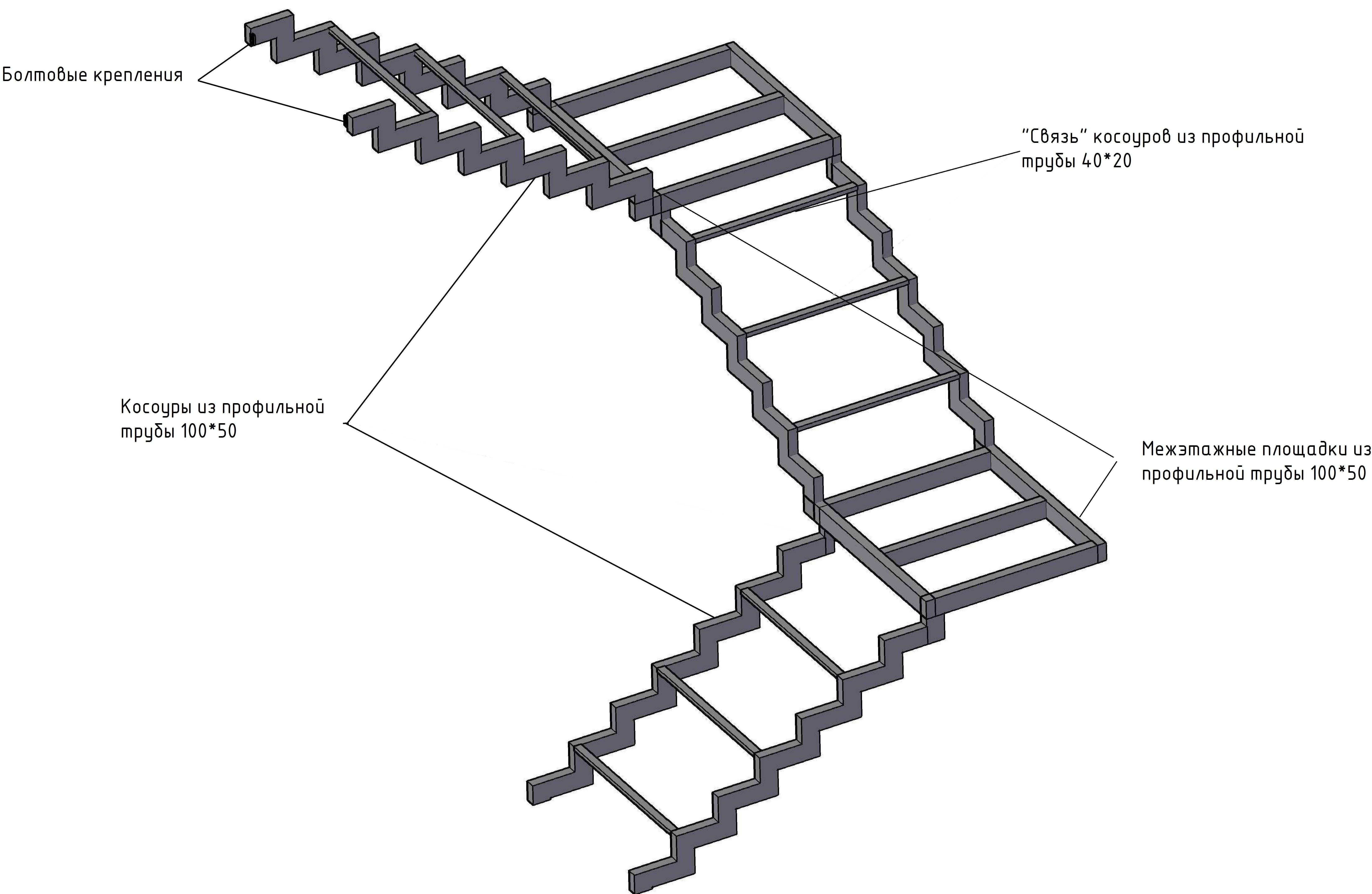 Лестница с ломаными косоурами из профильной трубы чертеж