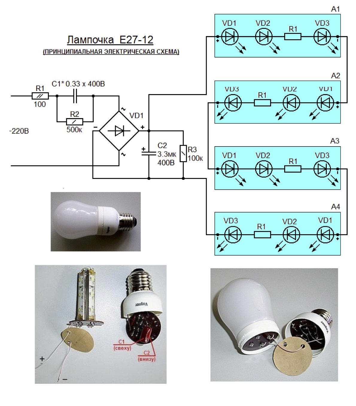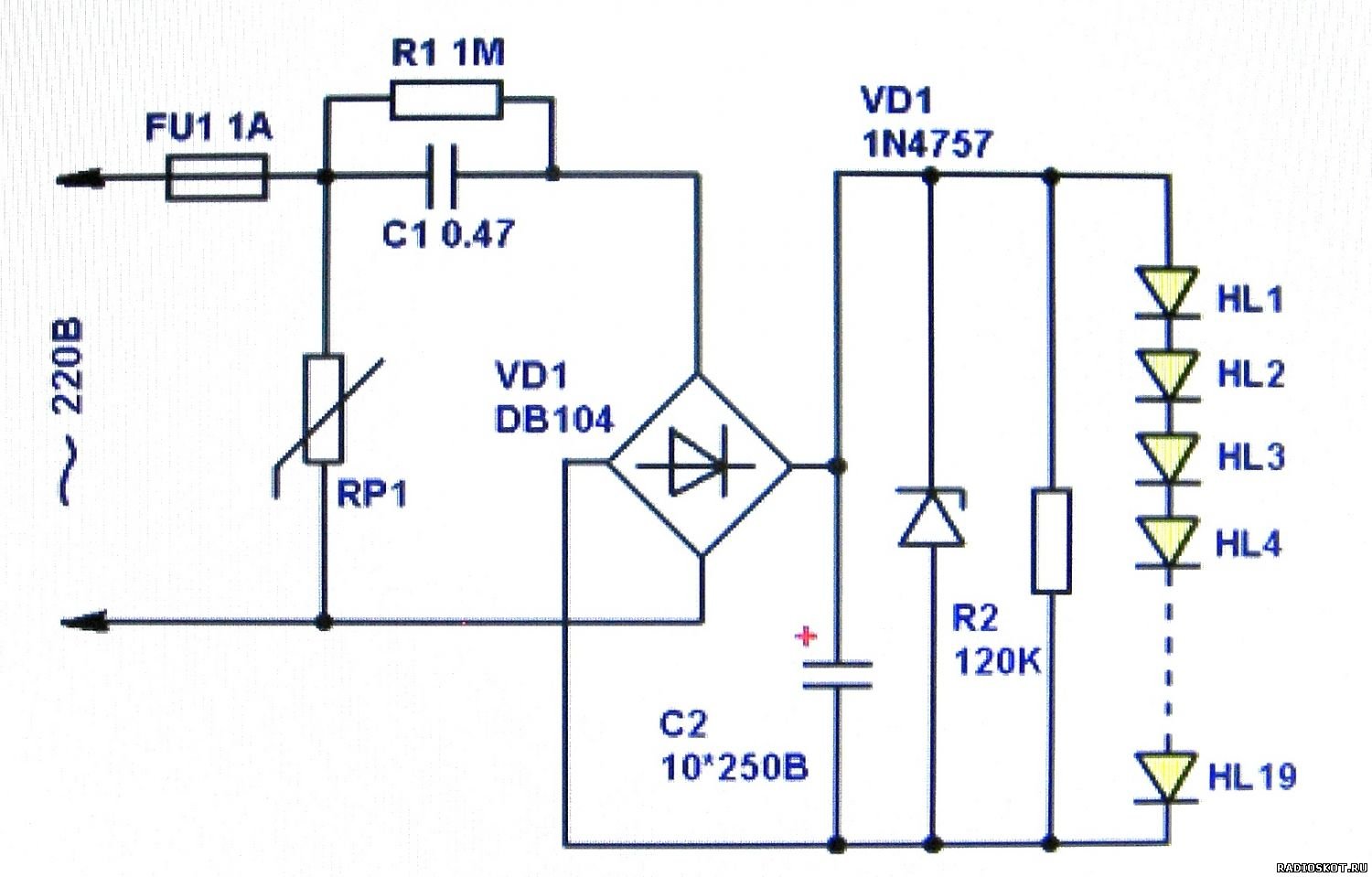 Схема подключения конденсатора с резистором для светодиодных ламп