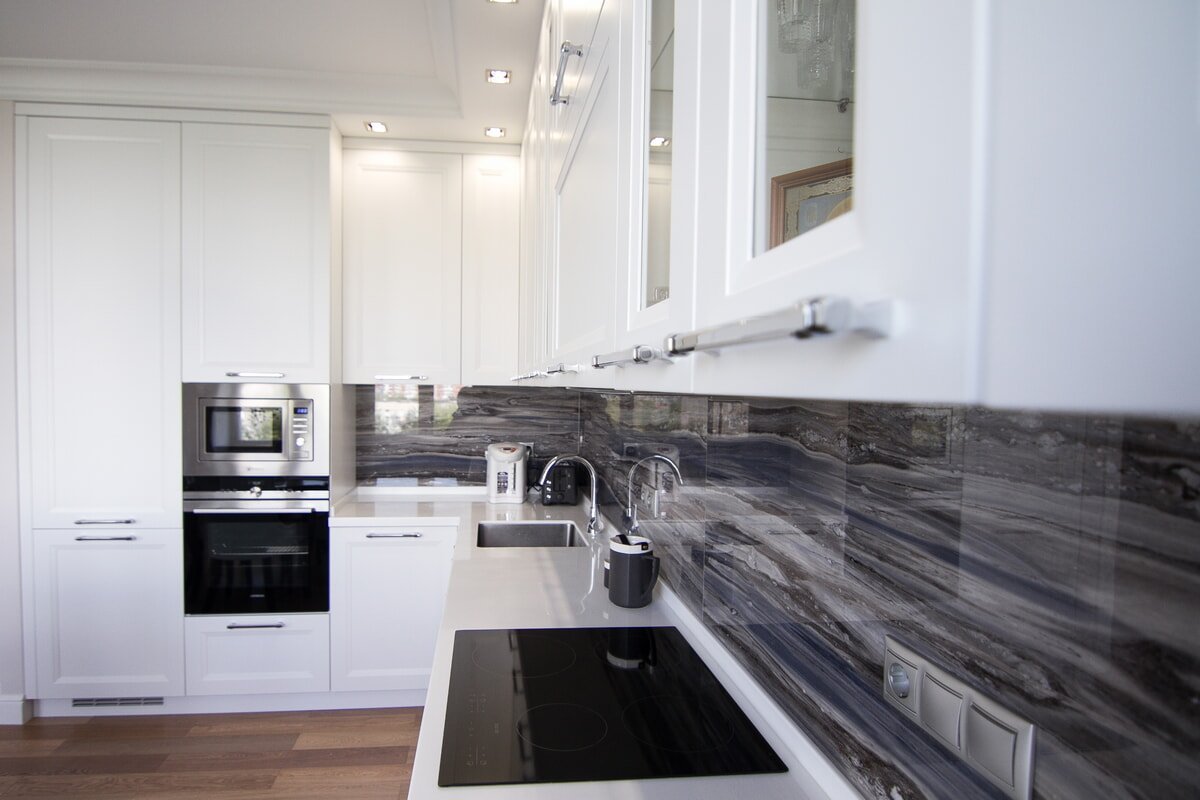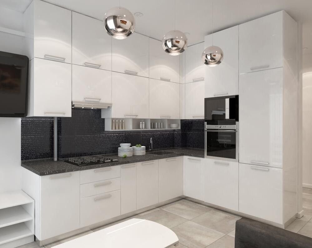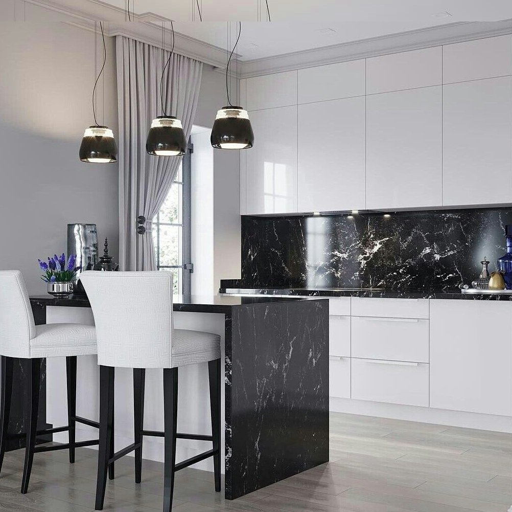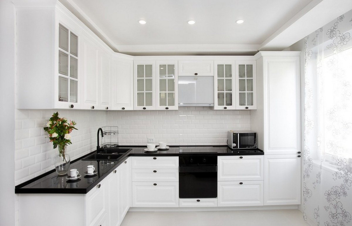 Белая кухня с чёрной столешницей и белым фартуком