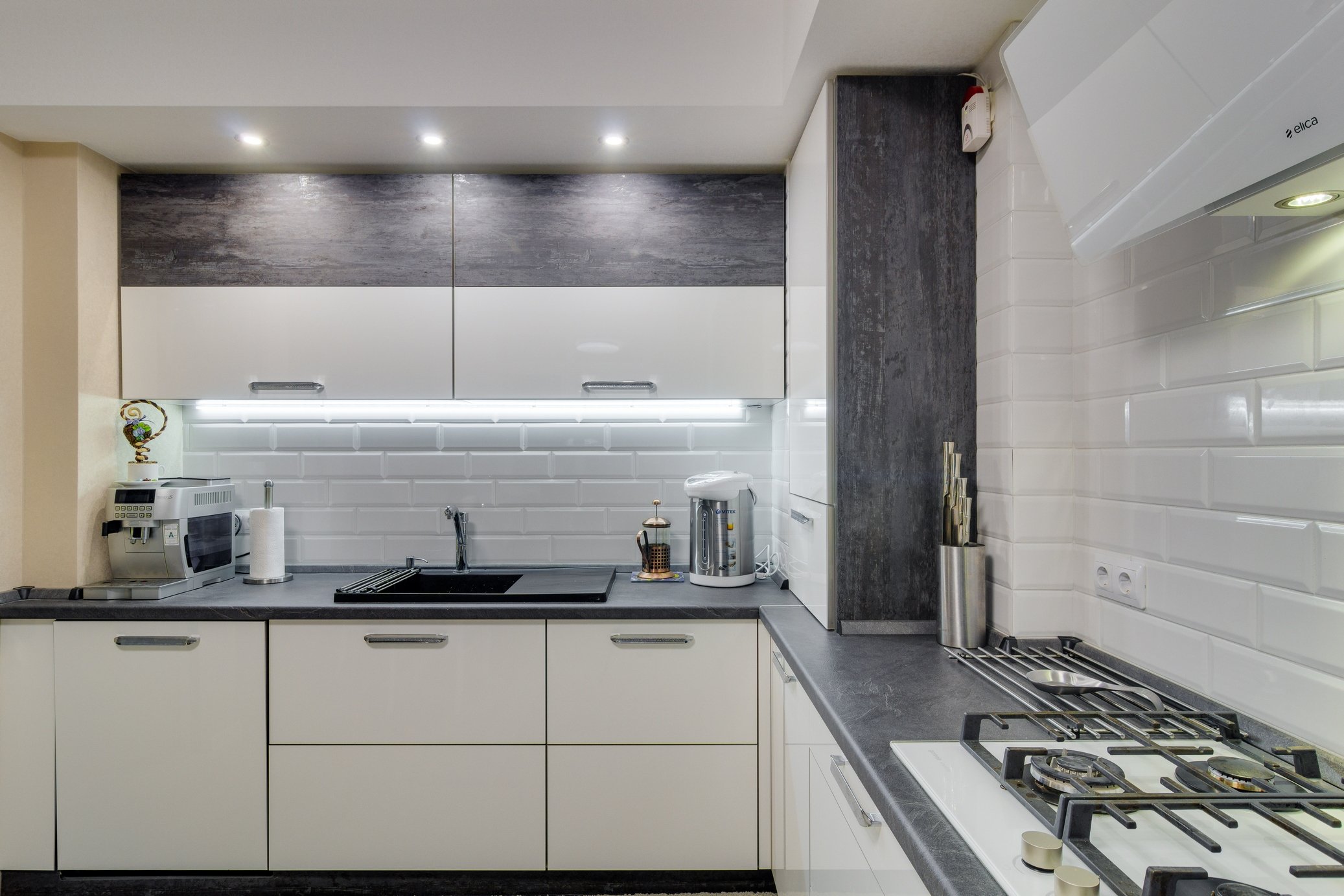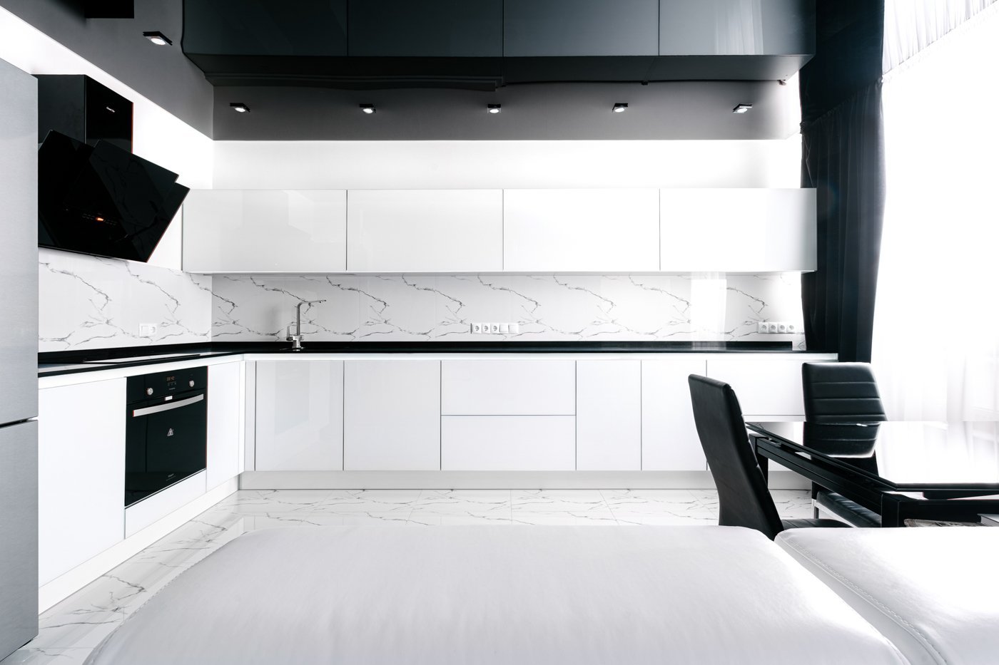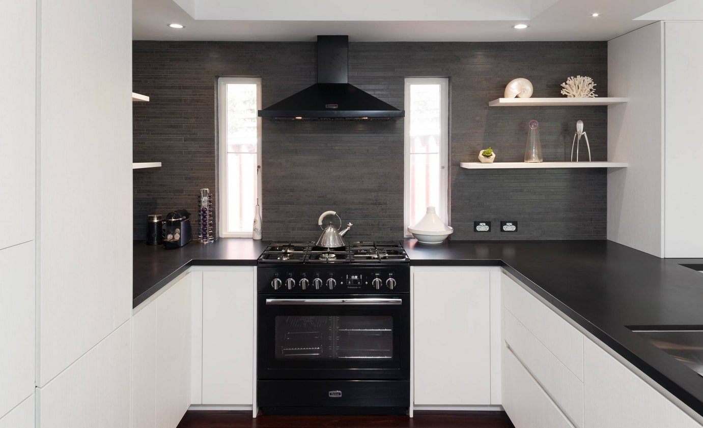 Белая кухня с чёрной столешницей и белым фартуком