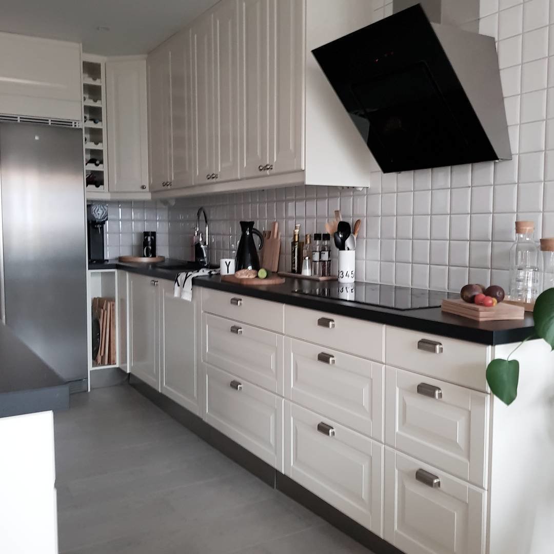 Кухня Будбин белая и черная столешница икеа