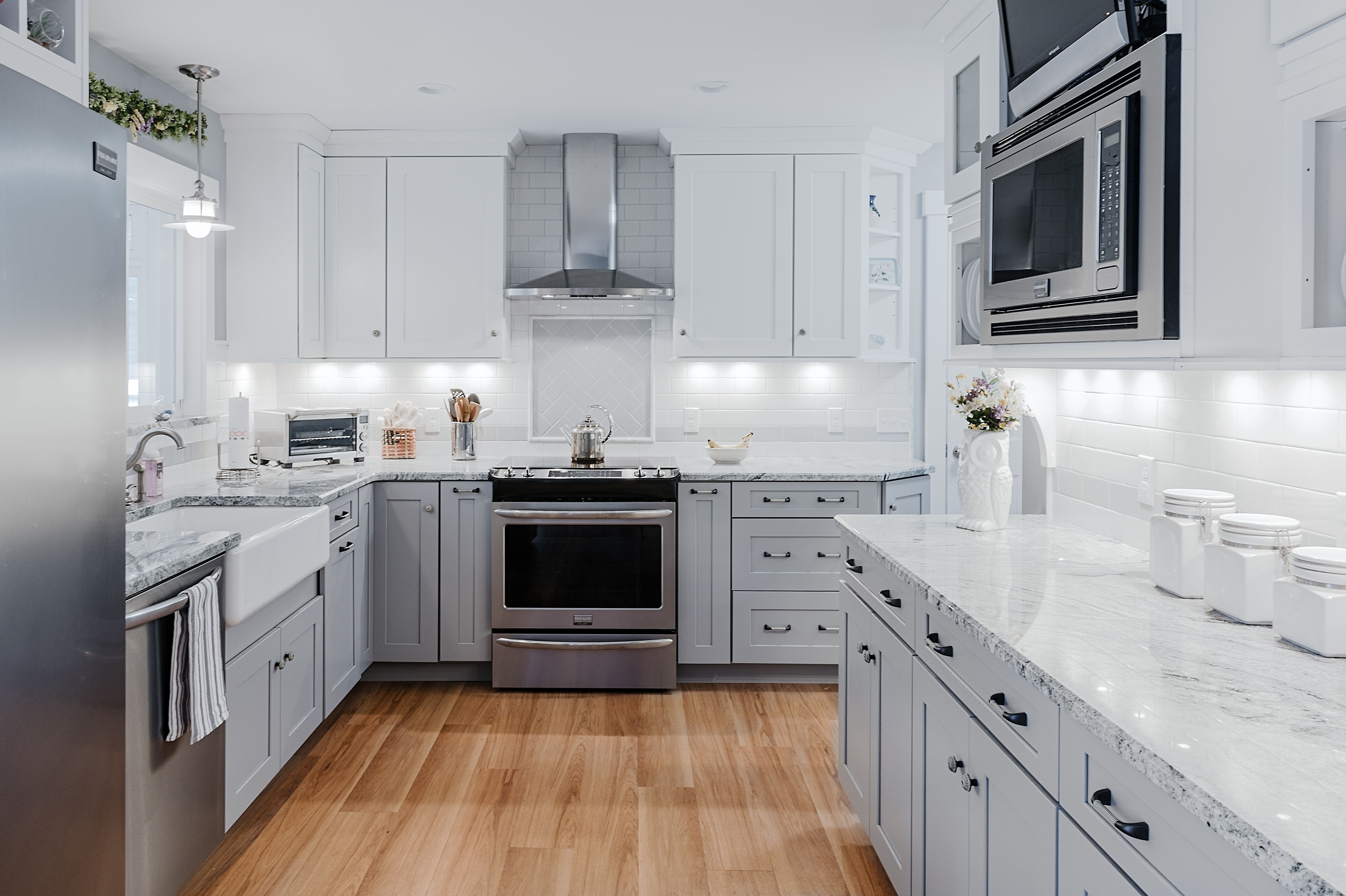 Белая кухня с серой столешницей