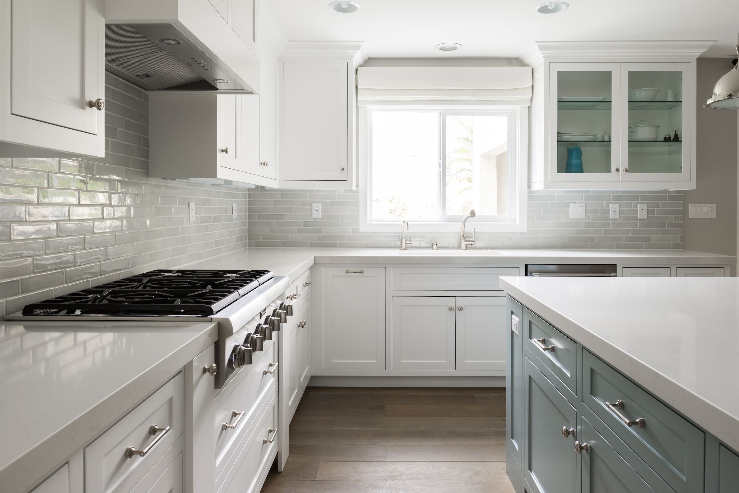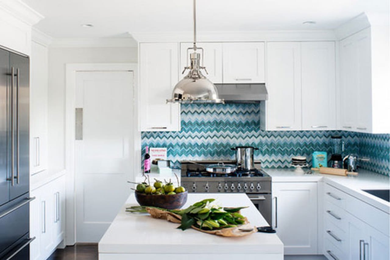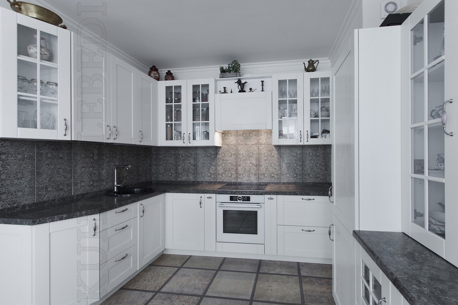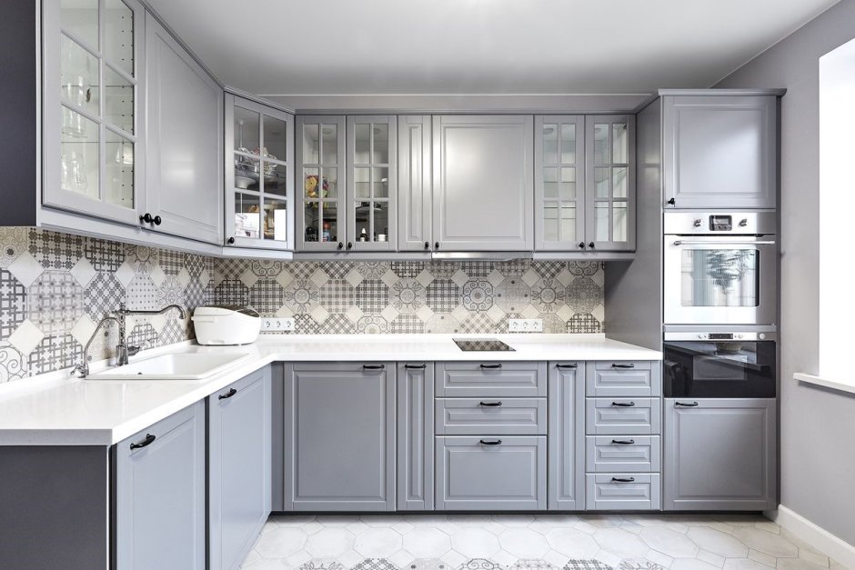 Белая кухня с серой плиткой