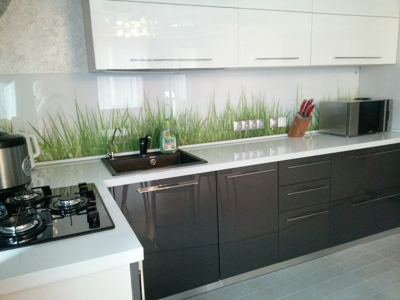 Белая кухня с черным фартуком