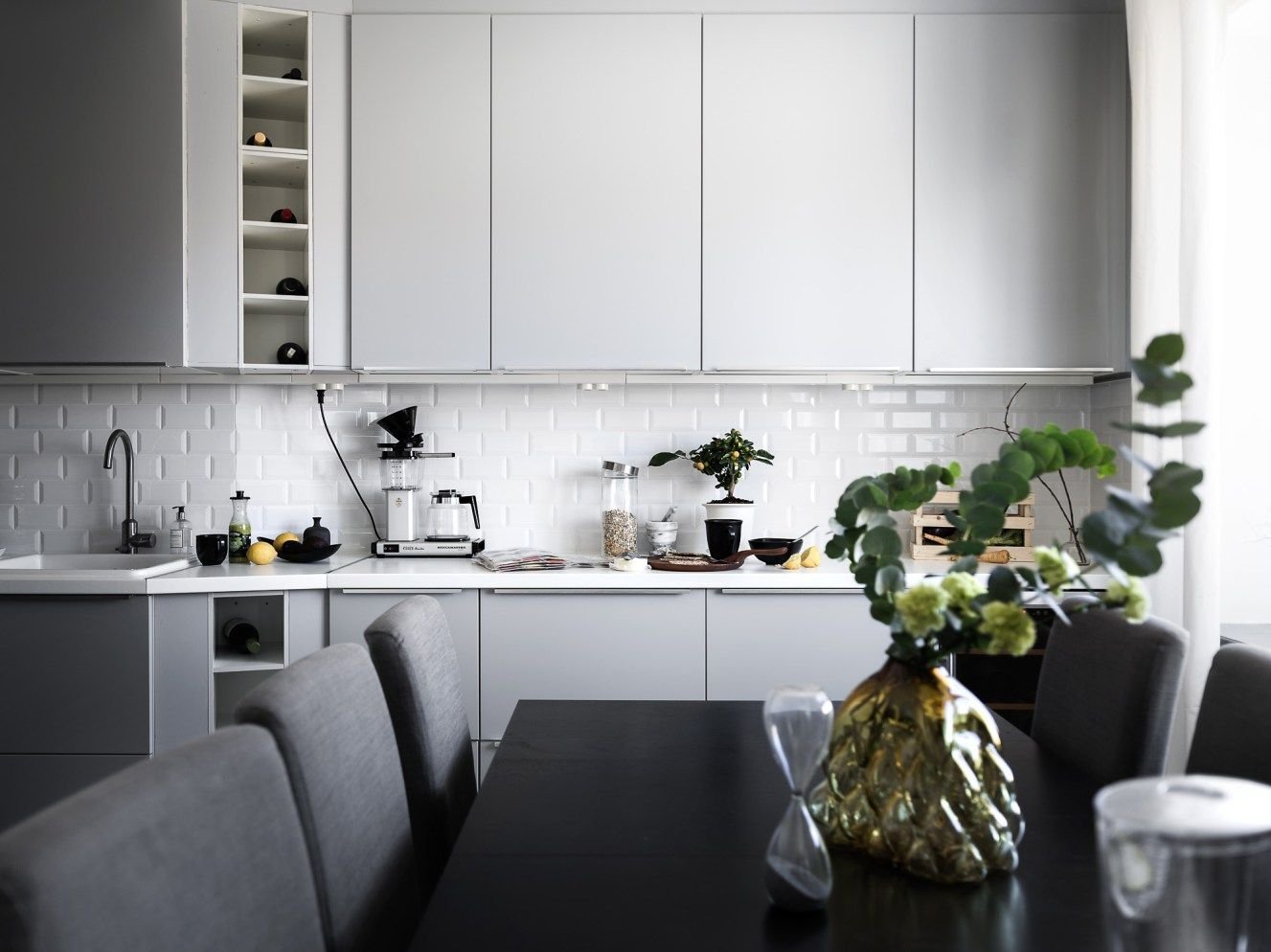 Кухня серо-белая с растениями