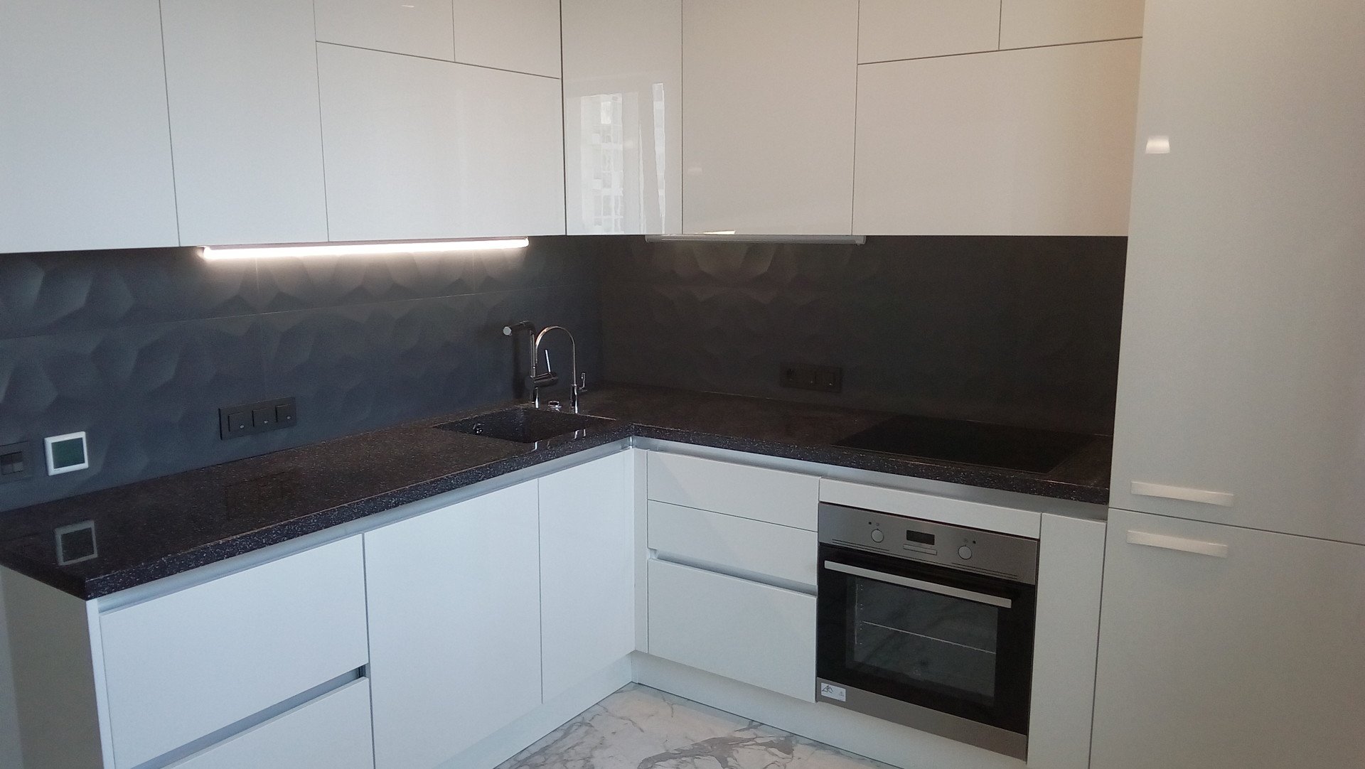Кухня белый глянец с серым фартуком