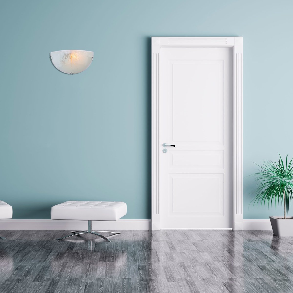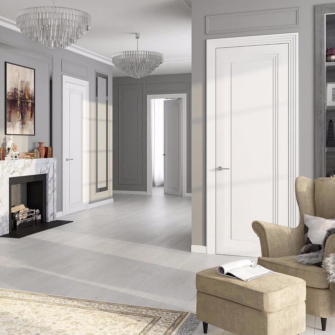 Интерьер с белыми дверями и плинтусами