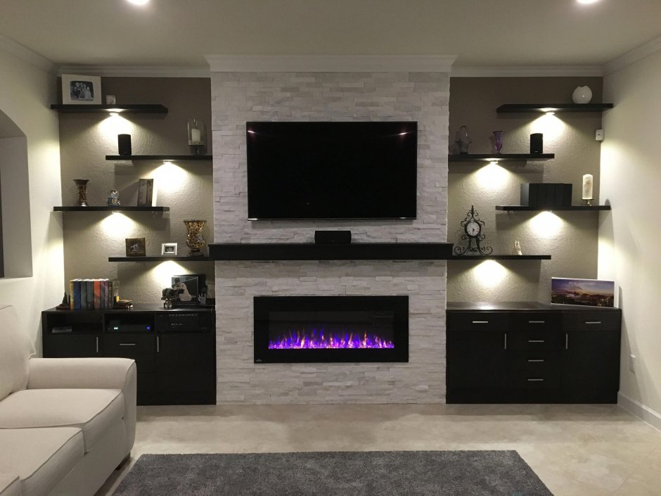 Стенка в гостиную с камином и телевизором