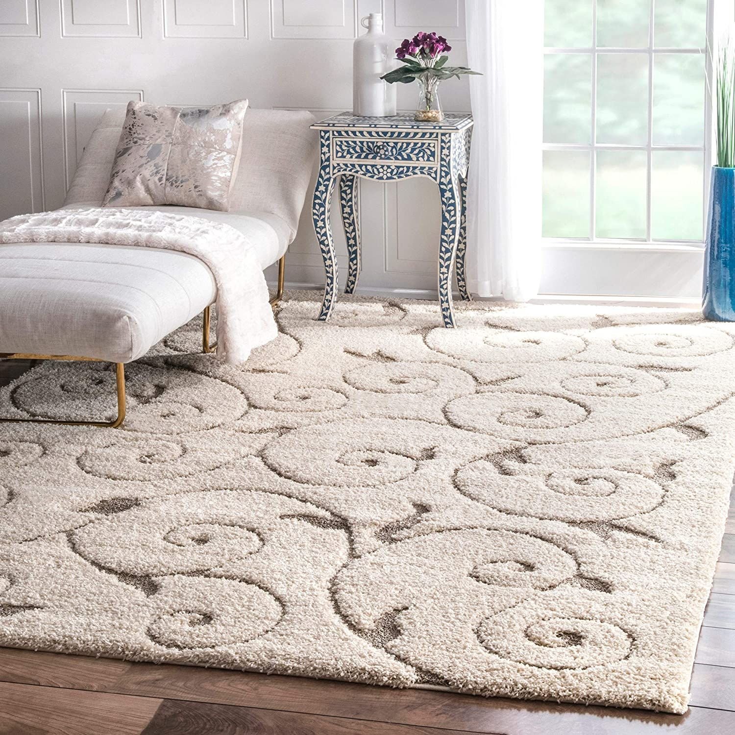 Белая гостиная с витриной и пушистым белым ковром