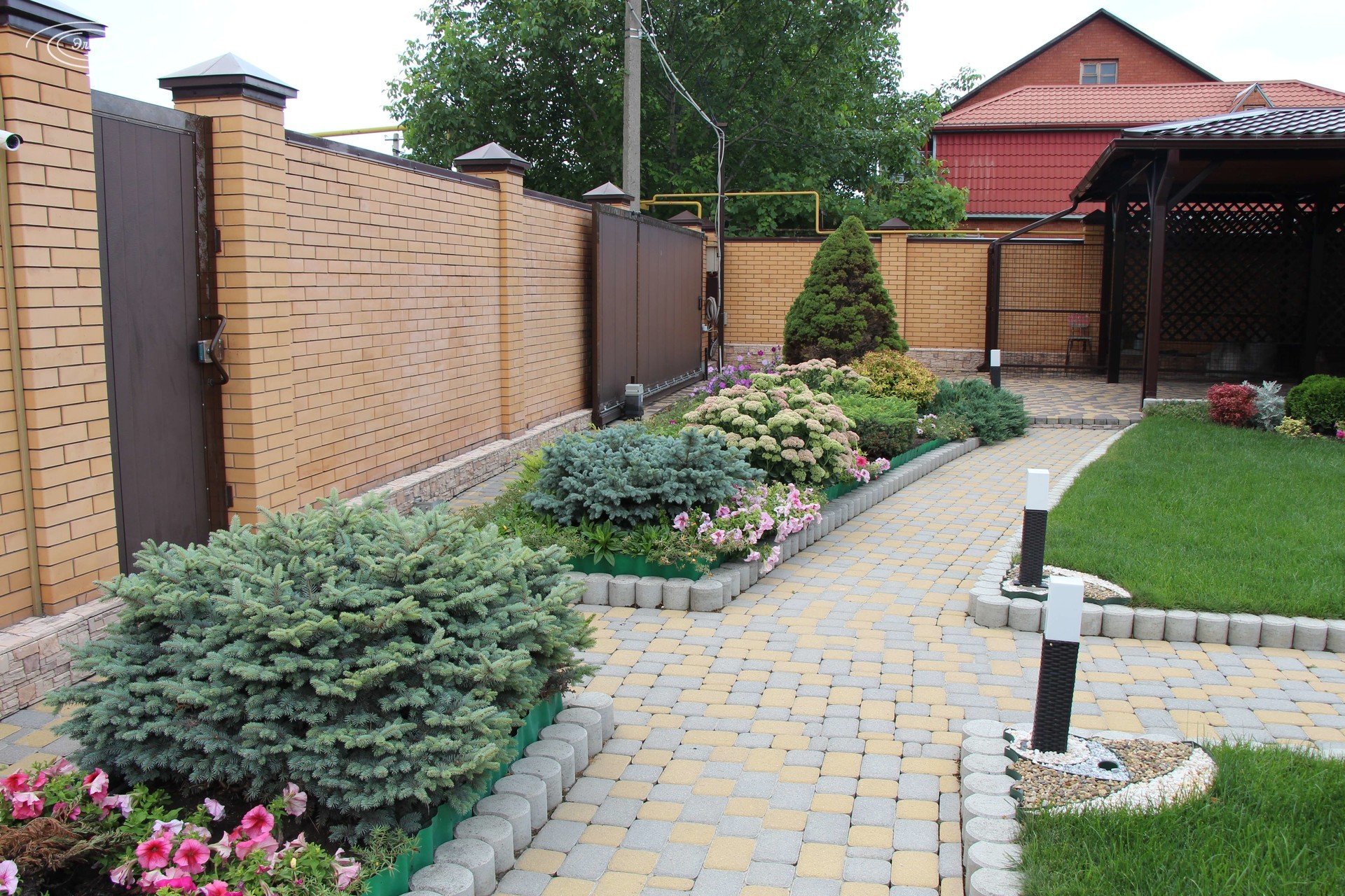 Двор в плитке с клумбой