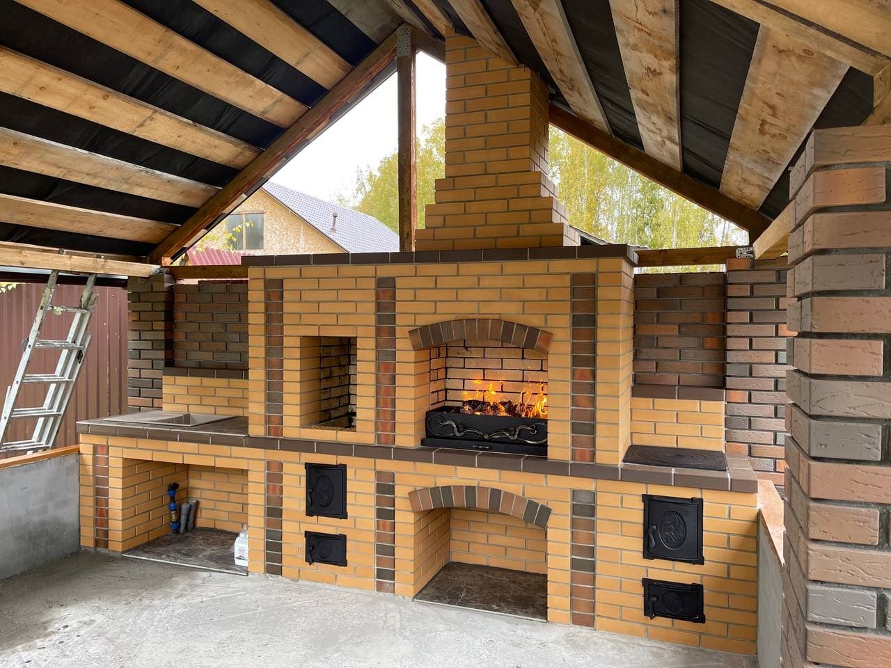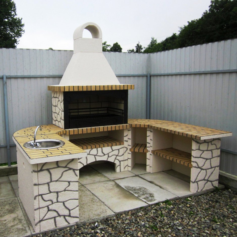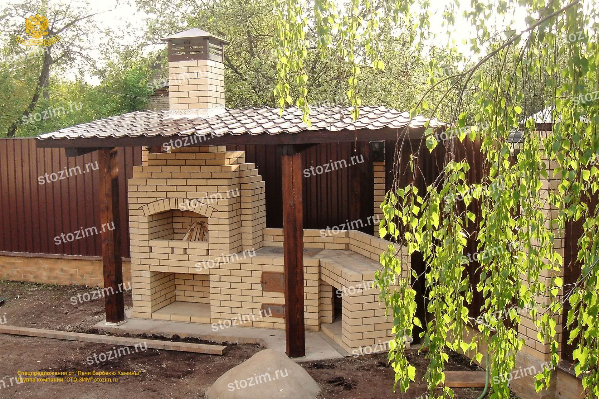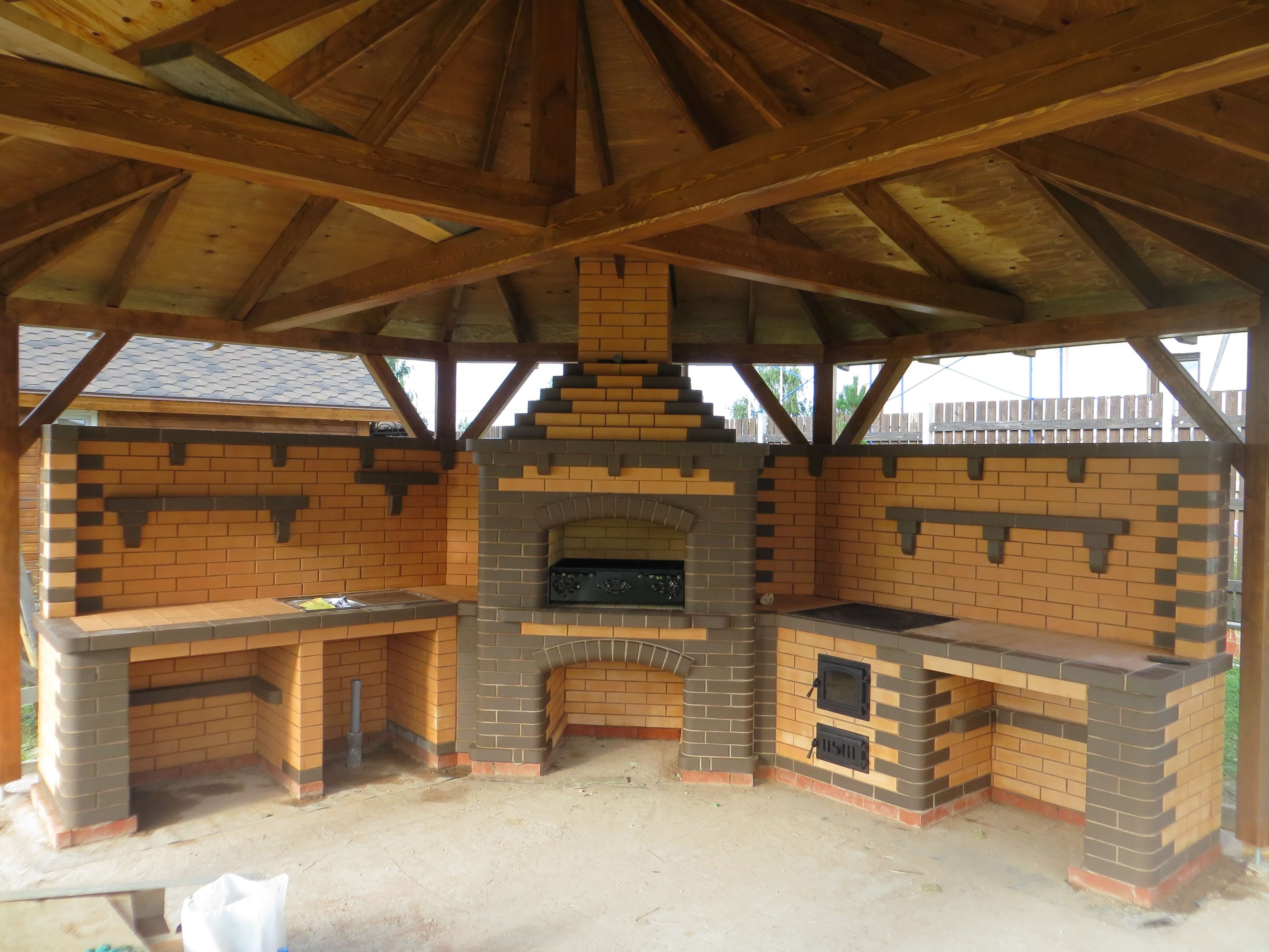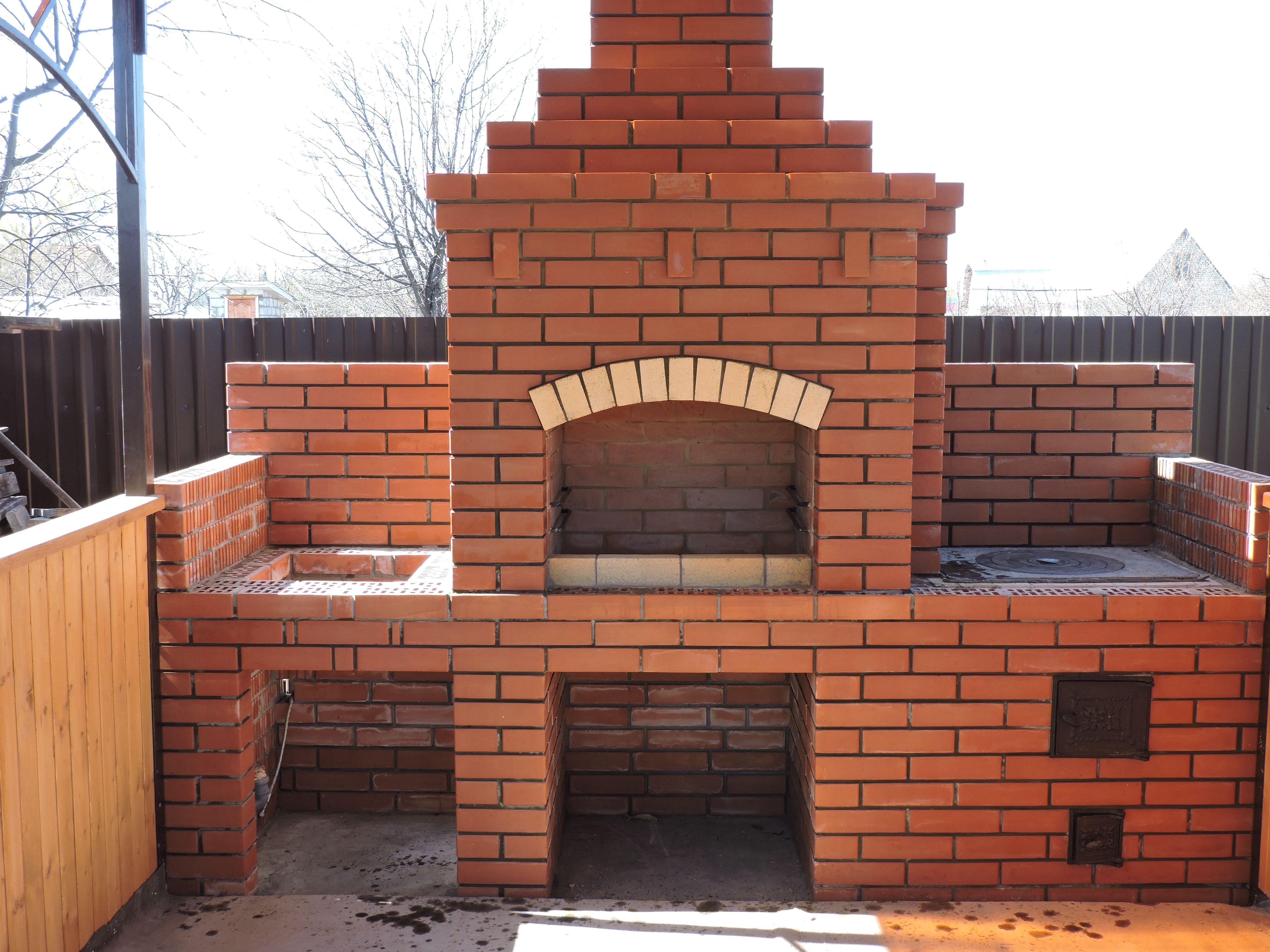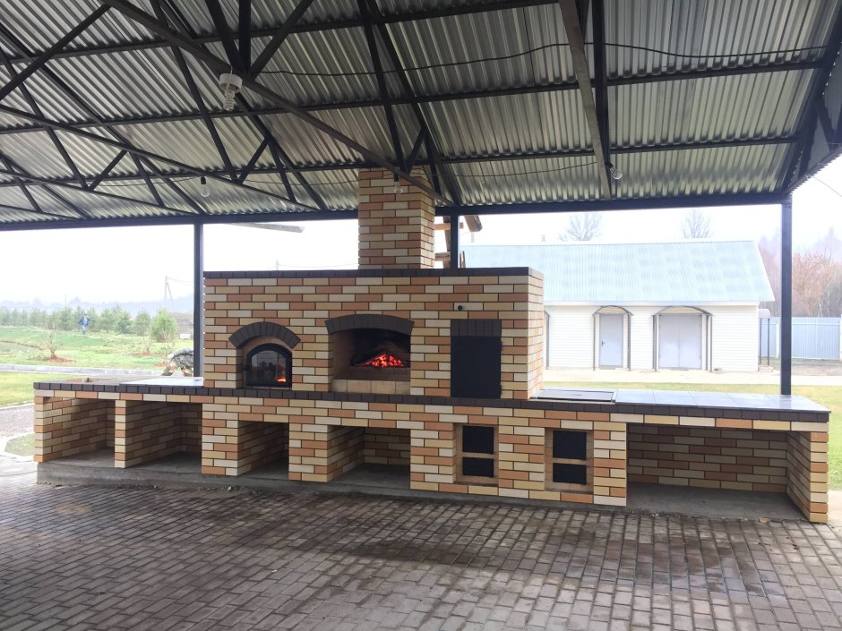 Угловой барбекю мангальная зона с коптильней и печью из кирпича