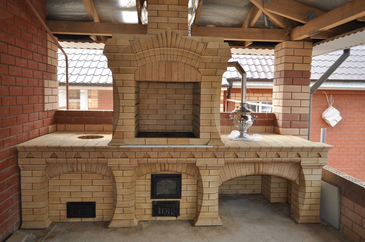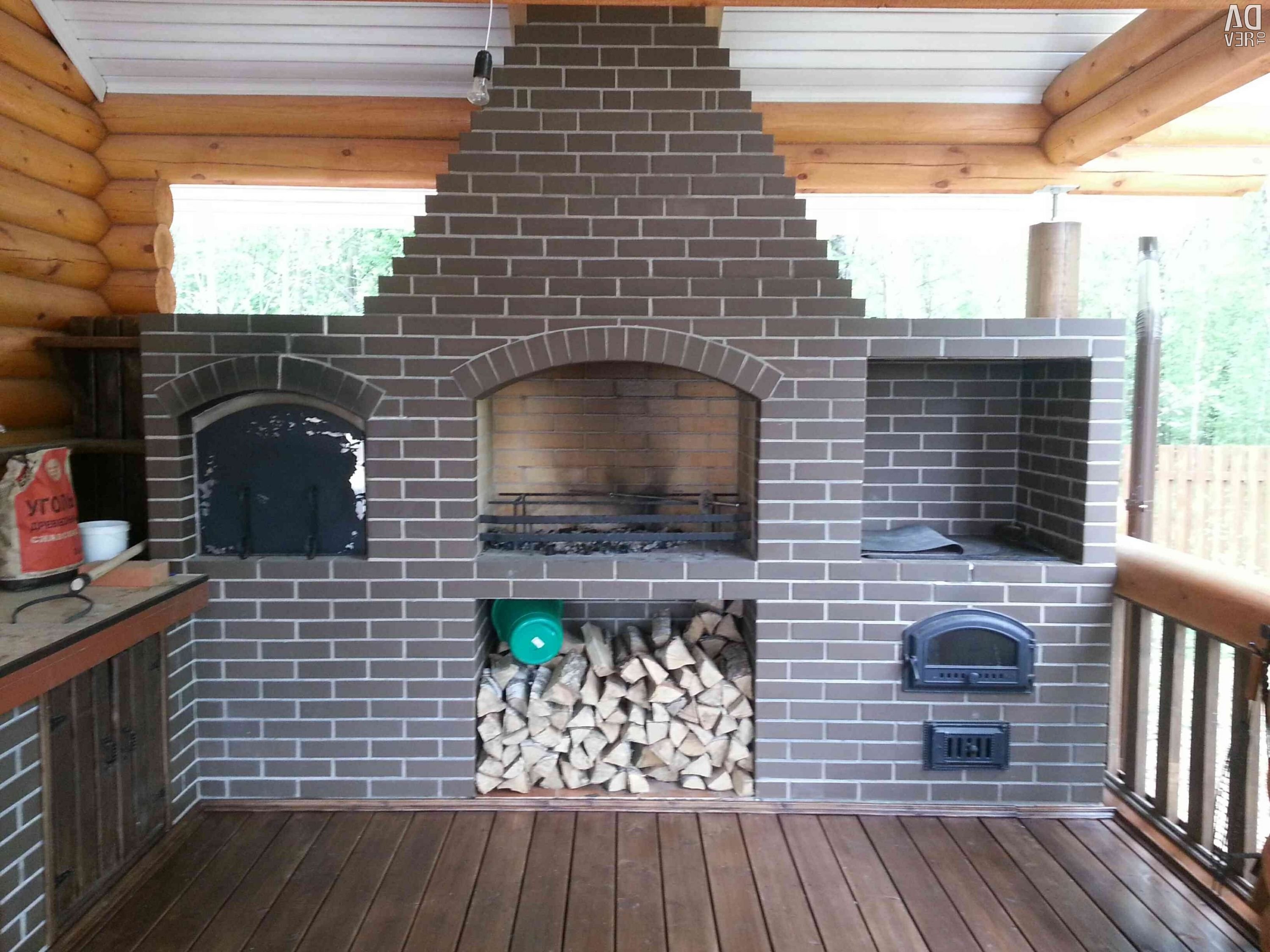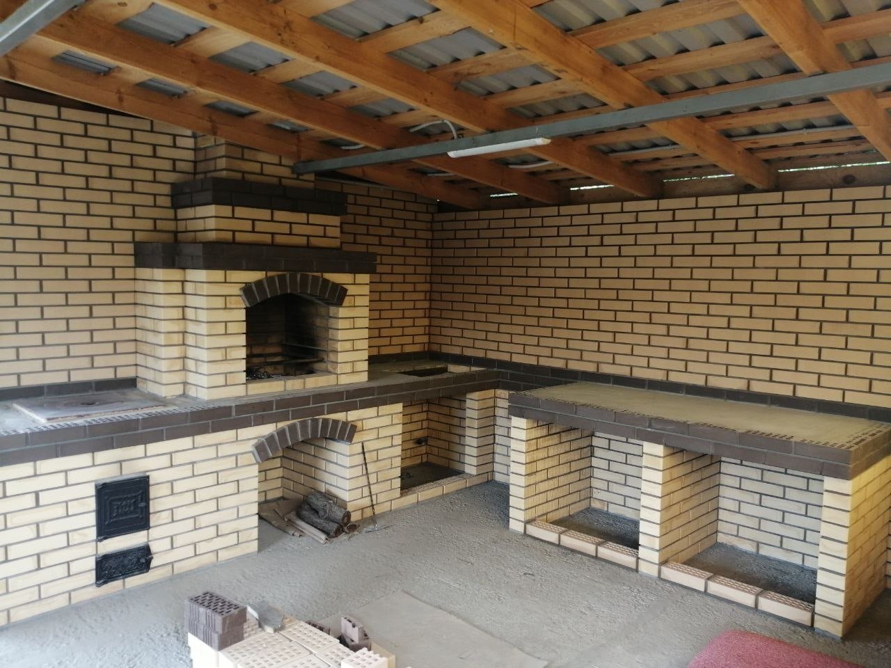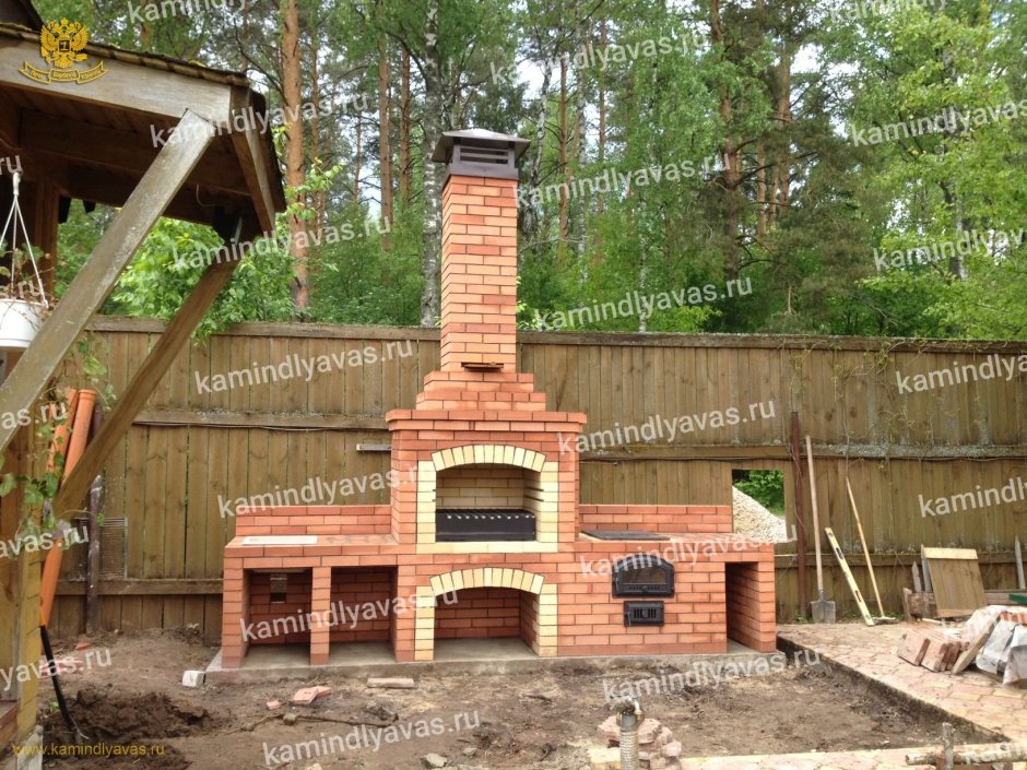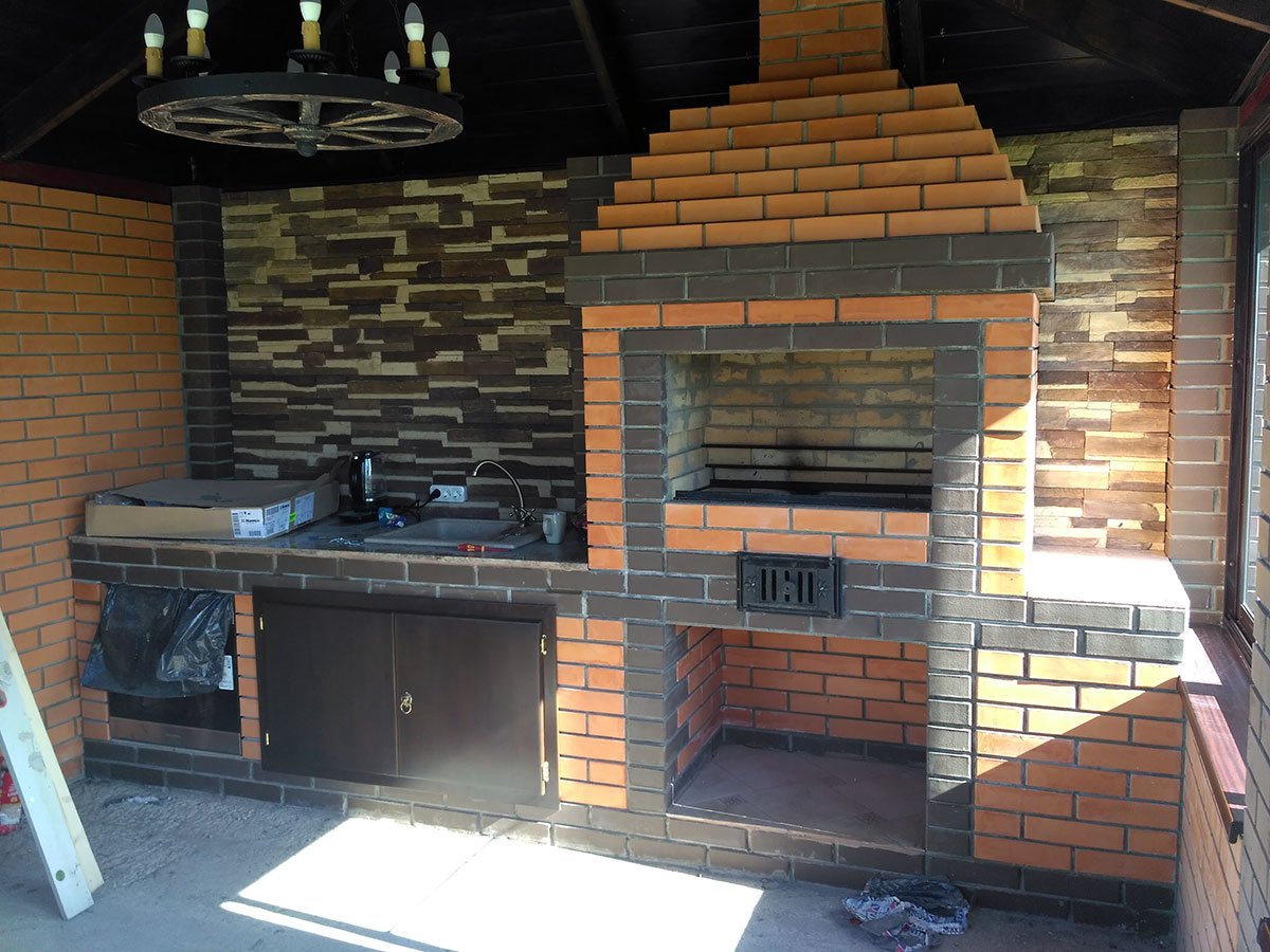Угловой барбекю мангальная зона с коптильней и печью из кирпича