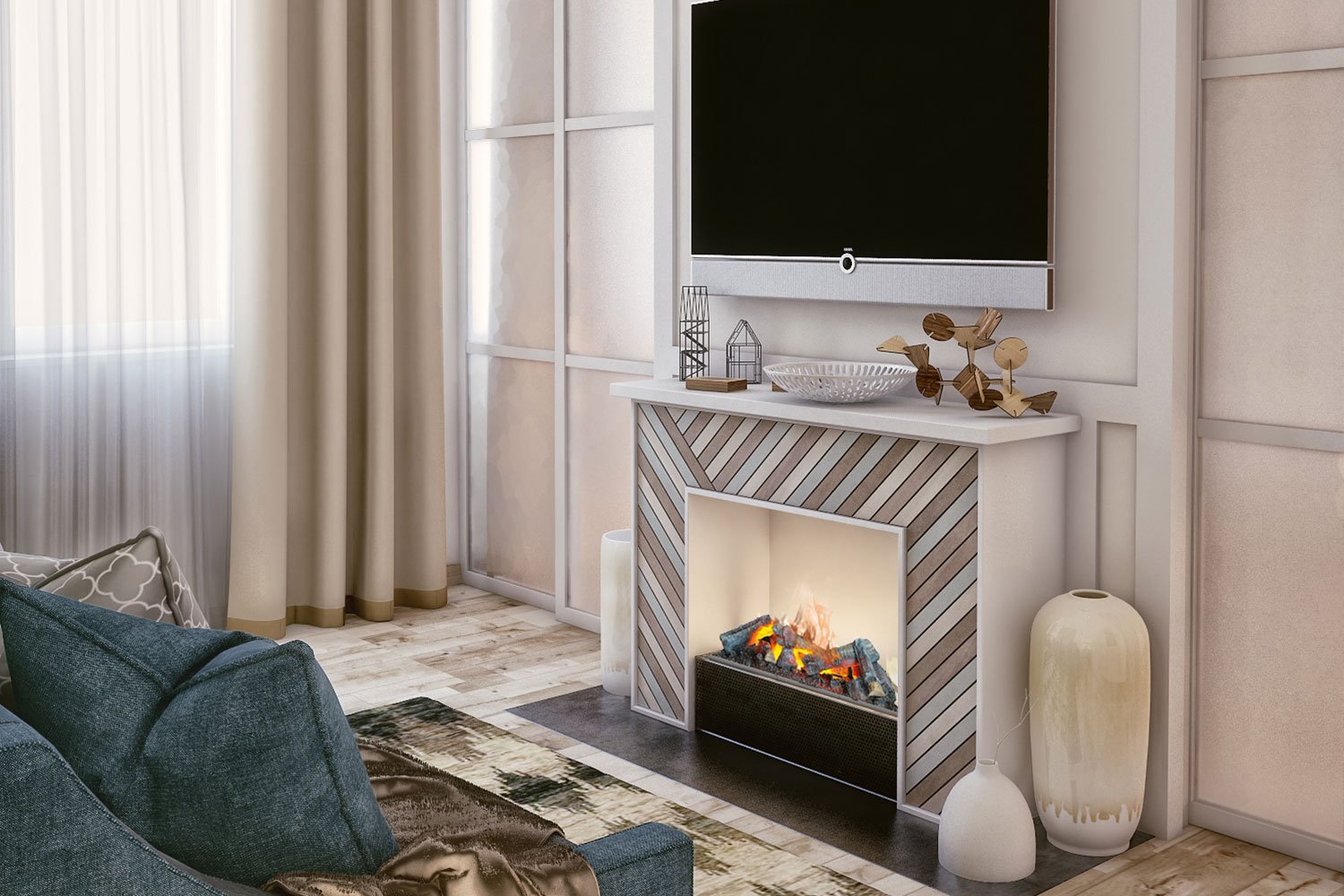 Телевизор на камине в гостиной