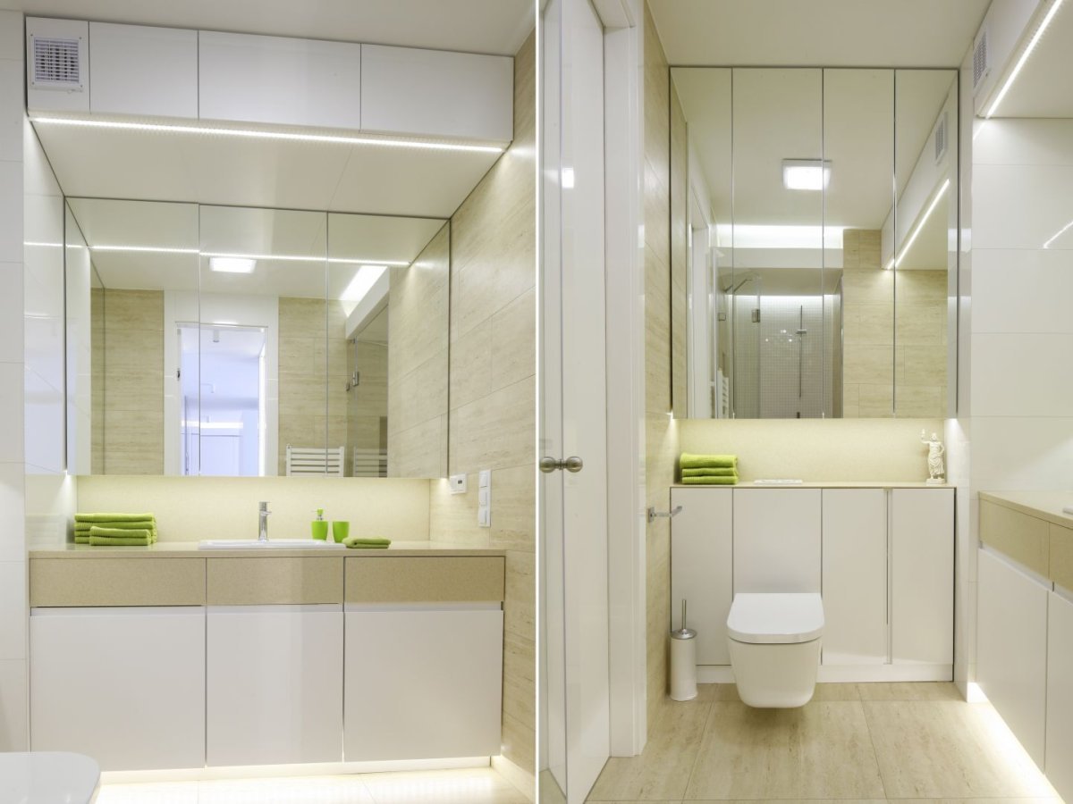 Ванная с большим зеркалом в светлых тонах
