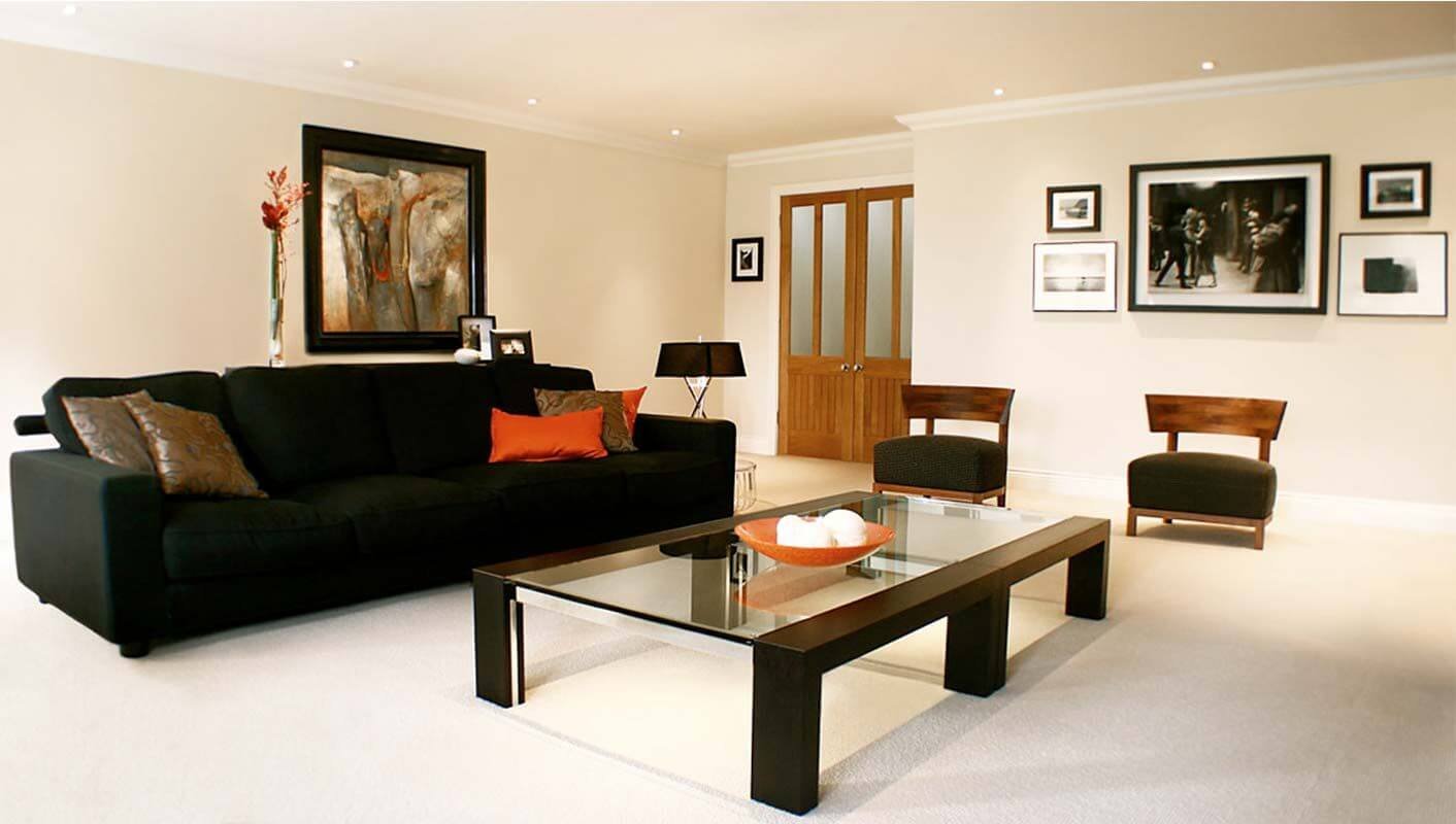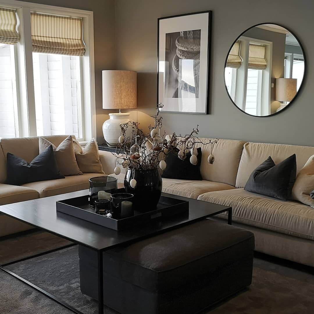 Гостиная с черным диваном