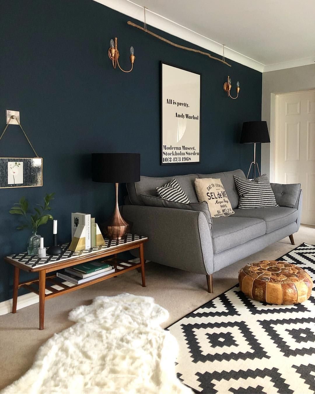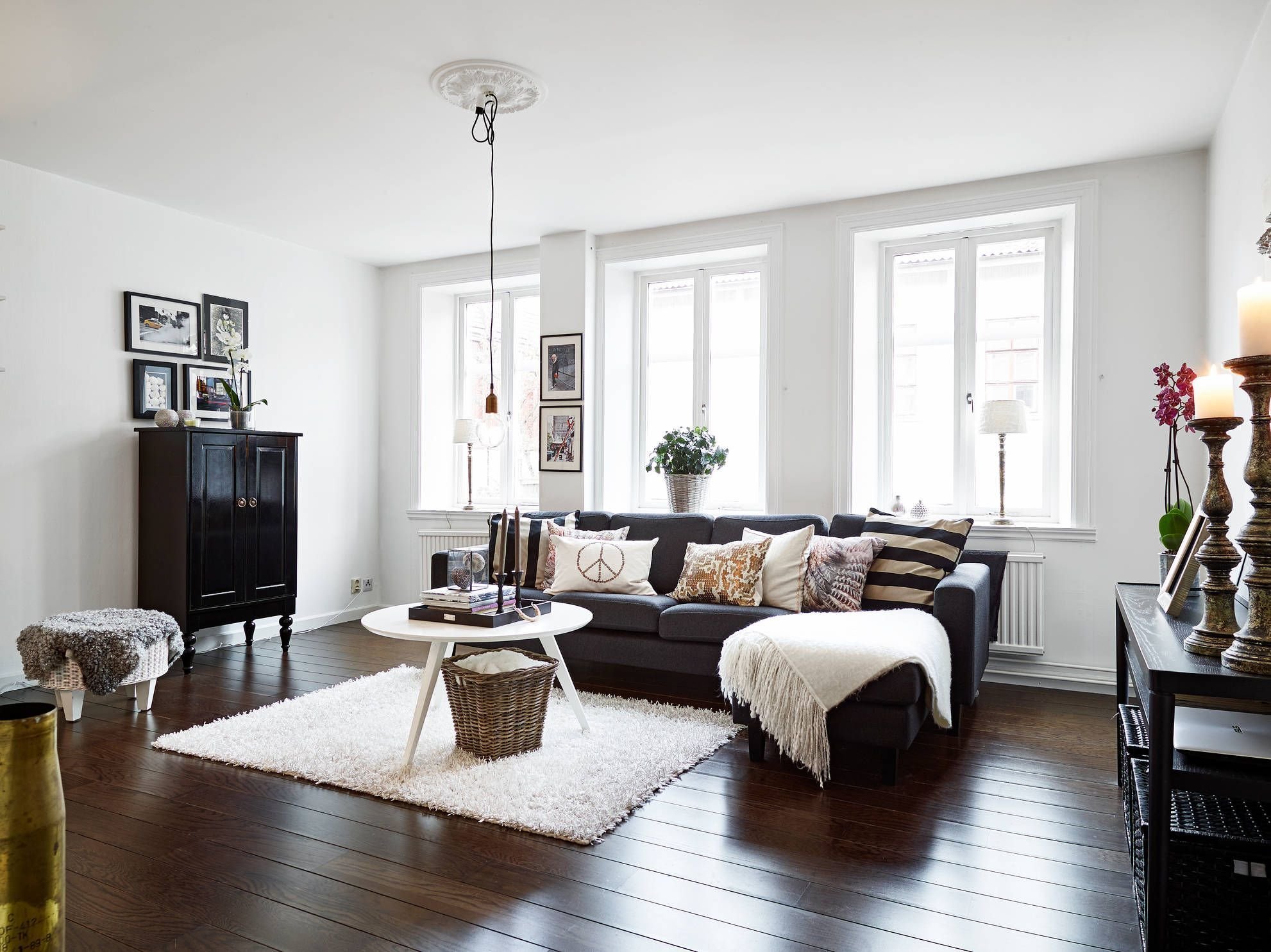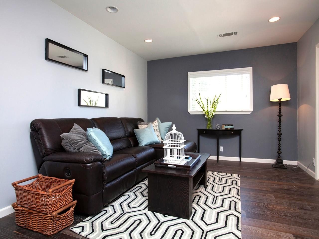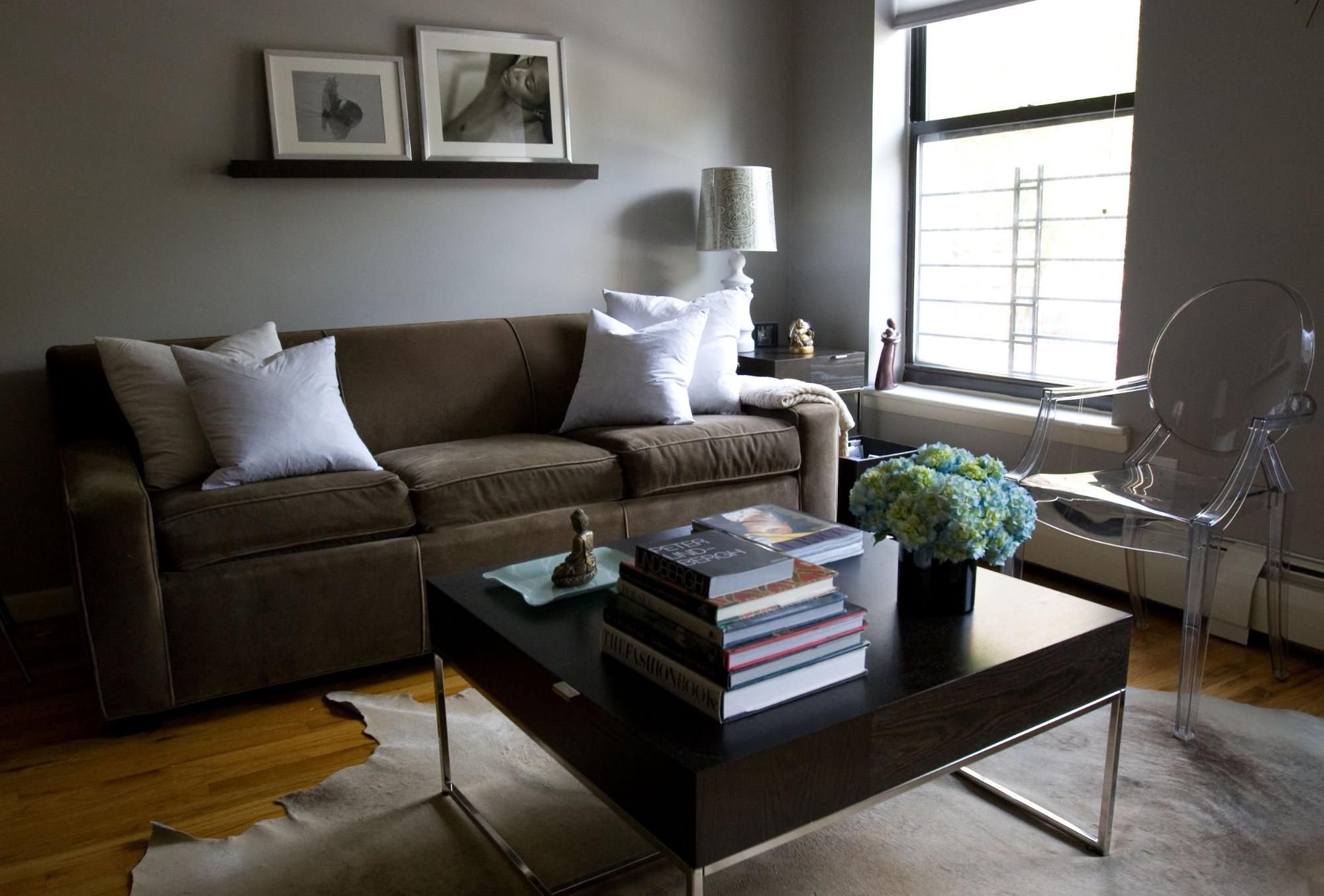 Гостиная с темным диваном