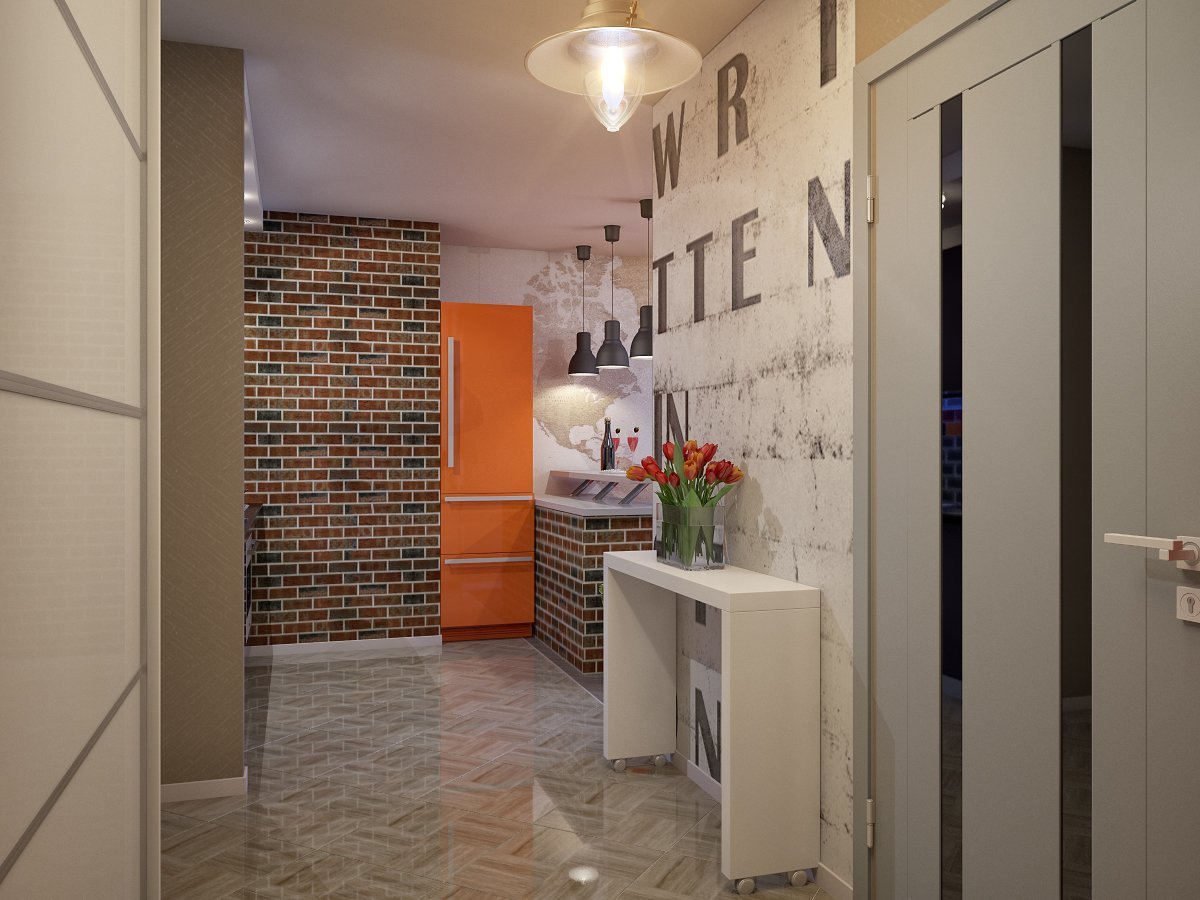 Кирпич в интерьере коридора совмещенной с кухней