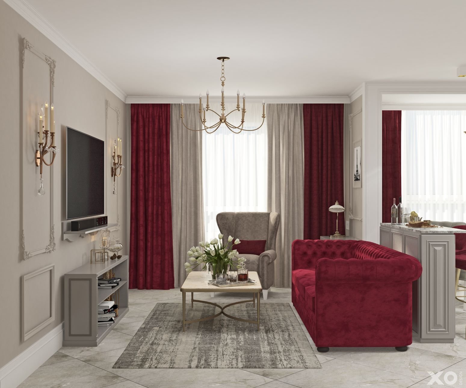 Гостиная в серо бордовых тонах