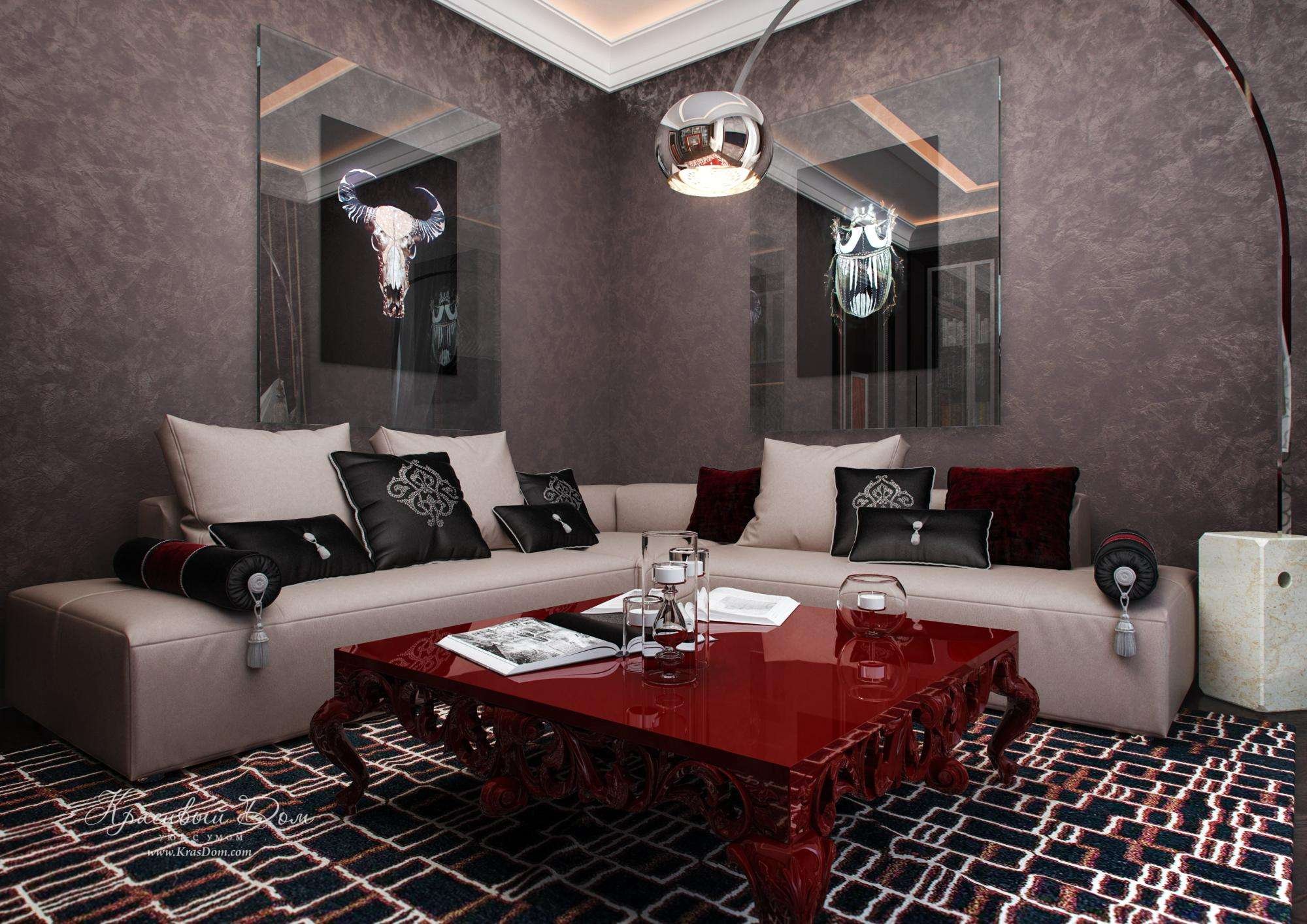 Интерьер зала в бордово серых тонах