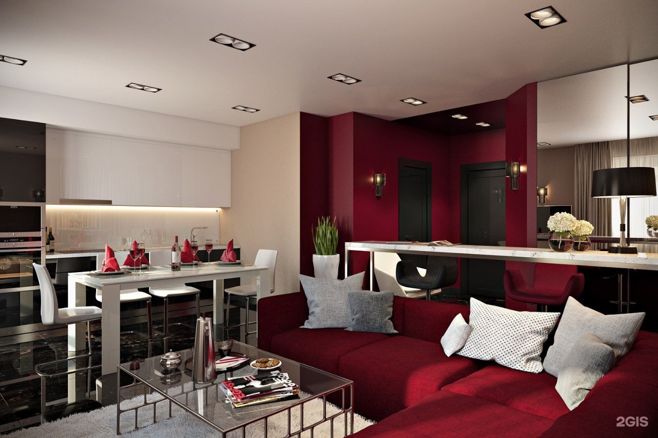 Кухня гостиная с бордовой кухней