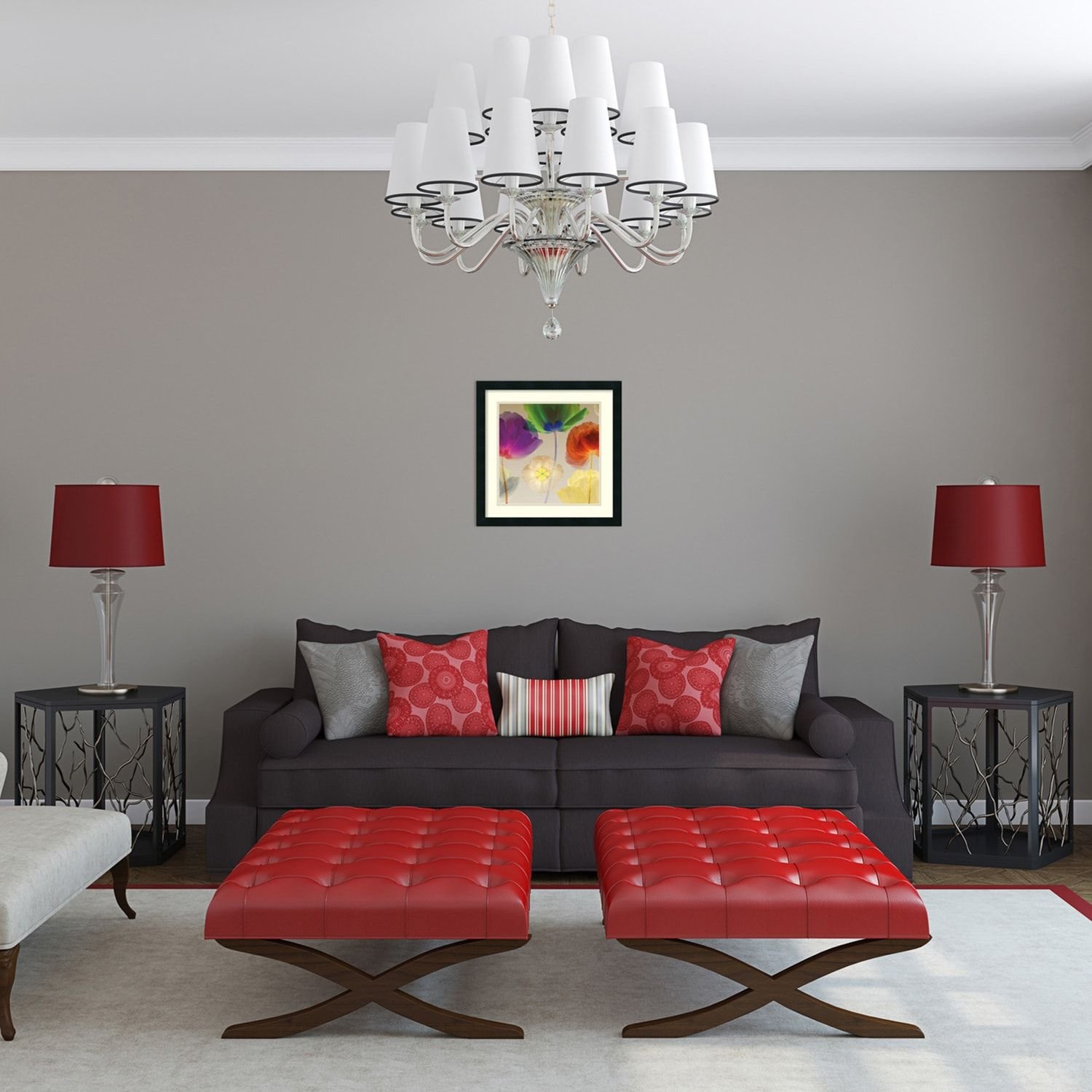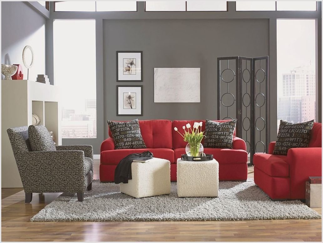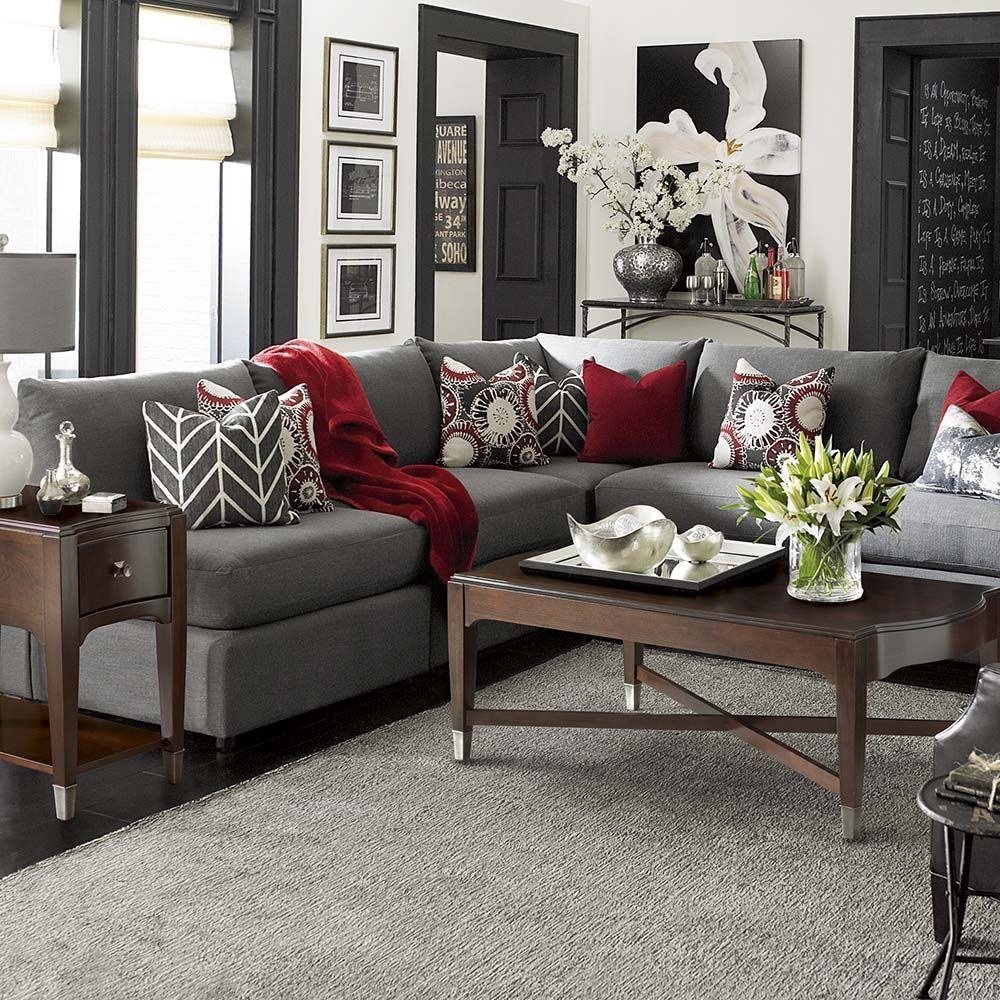 Серый диван с красными подушками