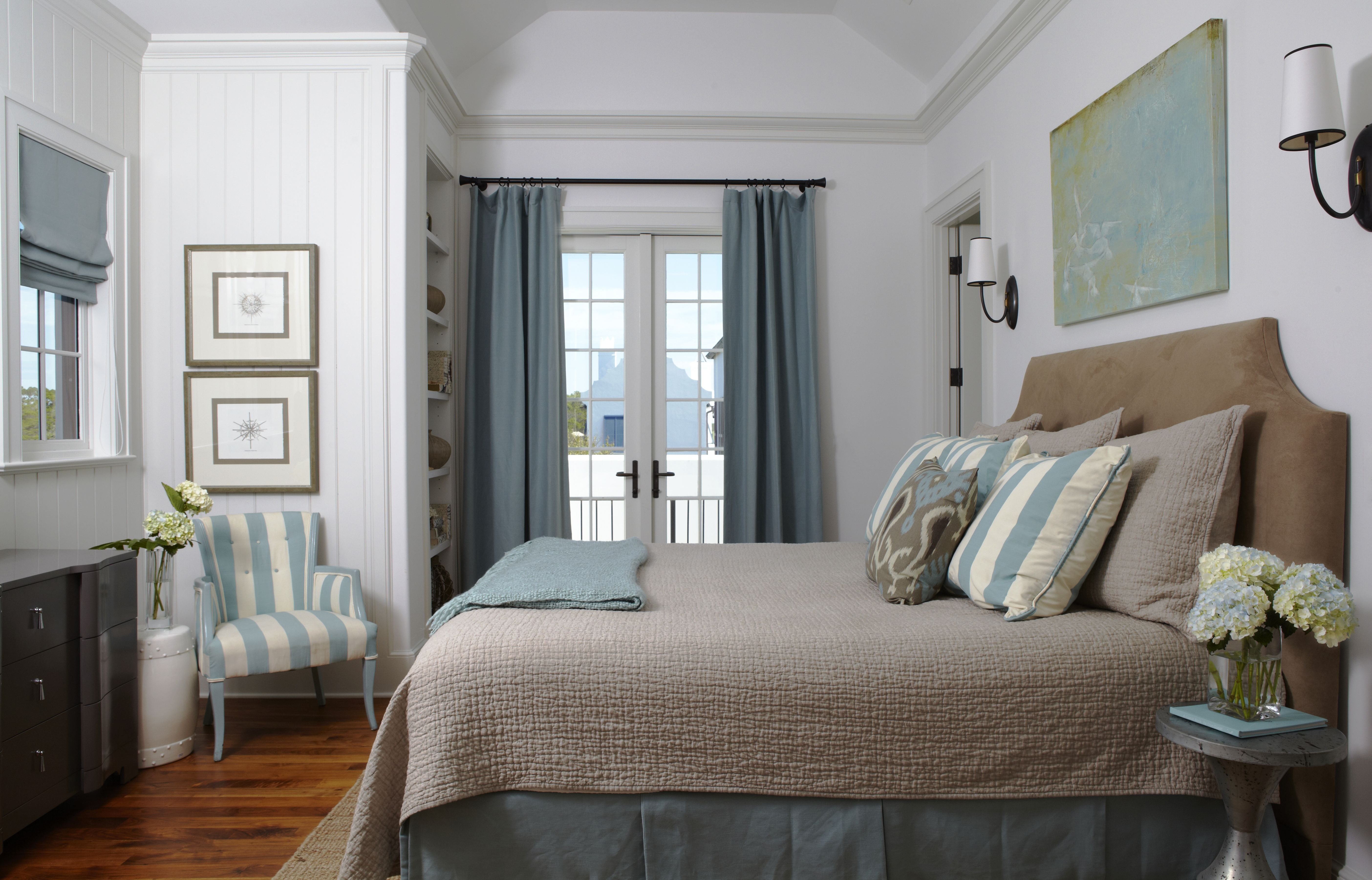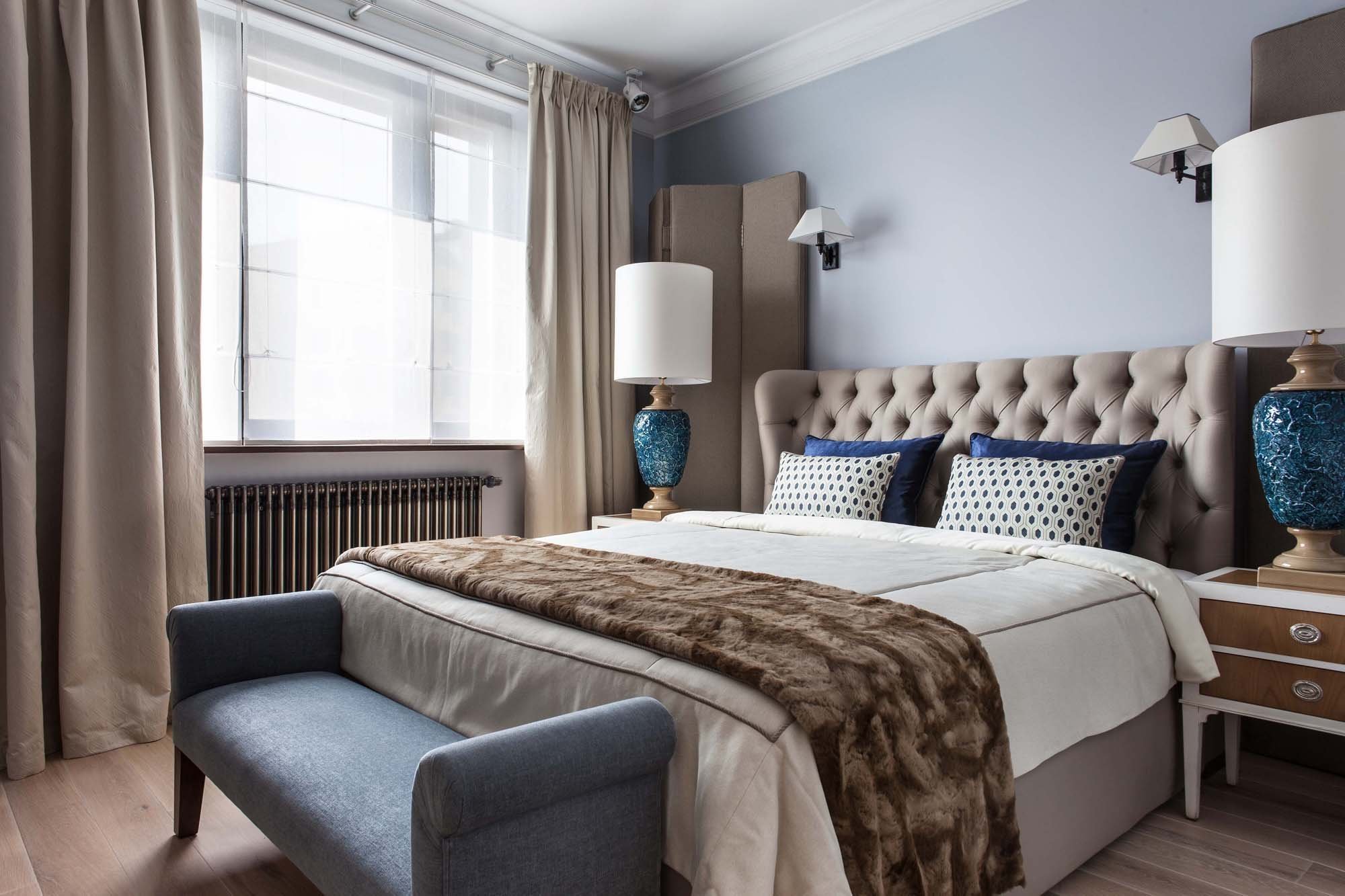Сочетание бежевого и голубого в интерьере спальни