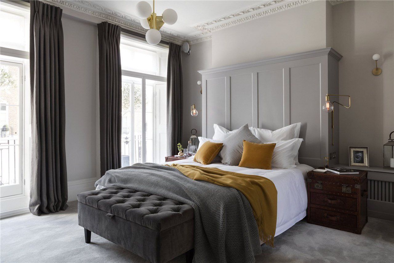 Современная классика в спальне серая