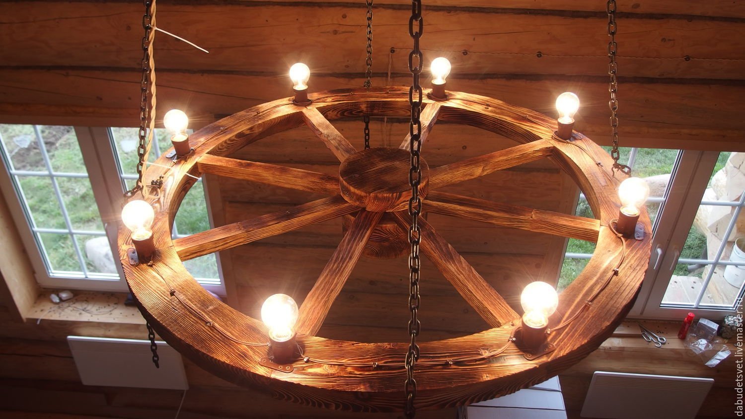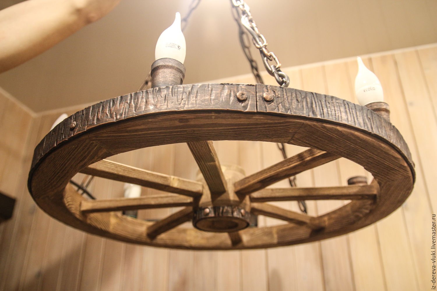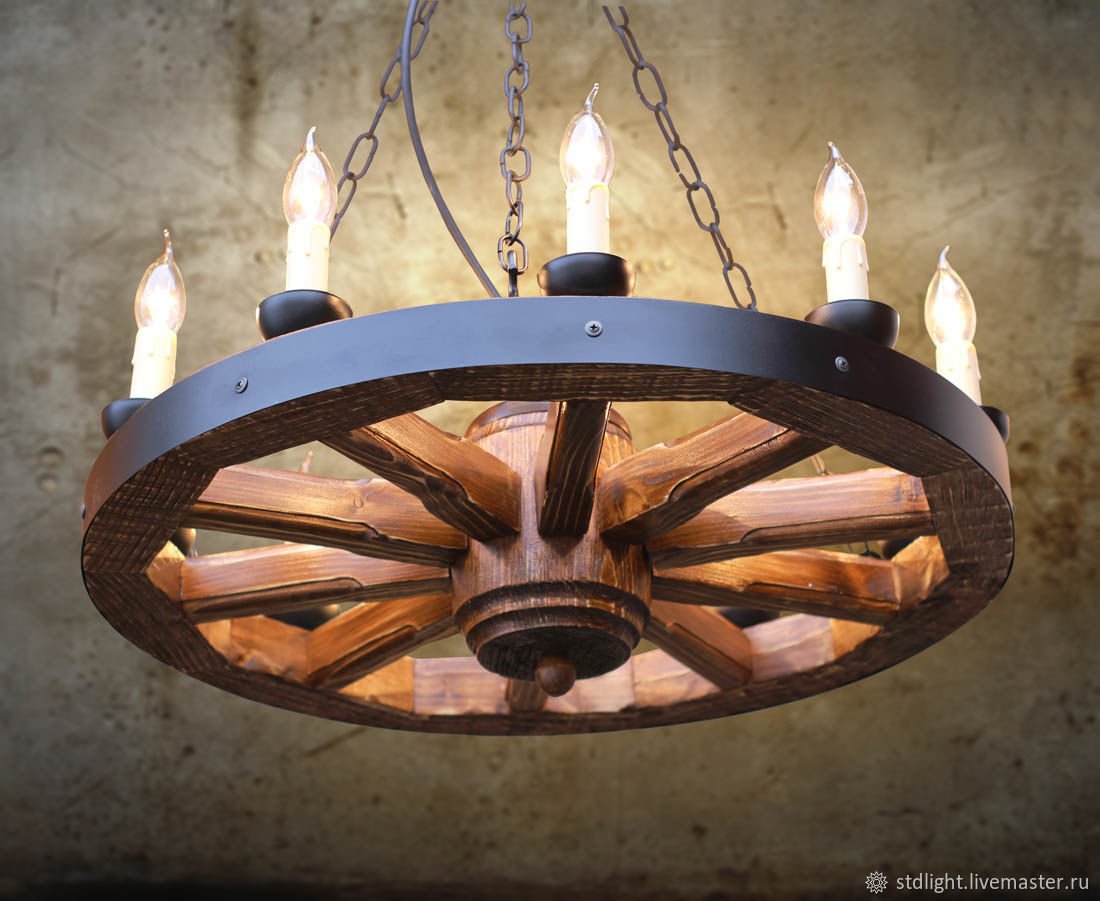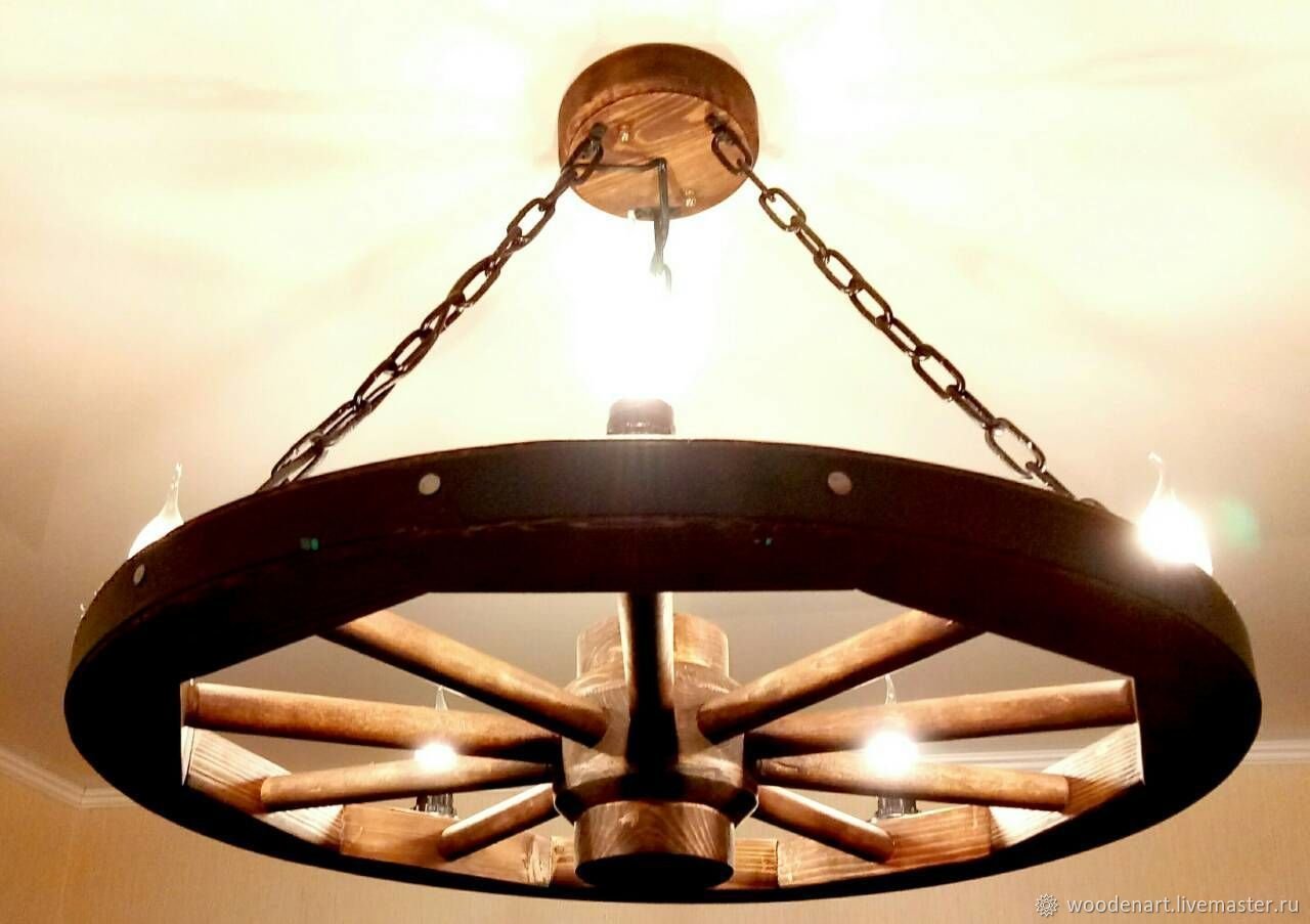 Люстра из деревянного колеса от телеги