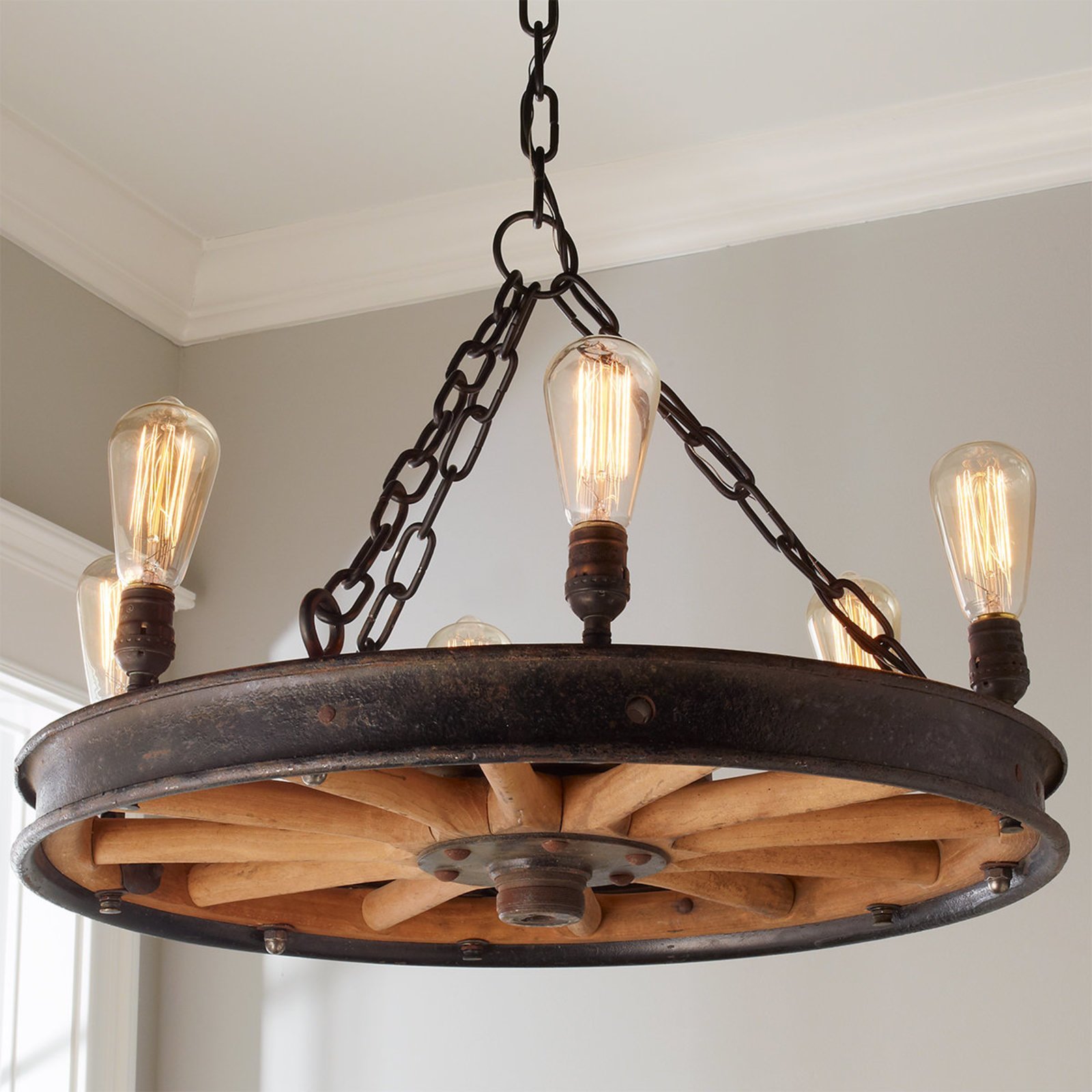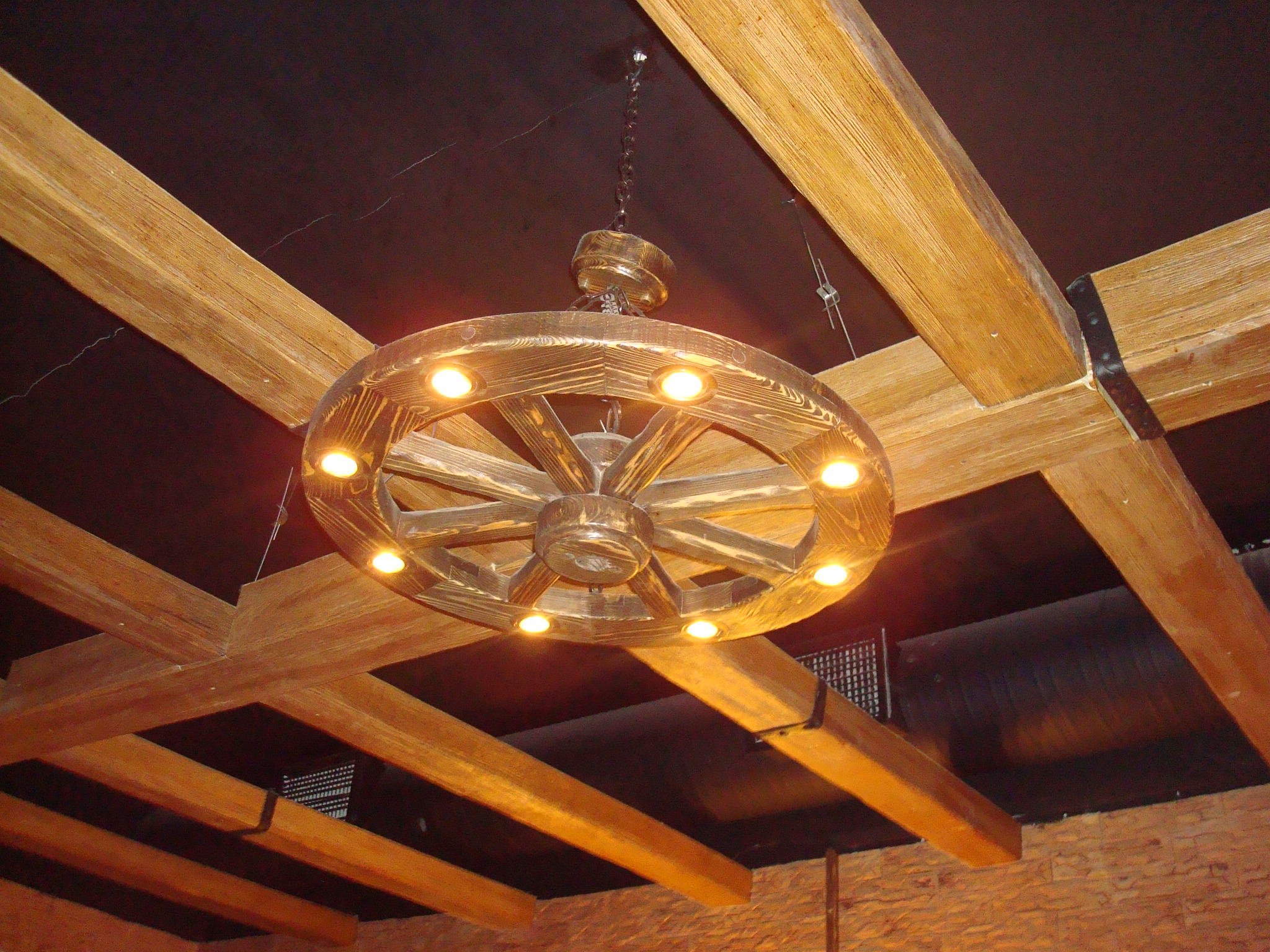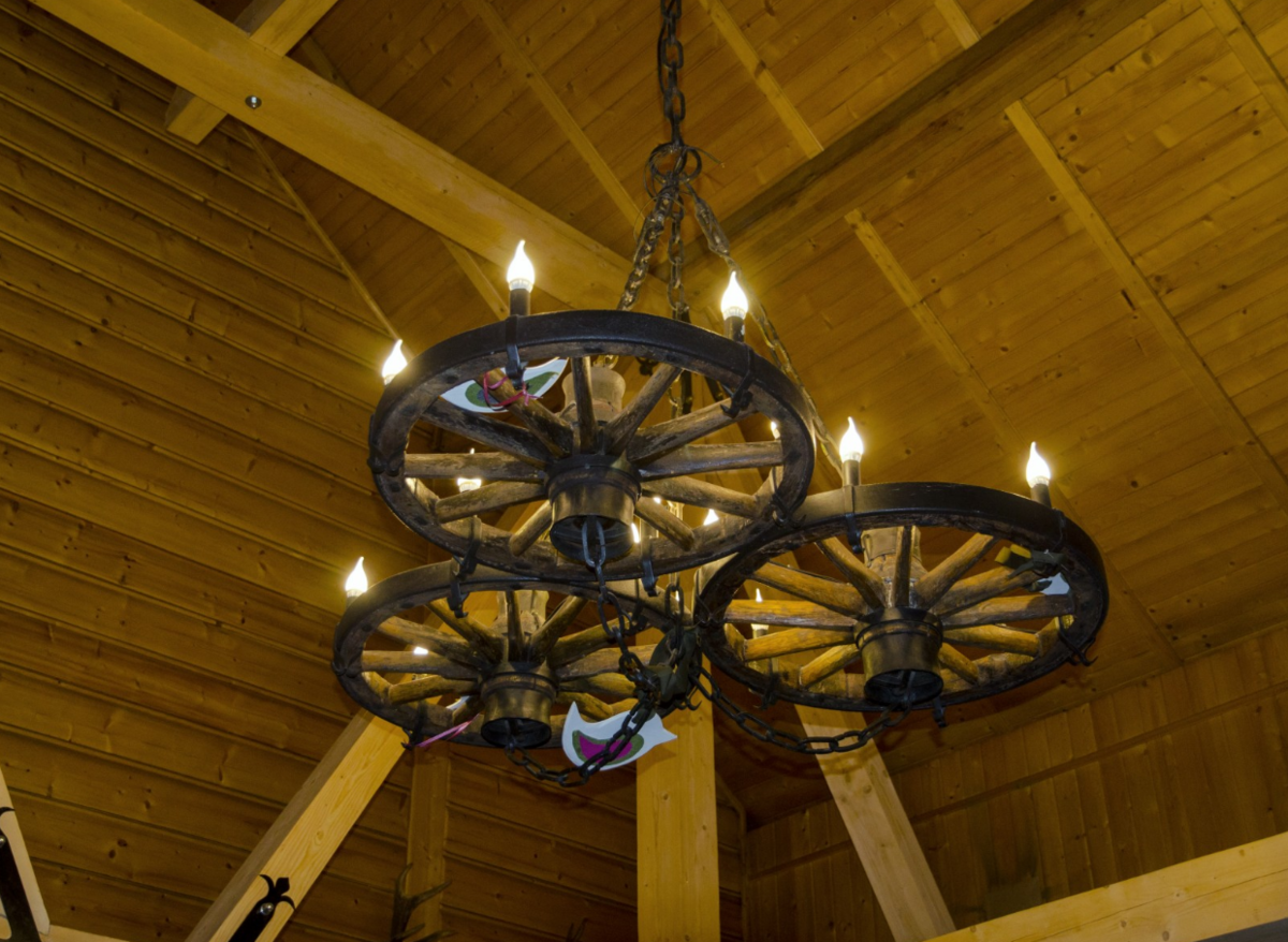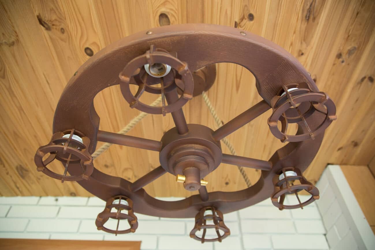 Люстра колесо в интерьере дачного дома