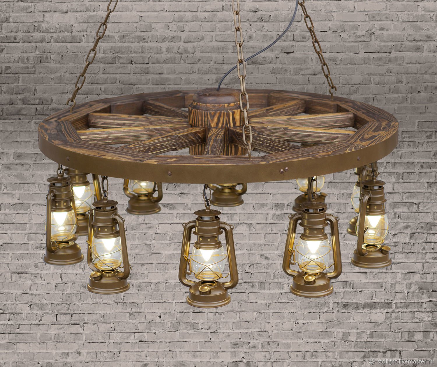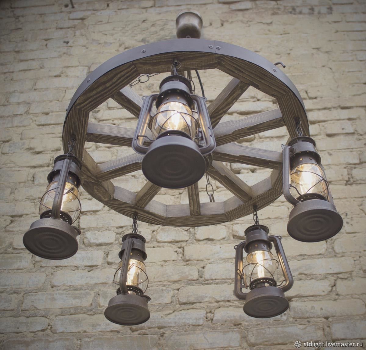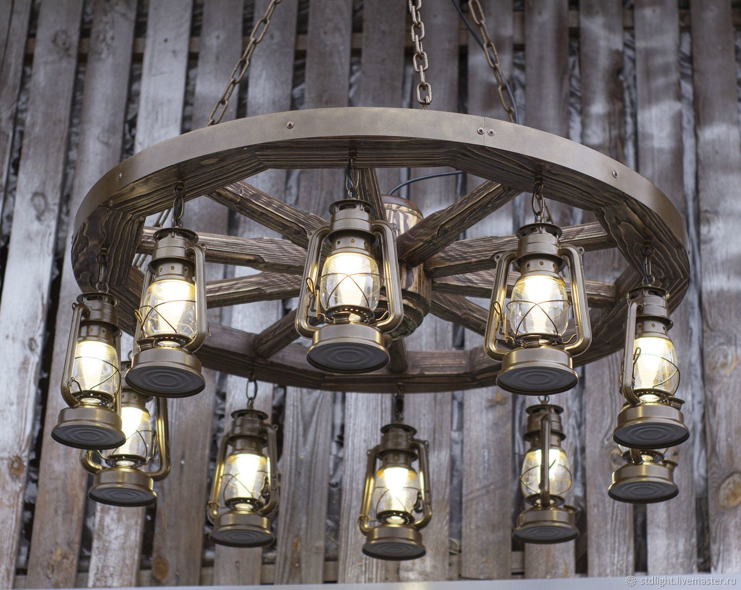 Люстра колесо от телеги с керосинками