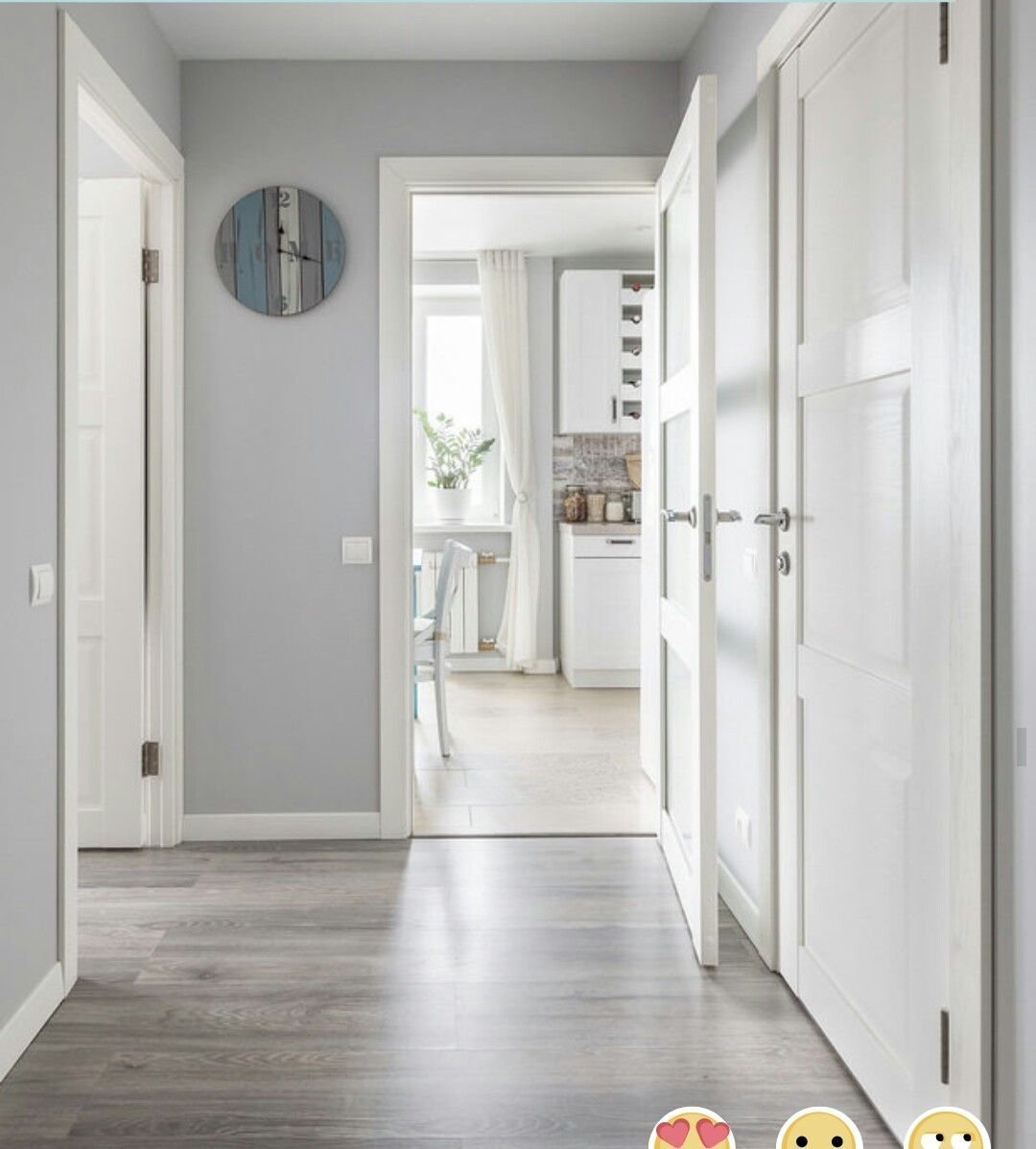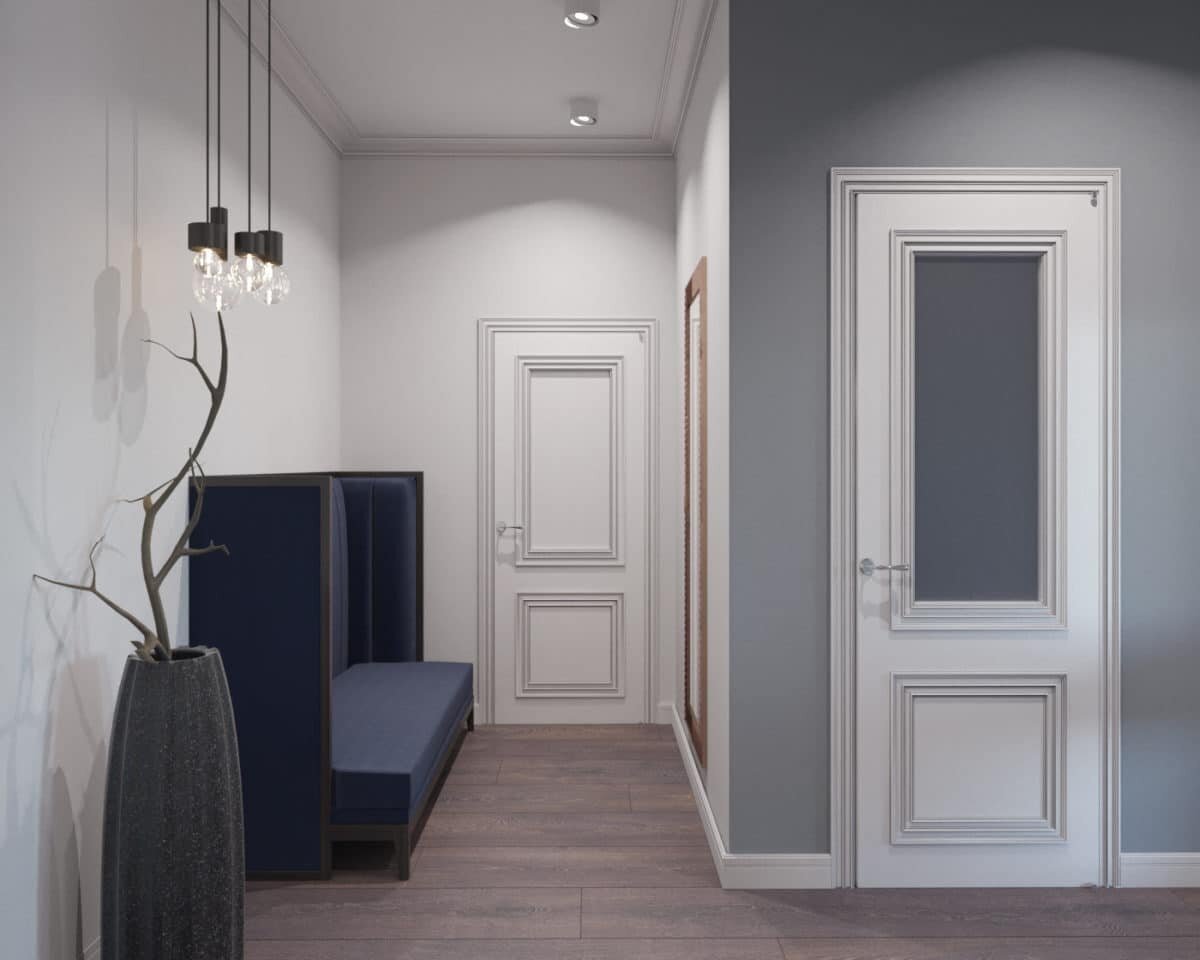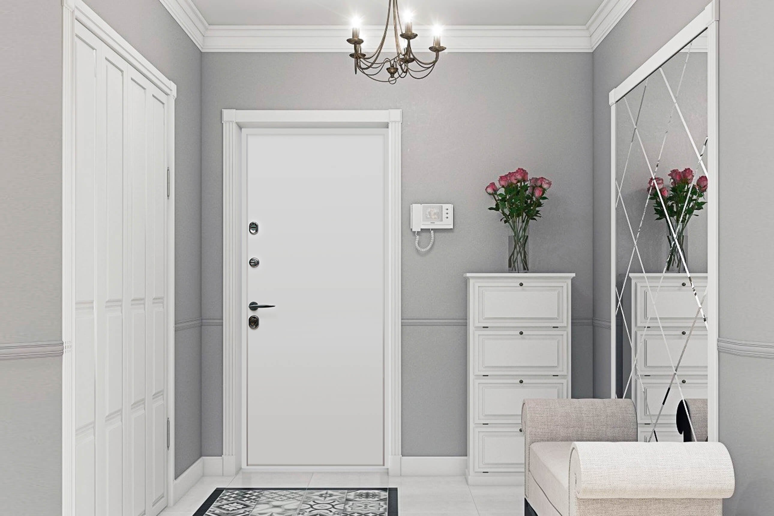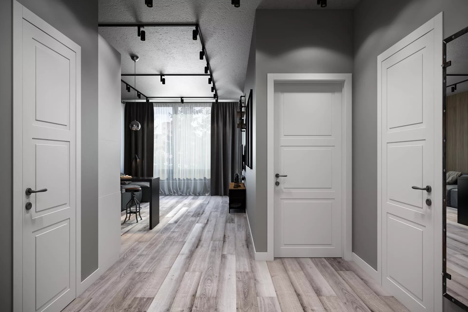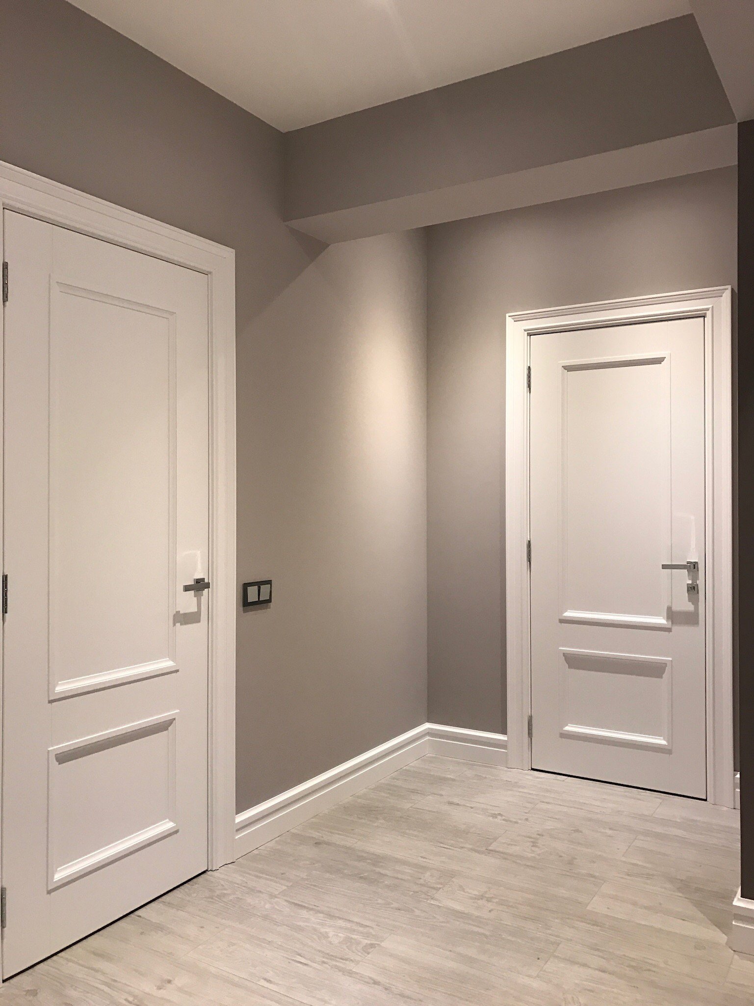 Интерьер в серых тонах с белыми плинтусами и дверями