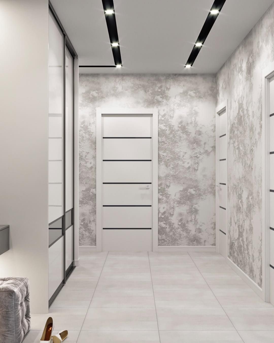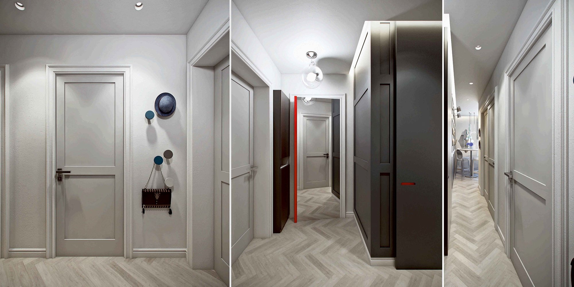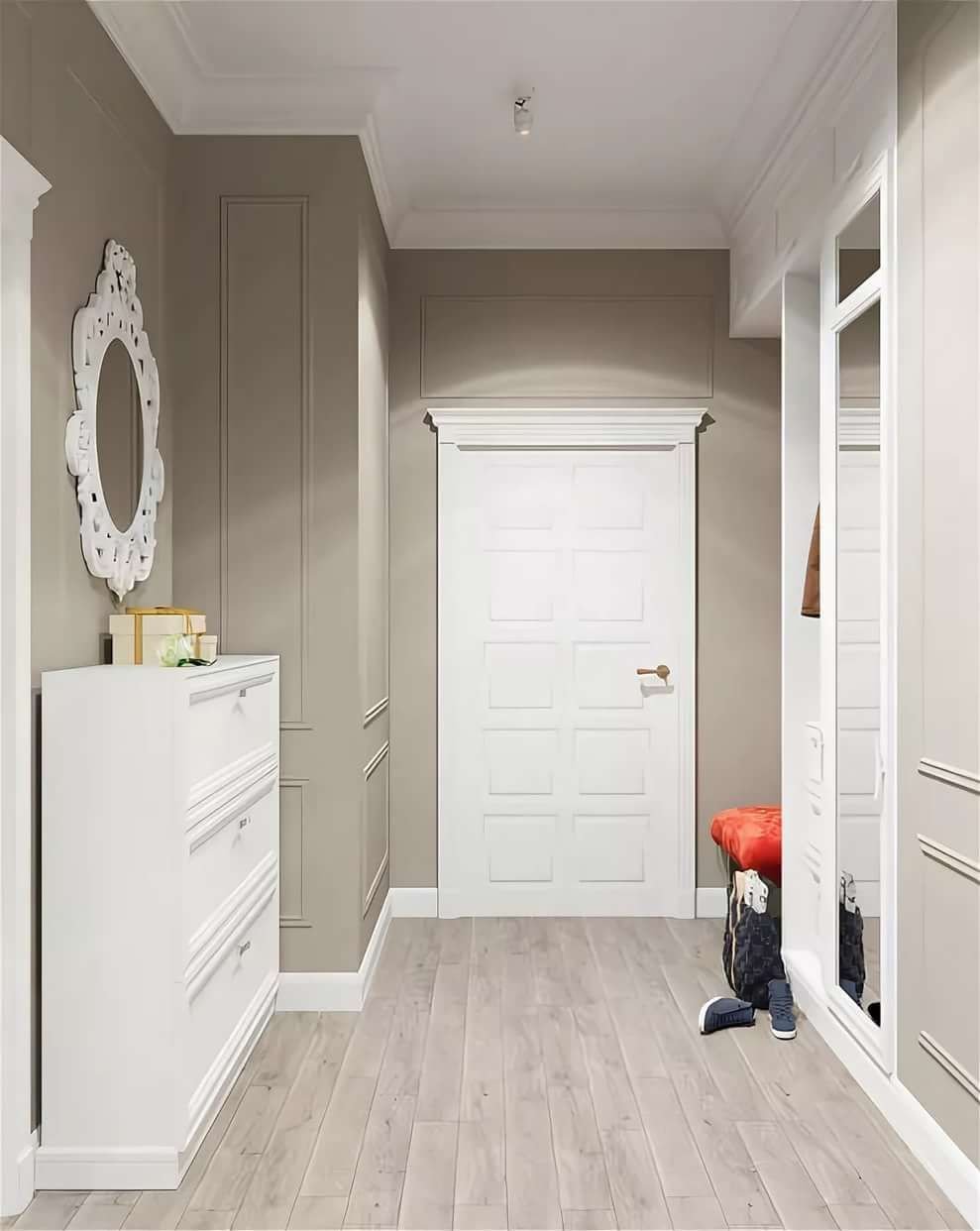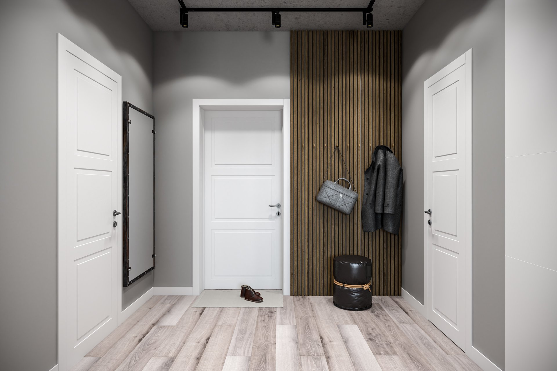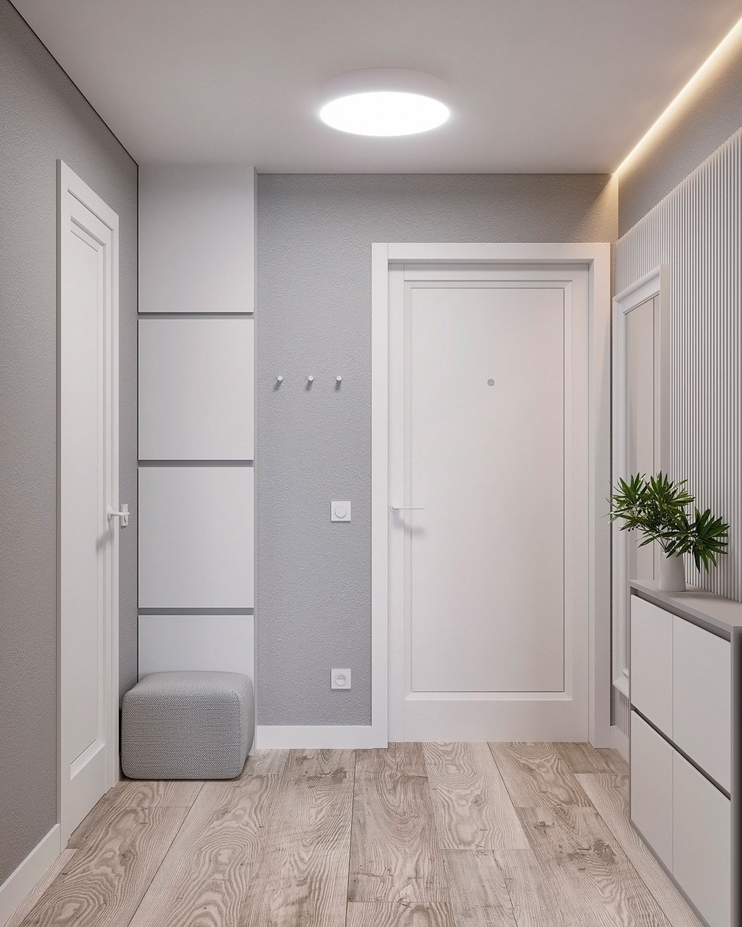 Интерьер в серых тонах с белыми плинтусами и дверями